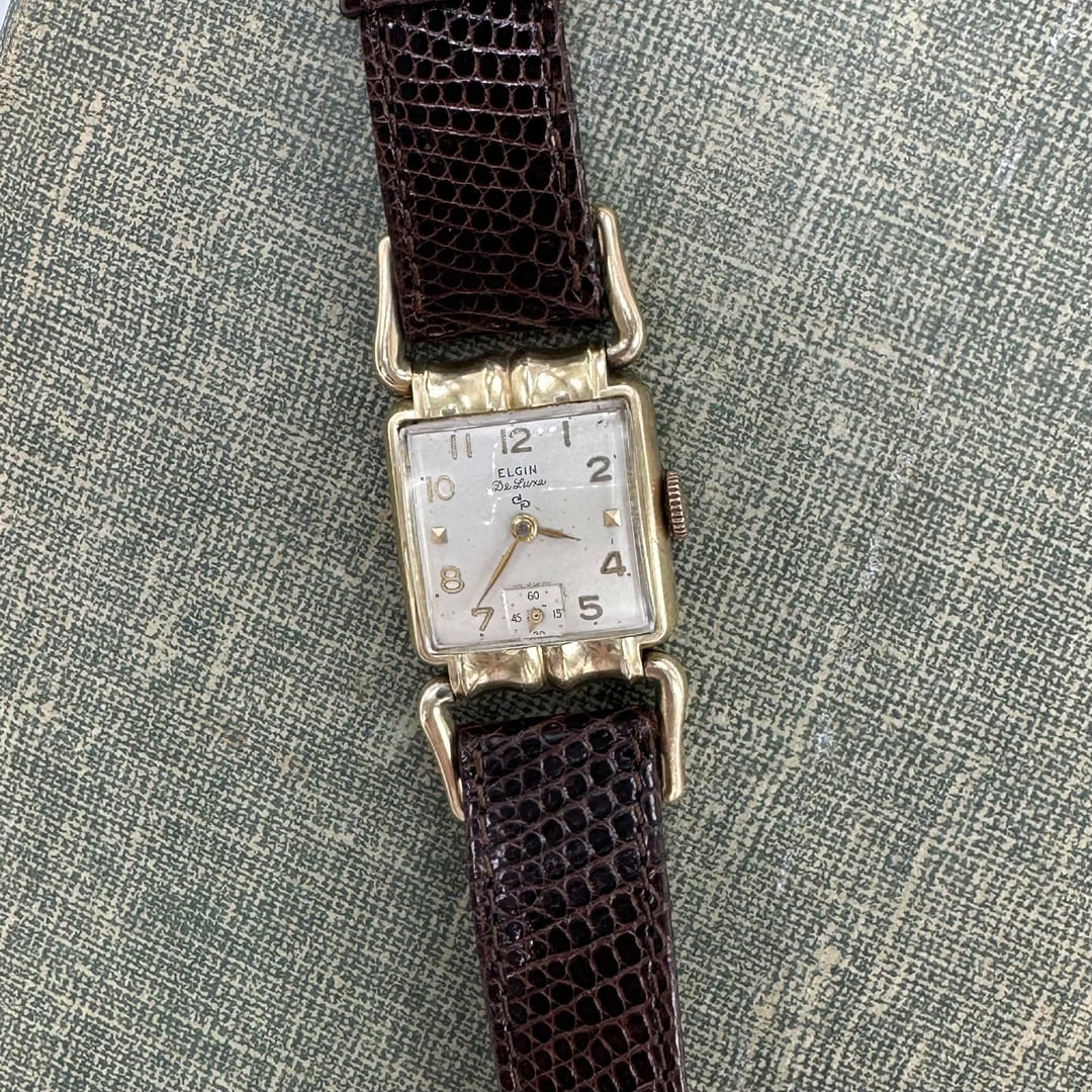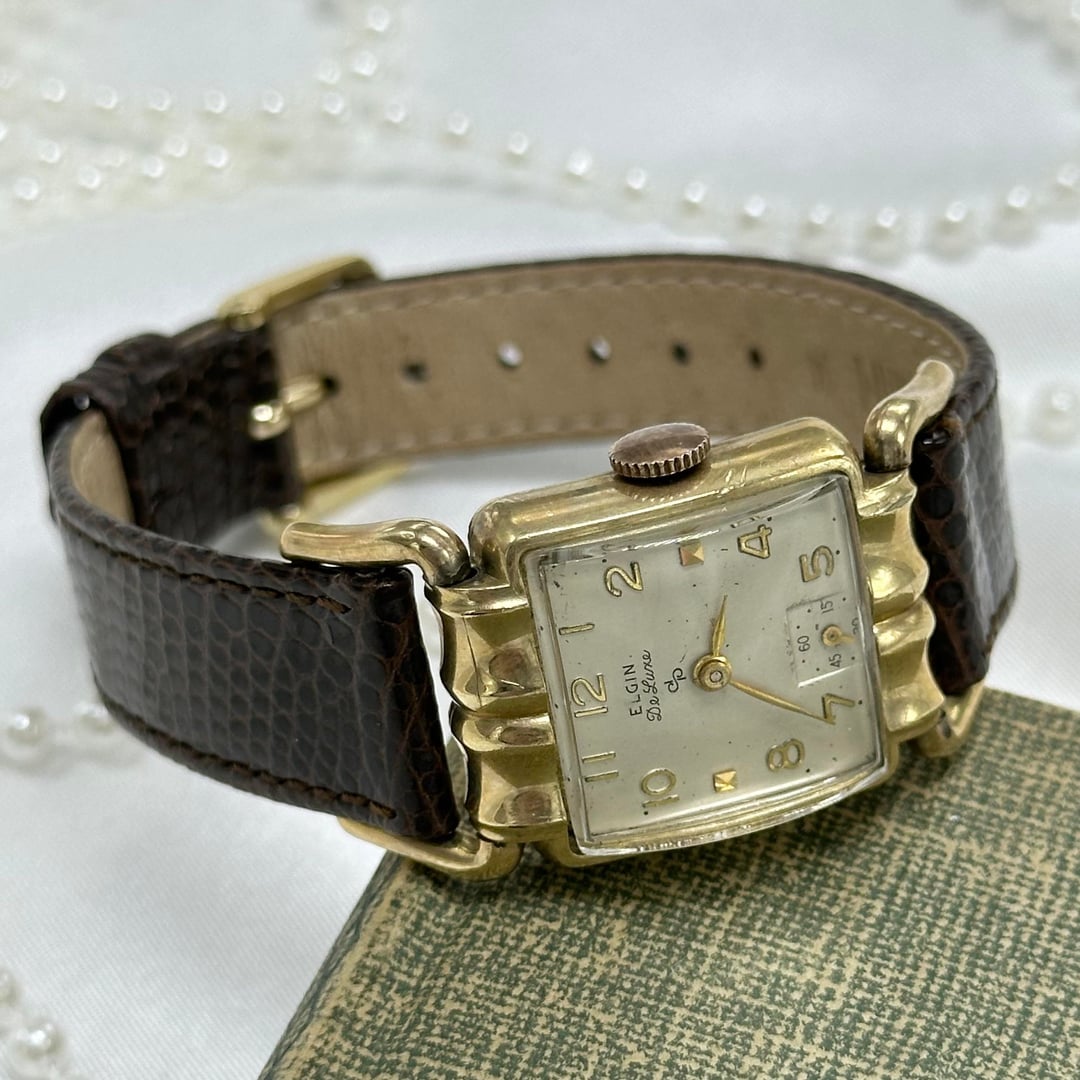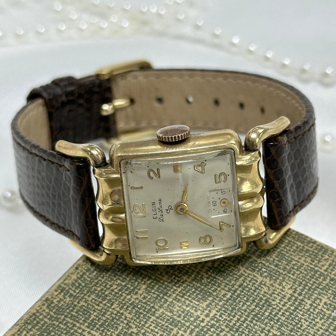 Vintage 10k gold filled manual winding Elgin De Luxe 17 jewels watch with brown leather band and unique square dial from the 1950's. Length: 8 inches Condition: Pre-owned, Running Cleaned and disinfected. $300