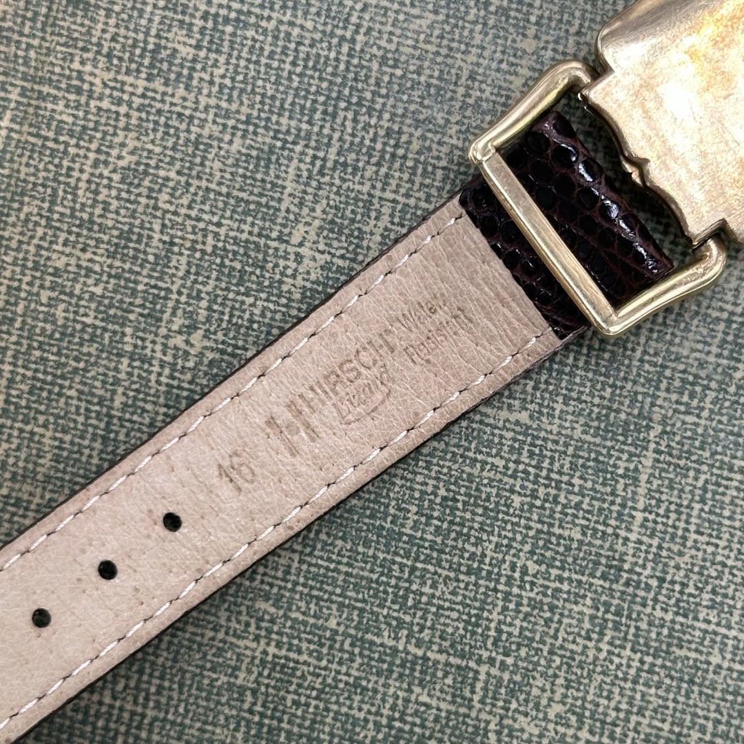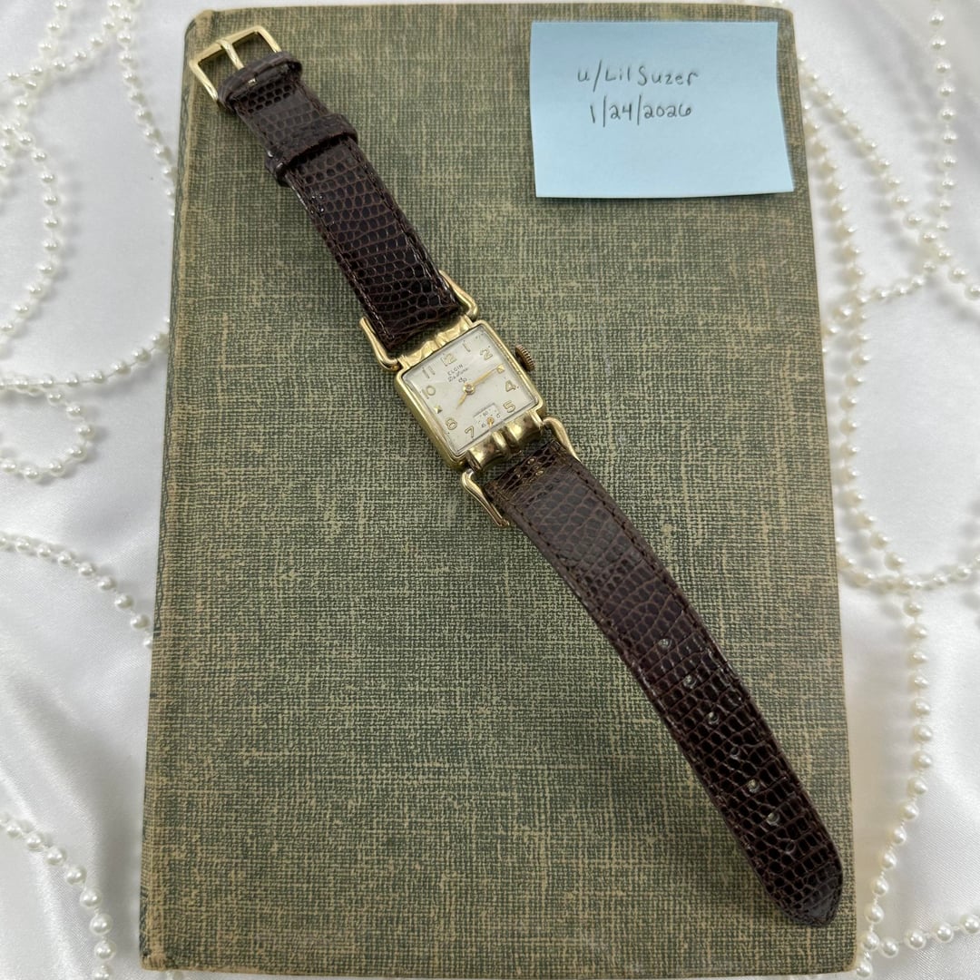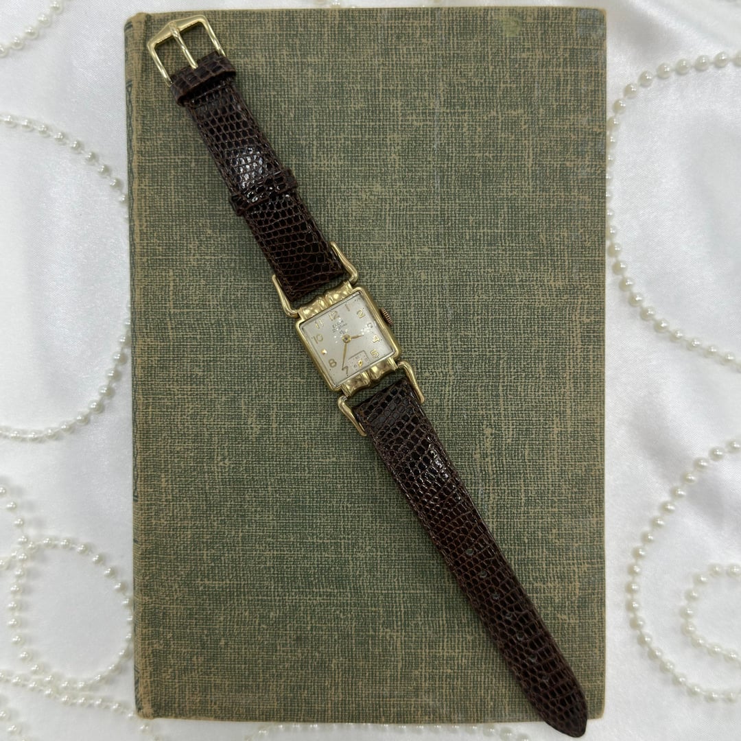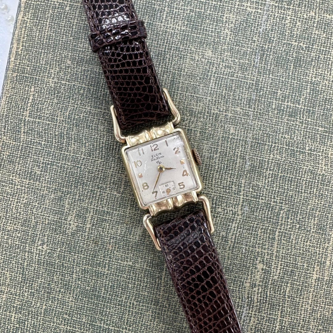 Vintage 10k gold filled manual winding Elgin De Luxe 17 jewels watch with brown leather band and unique square dial from the 1950's. Length: 8 inches Condition: Pre-owned, Running Cleaned and disinfected. $300