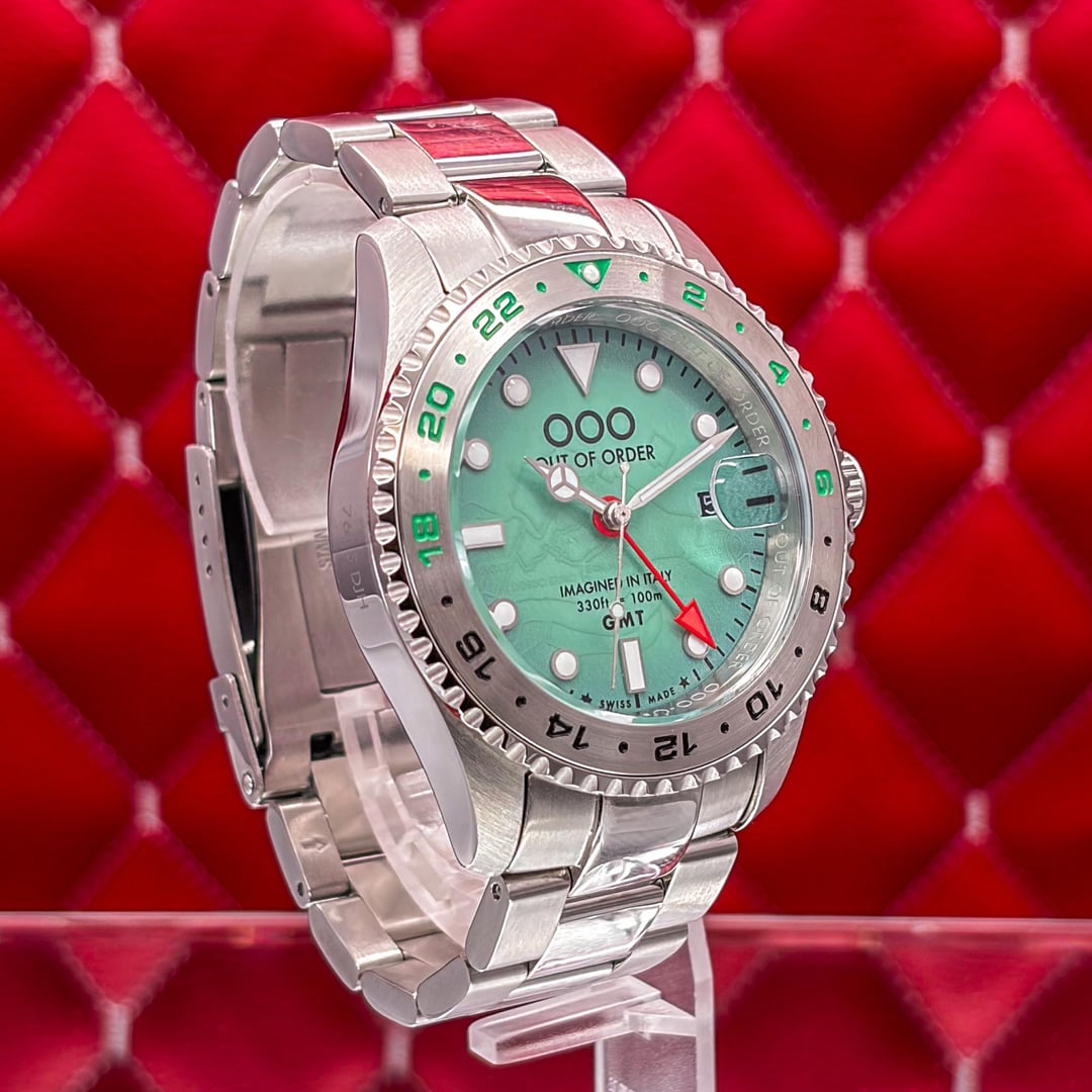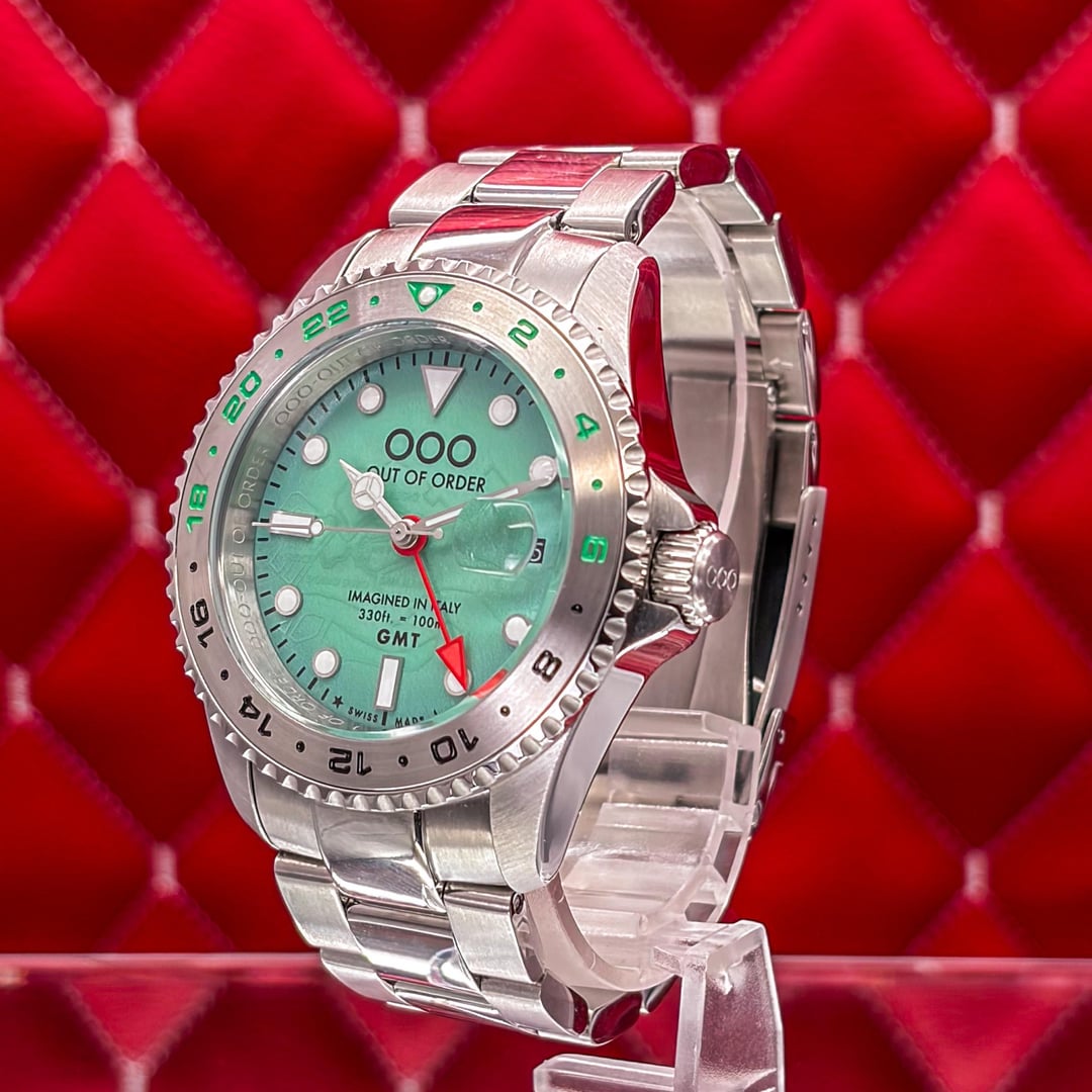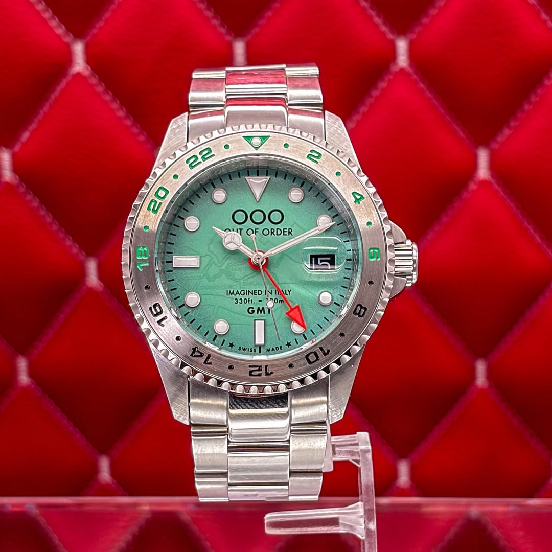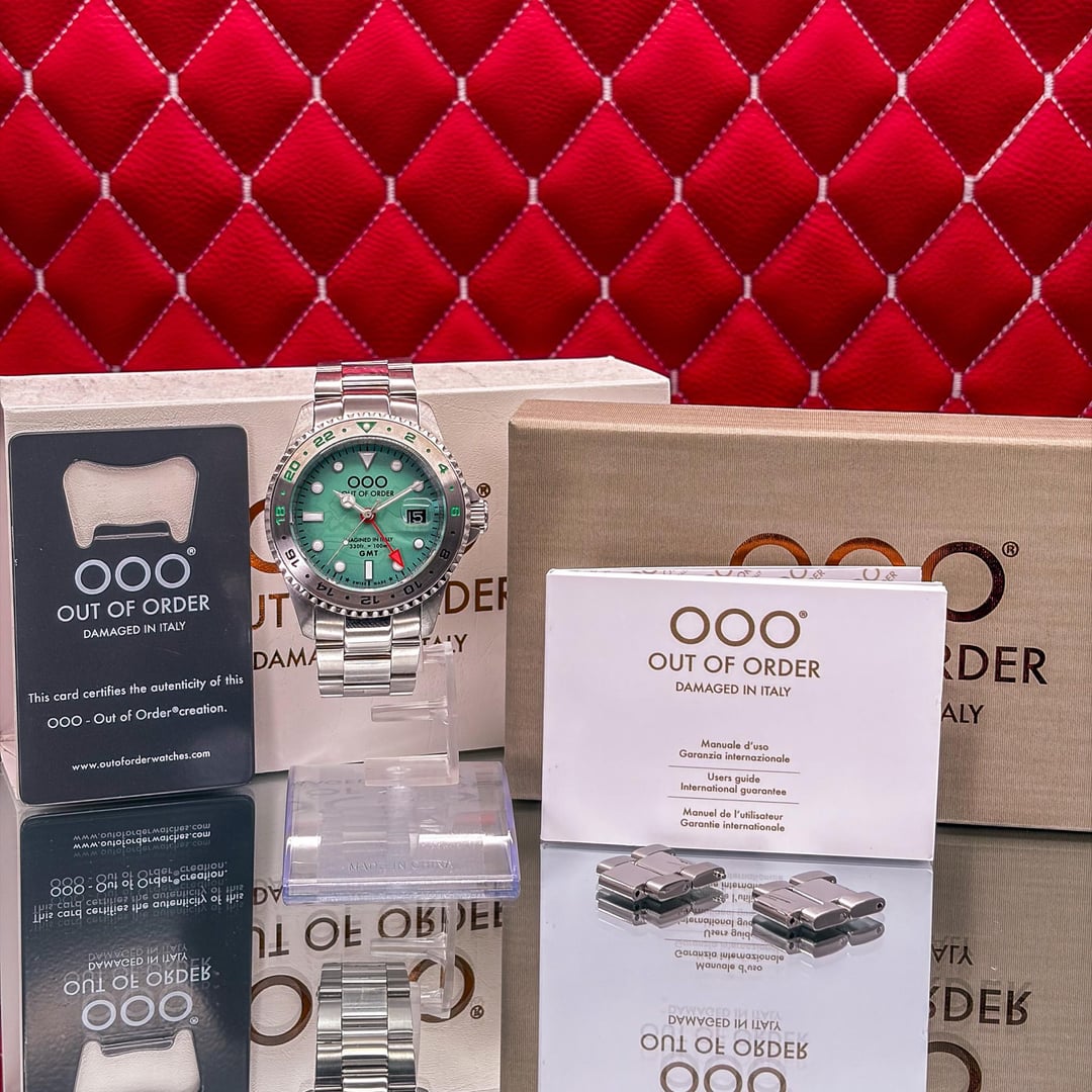 🏒🥅🚨 Out of Order GMT Venezia Ultra Brushed - Swiss Made - Full Set - 2025 This is the Out of Order GMT Venezia Ultra Brushed. This is the "Swiss Made" version featuring the Swiss Ronda 515 24h Quartz movement. It features OOO’s signature "Damaged in Italy" aesthetic with a unique ultra-brushed 316L stainless steel case. The highlight is the green dial with a hidden luminescent map of Venice’s neighborhoods that glows in the dark. The watch is in good pre-owned condition and is ready for a new home. 💰 Price: 💲310 USD Condition & Photography Please review all photos for the most accurate representation of this watch's condition. Our macro photography is designed to capture every detail, including the smallest imperfections, ensuring you can buy with complete confidence. Shipping & Service We ship fully insured overnight via FedEx for your peace of mind. We are happy to arrange a video call to show the watch and answer any questions—just reach out anytime. We guarantee the authenticity and accuracy of all our timepieces. Your satisfaction is our highest priority, and we strive for a smooth, transparent, and 100% positive transaction. As a dedicated hockey coach and passionate timepiece collector (@pucks\_timepieces), I've spent years immersed in the world of horology. I now combine this passion with my hockey-playing daughters, and together we create the unique presentations you see here. Our photography is inspired by contemporary artists like KAWS, Banksy, Joan Cornellà, Death NYC, and Shepard Fairey. This artistic approach adds a distinctive, creative character to how each watch is presented. When you purchase from me, you can expect a seamless experience. I'm highly responsive and happy to provide extra photos or details to ensure you feel great about your purchase. Timestamps: https://drive.google.com/file/d/19peey\_rYJCx8dJighrKy5URXQuICvoKF/view?usp=sharing & https://drive.google.com/file/d/1BiAMFAXyYQq3MwJeGXZFlq4mv4cWzfQK/view?usp=sharing