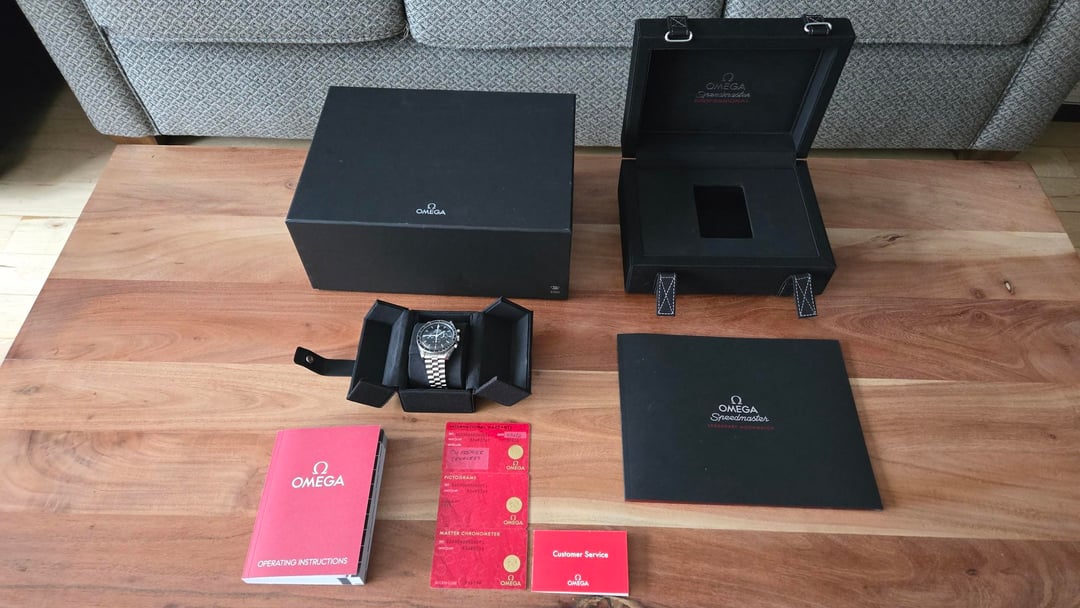 Hello watchex! Up for sale is my 42mm Omega Speedmaster Professional Moonwatch (310.30.42.50.01.001) with hesalite. This comes as a complete set complete with the warranty card. The watch was purchased new in 2002 and worn often, but is in Very Good condition overall. The crystal is clean, the bracelet is in excellent condition, and the watch body itself is in excellent condition. The only significant signs of wear are desk diving swirls on the clasp, which can easily be buffed out. shown in timestamp. This watch is in fantastic condition overall. It has been babied and loved and worn with pride. Price: Priced to sell at $4,500 Shipped to the CONUS! Shipping outside of the US can be discussed. Payment: I accept Zelle, Venmo, or Paypal F&F. Paypal F&F and Venmo are payment options reserved for buyers with strong transaction history on the sub. I have strong references, both on and off Reddit. Feel free to contact me with any questions! Thanks for looking.