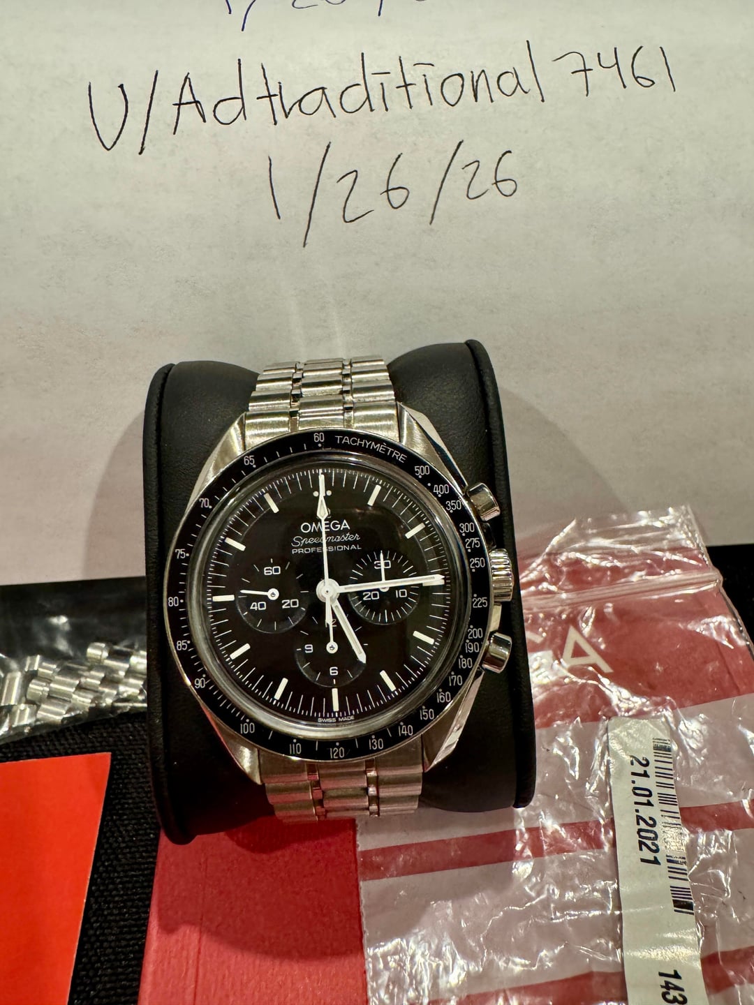Catch and release for me. Picked this one up recently because it’s an absolute classic and really needs no introduction. After spending some time with it, I realized it overlaps too much with my current rotation. As iconic as the Speedmaster is, I’d rather see it go to someone who will give it more wrist time than I can. Macro Video: https://imgur.com/a/WrqpGHO Normal Video: https://imgur.com/a/qR7me8L This is the 2021 Omega Speedmaster Professional Sapphire Sandwich 310.30.42.50.01.002, powered by the caliber 3861 Master Chronometer movement. It features a sapphire crystal on the front and an exhibition sapphire caseback showcasing the beautifully finished manual-wind movement. Comes as a full set with inner and outer boxes, operating instructions, warranty and pictogram cards, hang tag, spare links, and everything shown in the photos. Condition: Excellent overall. Case and bracelet show light wear consistent with normal use. Crystal is clean. Winds smoothly, chronograph functions perfectly, and keeps excellent time. Location: Colorado, USA Price: $5,499 shipped CONUS (PayPal F&F, Venmo, or Zelle preferred)