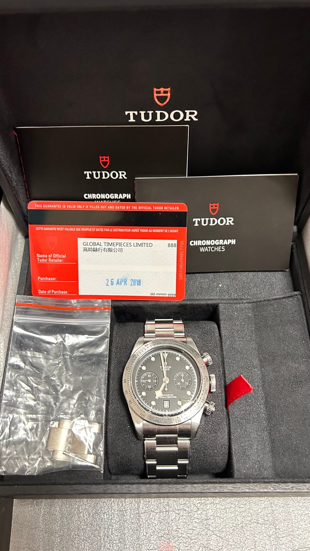 Up for sale is a Tudor Heritage Black Bay Chrono 79350 41mm Full Set. It is fully functional and running at +4s/d. It comes with a warranty card dated 2018, Tudor inner and outer boxes, and Tudor booklets. ***The authenticity is 100% guaranteed – the watch has been thoroughly inspected and authenticated prior to listing. Feel free to check out my website*** **Tonneau Atelier** ***in my profile.*** Price: $2899. Payment via PayPal or Wise is preferred. No trades please! Watch is in Chongqing (known as the Cyberpunk City), China. I will pay the customs duties or tariffs for buyers located in United States. Watches will be shipped via FedEx, which delivers to your doorstep in just four days. Worldwide shipping and I am willing to ship this watch anywhere with buyers paying for the shipping. If you really love this watch and pay fast, I will offer free shipping! Feel free to ask for any custom timestamps or videos, I am happy to send them. Please don't hesitate to ask me any questions, thank you! Timestamp: [https://imgur.com/a/AKkz9Xh](https://imgur.com/a/AKkz9Xh)