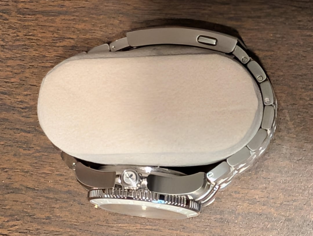 Dial: White MOP (Mother of Pearl) Case: 316L stainless steel Case Size: 39mm X 45mm, thickness 13.5mm (excluding glass) Weight: 168g (with band) Band: 316L stainless steel bracelet with on-the-fly adjustable clasp and quick release spring bars (Tapered from 20mm lug into 18mm buckle size) Glass: Double dome sapphire crystal with 3 layers of anti-reflective coating inside Bezel: Glossy light cream 120-click unidirectional rotating ceramic bezel Water Resistance: 200M (660ft) Crown: Screw-Down crown Lume: 15 layers Super-LumiNova BGW9 on hands, indices and bezel markings