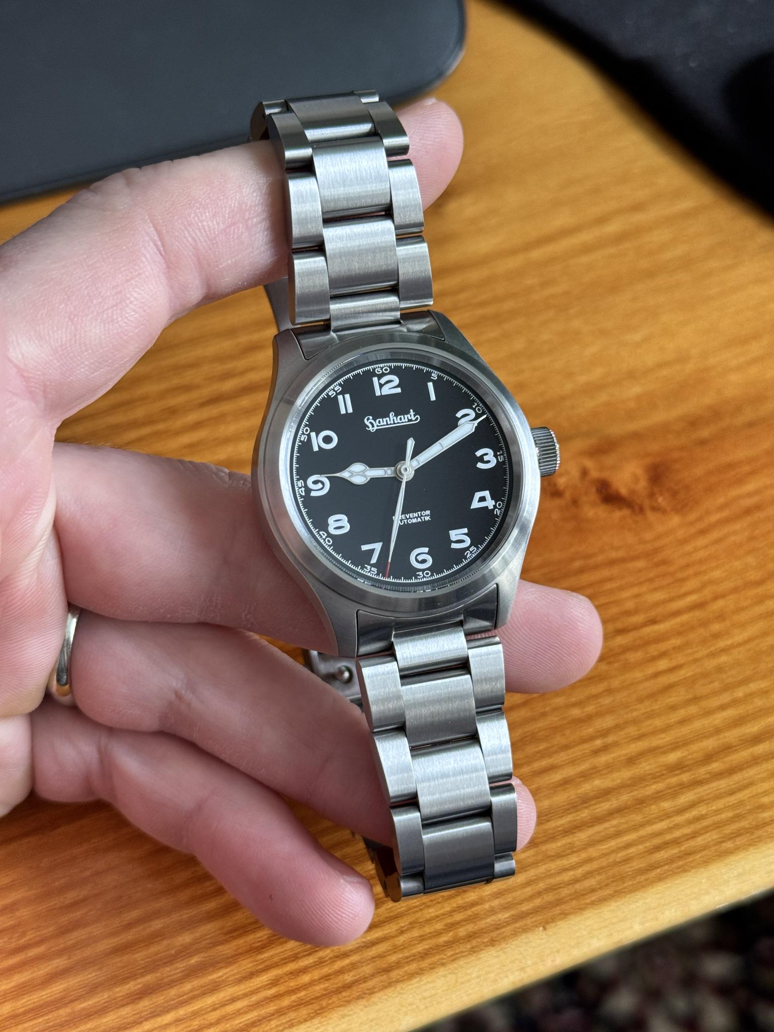 FS is a Hanhart Preventor HD 12 in black - this one dated August 2025 and has the quick adjust bracelet clasp! Perfect dimensions paired with a 1200 Vickers hardness coating, quick release bracelet for easy strap changes, and their new clasp makes this the perfect daily watch. **Timestamp:** [https://imgur.com/W2juPiK](https://imgur.com/W2juPiK) **Photos:** [**https://imgur.com/a/preventor-GqliRde**](https://imgur.com/a/preventor-GqliRde) **Condition:** * **Case, bezel, and crystal:** 9.9/10. * **Bracelet:** 9.9/10 * **Accuracy:** \+3-4s/day **Full Kit:** * Nice 2 watch full grain leather roll and box/sleeve * Manual * August 2025 Warranty card * All links **Specifications:** * **Model:** Hanhart Preventor HD12 Black Dial on Quick Adjust Bracelet * **Case size:** 39mm * **Thickness:** 10mm * **Lug-to-lug:** 46mm * **Case material:** HD12® hardened stainless steel * **Dial:** Matte black * **Crystal:** Sapphire with anti-reflective coating underneath * **Movement:** Selita SW200 or SOP P024 * **Water resistance:** 150m * **Bracelet:** Stainless steel with Quick Adjust **Price & Terms:** * **Price:** $1300 shipped CONUS only. Shipping from Virginia. * **Payment:** Paypal F&F preferred * No trades, selling to fund another purchase. * Private seller, no returns unless the watch has been misrepresented by anything described here.