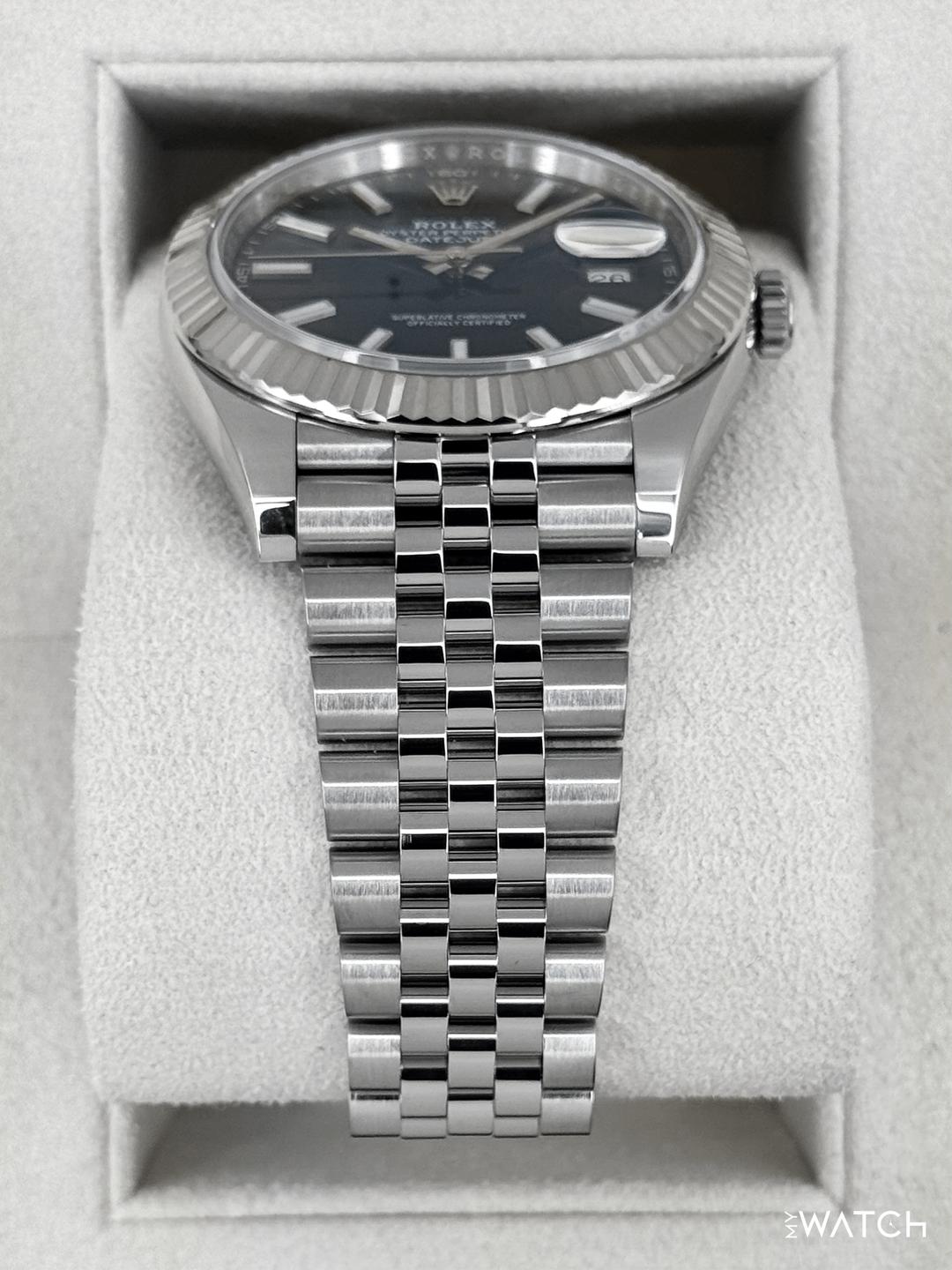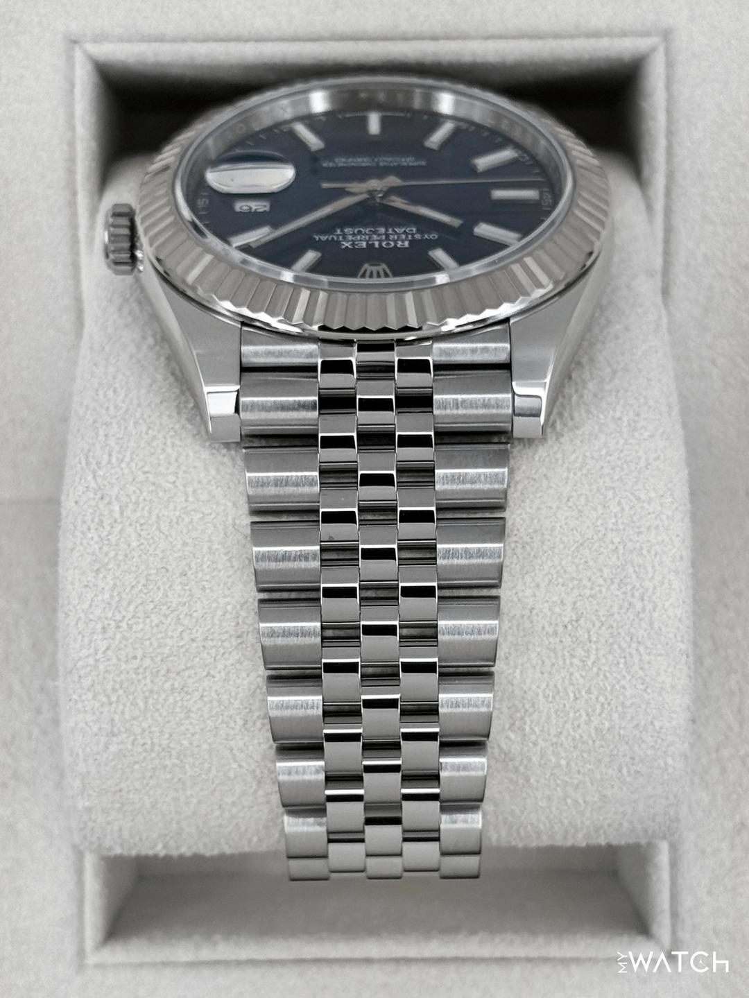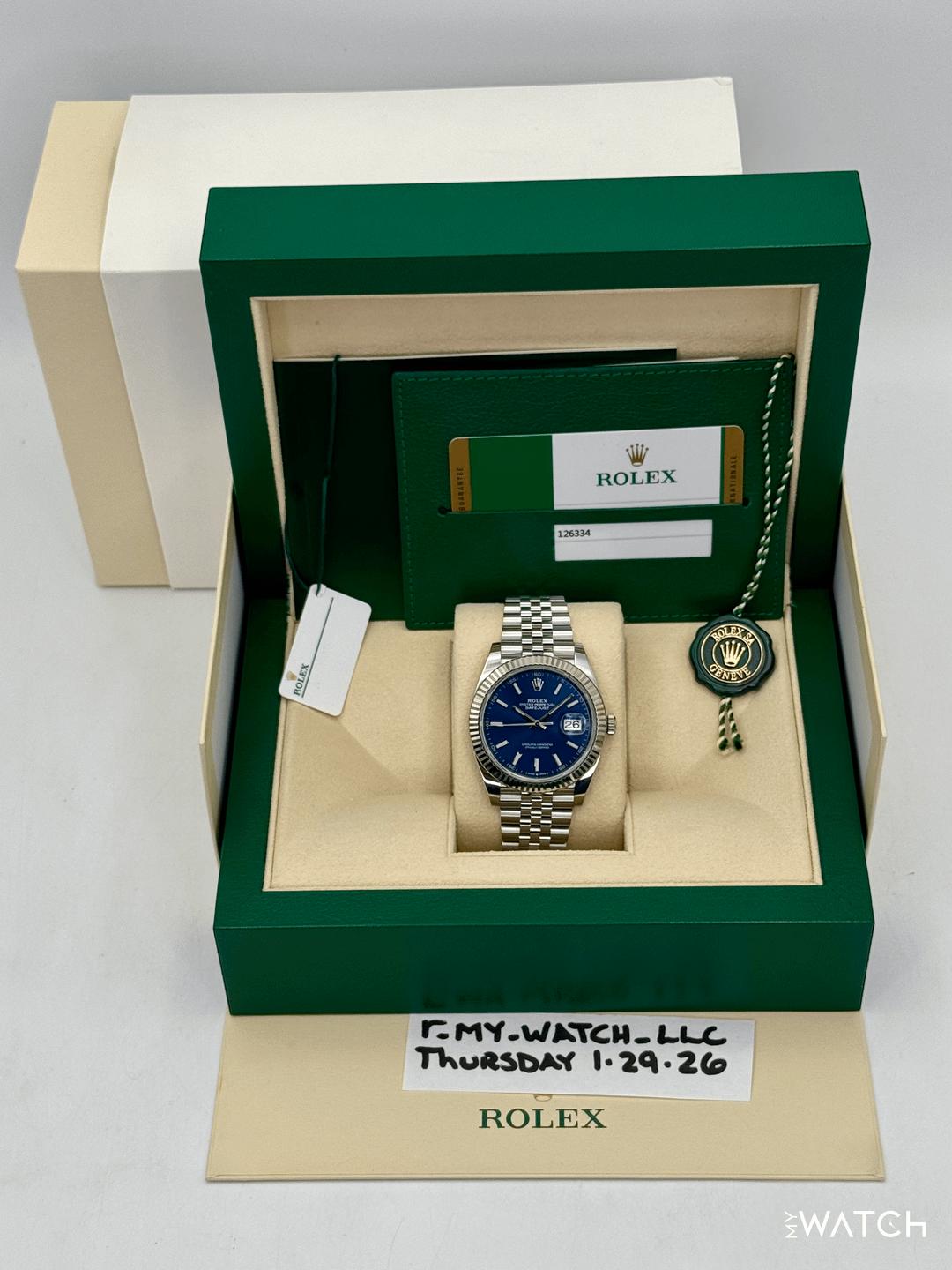 🔵**2019 Rolex Datejust 41mm 126334 Oystersteel and 18K White Gold Fluted Bezel with Jubilee Bracelet and Blue Dial** 🔵**TRADE or SELL us your luxury watch, all brands considered. Message me details.** **Includes the following:** **✔️Original Rolex Double Boxed** **✔️Box and Papers - Yes** **✔️Warranty card dated 2019** **✔️Manual and Warranty booklets** **✔️Green and White Hang Tags included** **✔️Size: 7.75inch wrist (Full Links)** **✔️Watch is in excellent overall condition. Please see photos for details.** **✔️**[**Trades**](https://mywatchllc.com/pages/sell-rolex-watch) **welcome** Business Name: **My Watch LLC** LOCATION: Oak Park, Michigan ✔️[MyWatchLLC.com](http://mywatchllc.com/) for current inventory ✔️Google Business Listing [https://g.co/kgs/Cmd6FPW](https://g.co/kgs/Cmd6FPW) ✔️Business Hours M-F 9-6 ✔️Facetime/Video chat/calls welcome to view the watch interested. ✔️Contact: 248-422-0909 via text or call for quickest response. 🟢TERMS: Visit [MyWatchLLC.Com](http://mywatchllc.com/) for payments accepted 🟢REFERENCES/REVIEWS: We are well reviewed on all platforms from google, trust pilot, rolexforums, additionally we have 300+ reference in multiple FaceBook watch groups, reference checks welcome. 🟢SHIPPING: If you are not local, we offer Fully Insured FedEx overnight shipping in the USA for a fee. International shipping available. [https://mywatchllc.com/products/2019-rolex-datejust-41mm-126334-stainless-steel-jubilee-blue-dial](https://mywatchllc.com/products/2019-rolex-datejust-41mm-126334-stainless-steel-jubilee-blue-dial)