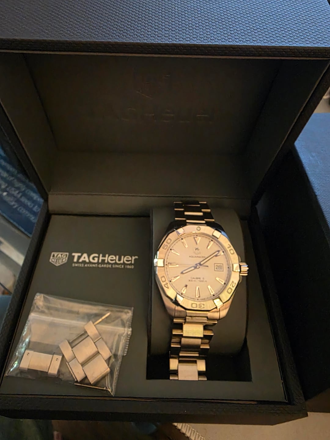 Hi WatchEx, Listing for for good condition Tag Heuer Way2111 in 41mm Watch is in great working condition and keeps accurate time. Prior owner advised serviced in 2024, but no document available. Watch works flawlessly. Scratch is showing on the clasp from normal daily wear, crystal is clean and no scratches. It is in beautiful 41mm extremely wearable for most wrist (my wrist is 6.25") woth beautiful dial. My favorite aquaracer so far. Watch comes with box and extra links. Please reach out if you have additional questions. Asking $925 shipped CONUS preferred PayPal FF and please add 3% for G&S or Zelle. Thank you!