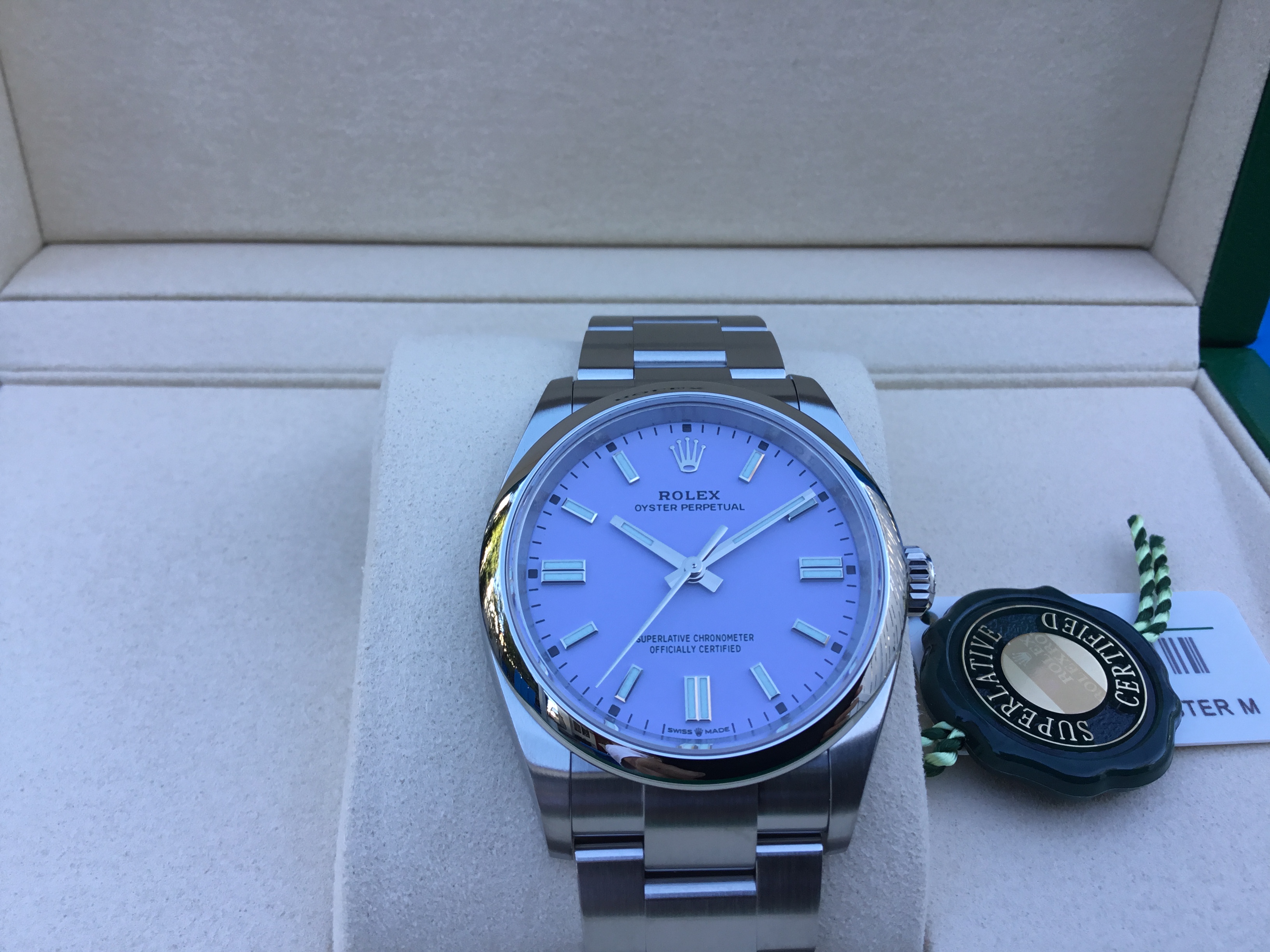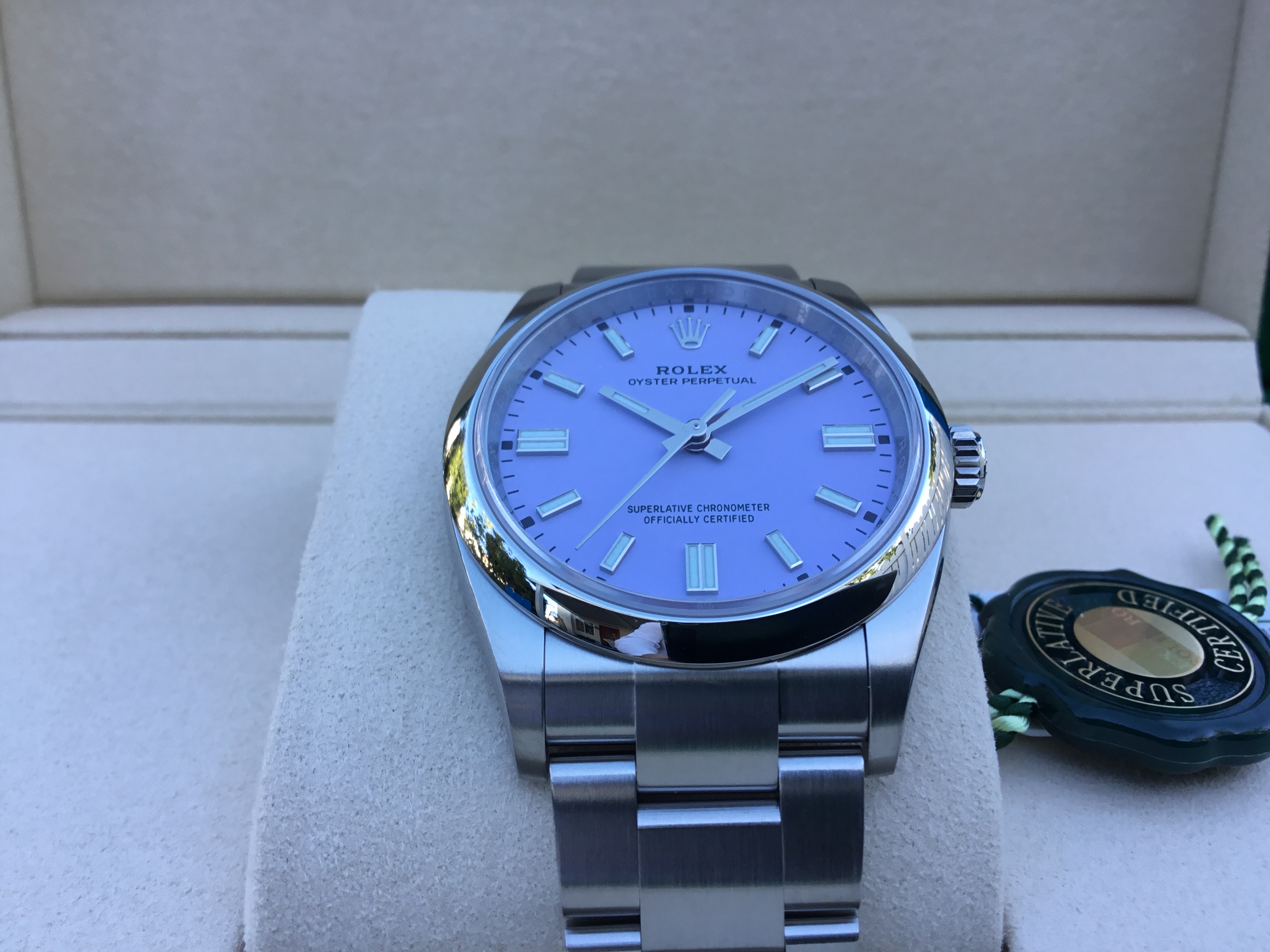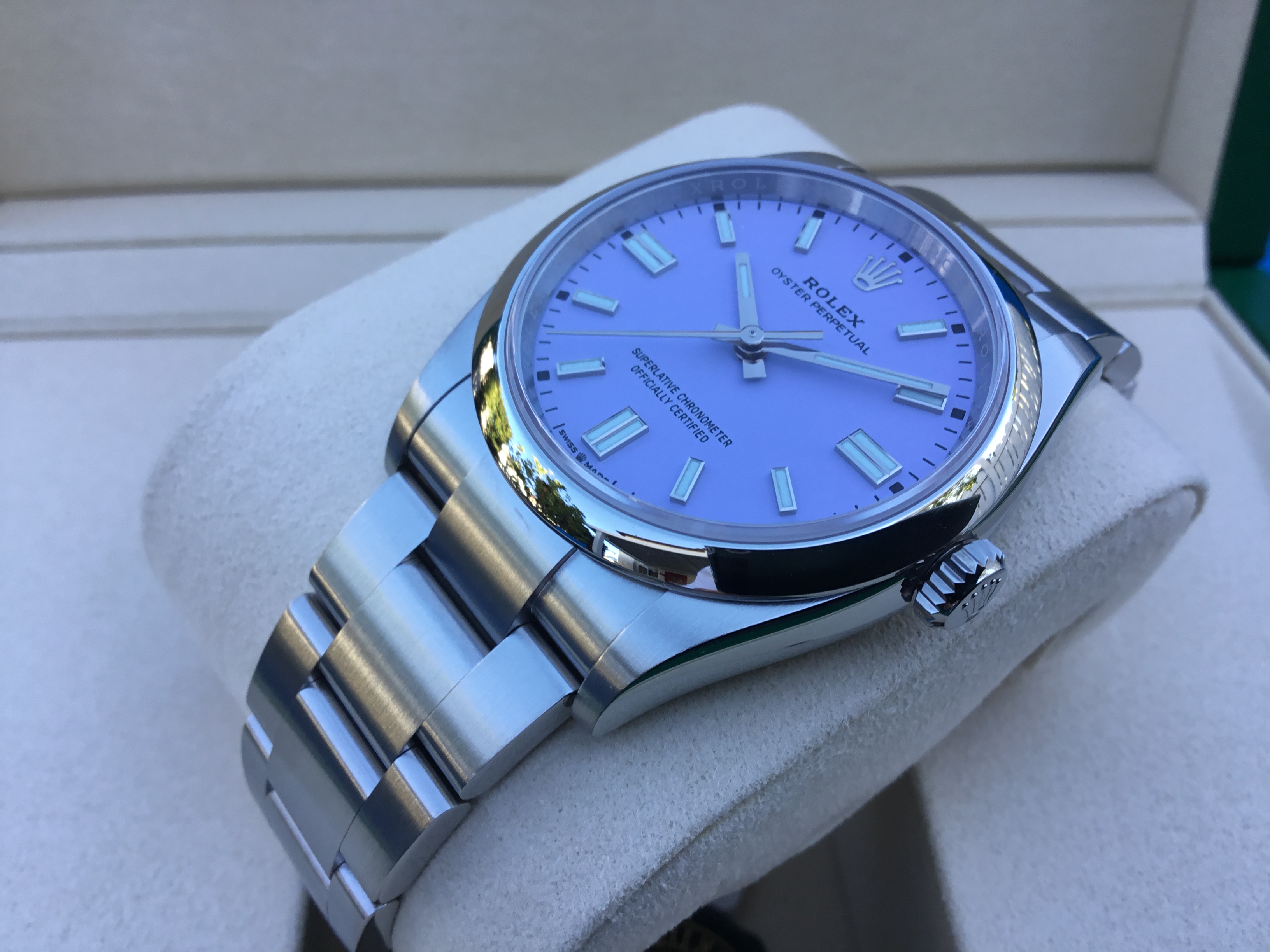 LAVENDER dial, index hour markers, Rolex calibre 3230 automatic movement with center hour, minute and seconds hands, and stop-seconds for precise time setting, approximately 70 hours of power reserve, Oyster bracelet with flat three-piece links, folding Oysterclasp buckle with Easylink 5mm comfort extension link. Waterproof to 100 meters.