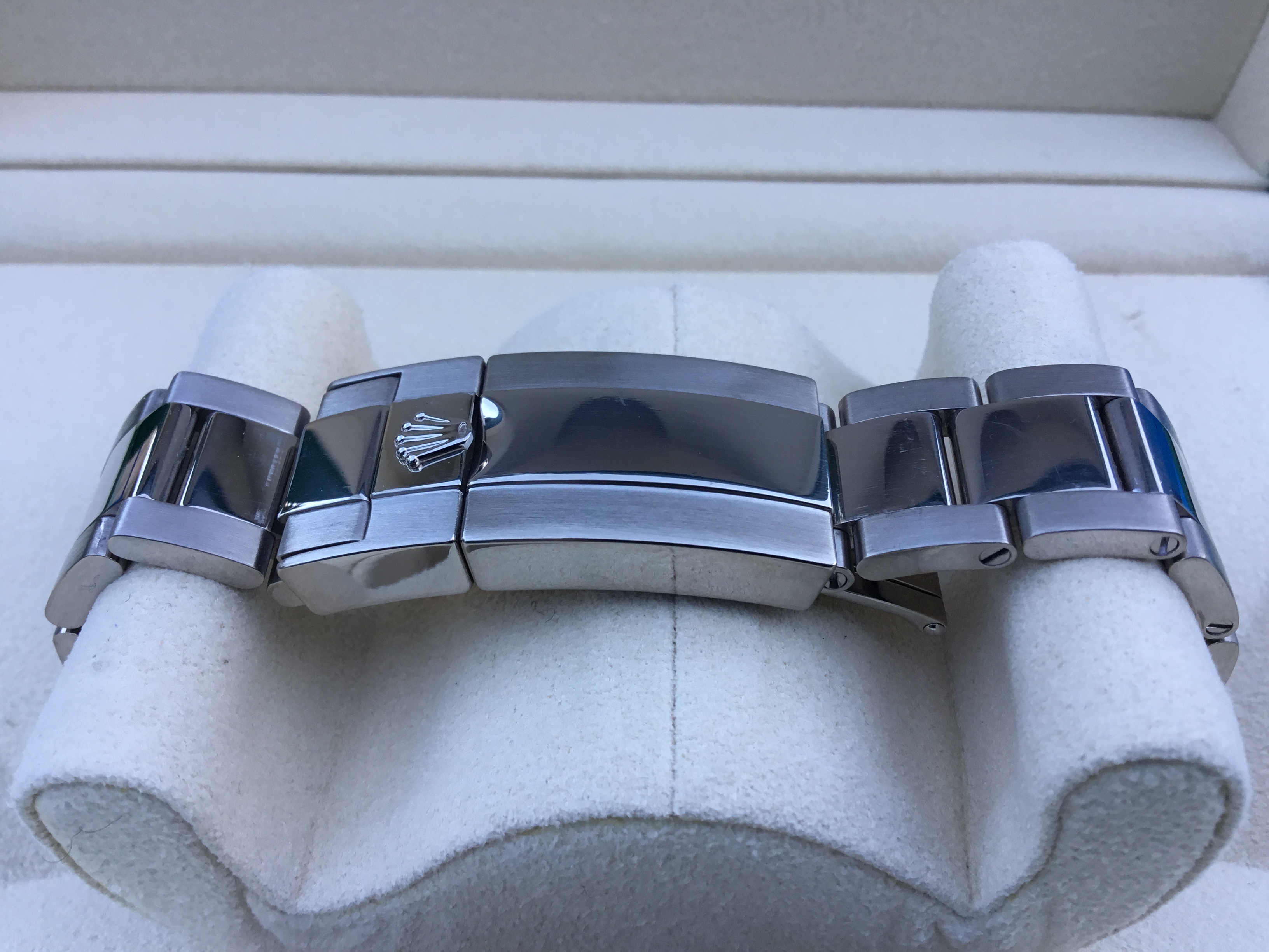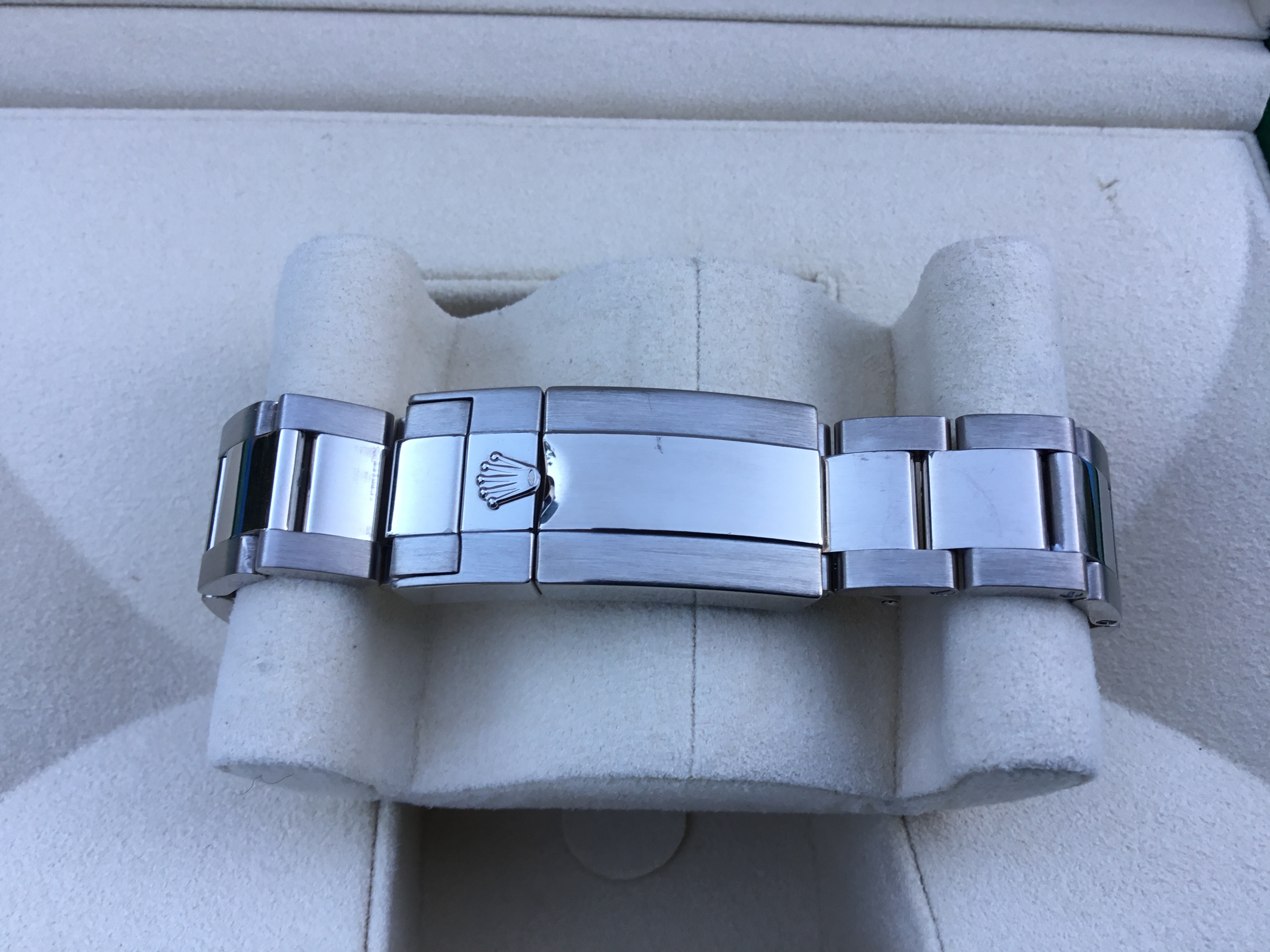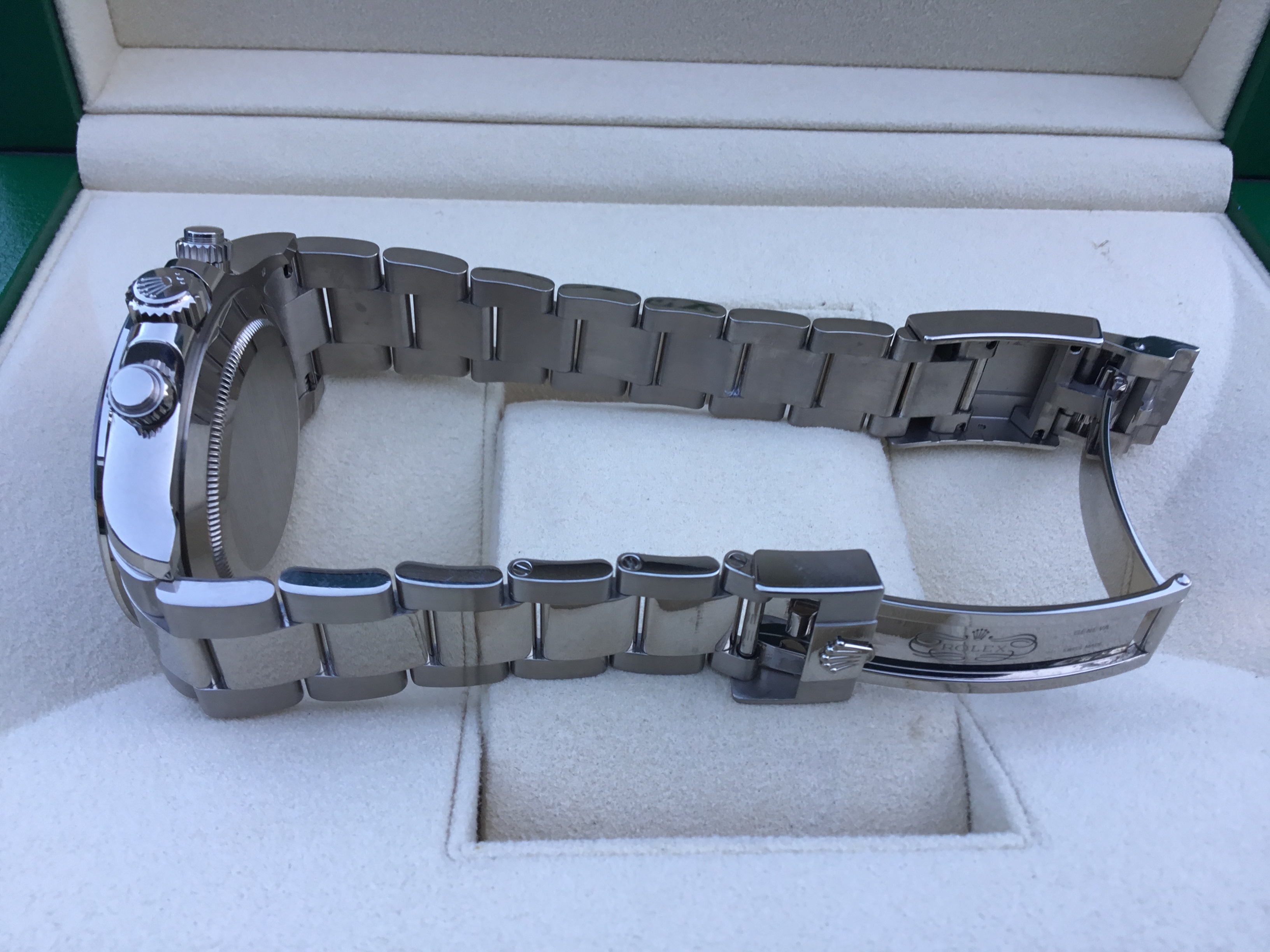 It comes with the original boxes, booklets, green hang tag, ALL 12 BRACELET LINKS, bezel protector, and warranty card.