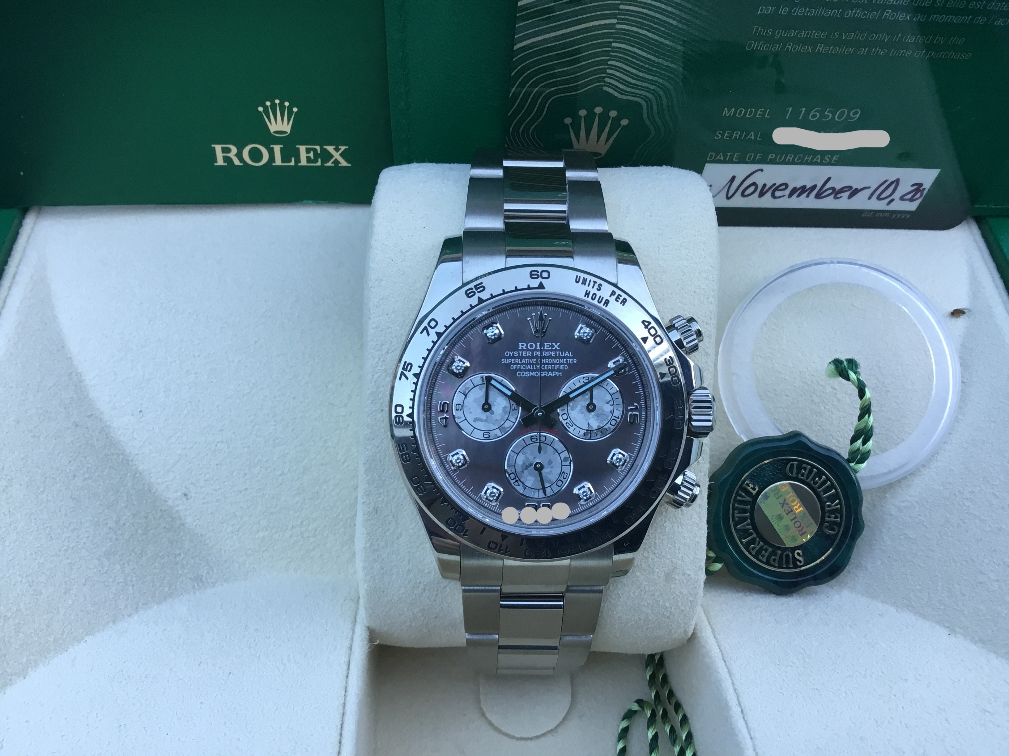 FS: Rolex Oyster Perpetual Cosmograph Daytona WG Tahitian MOP Diamond Dial 116509