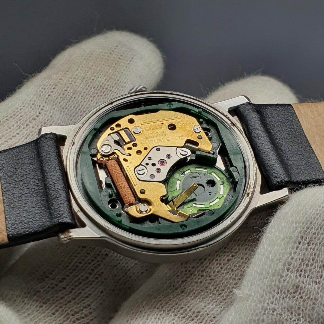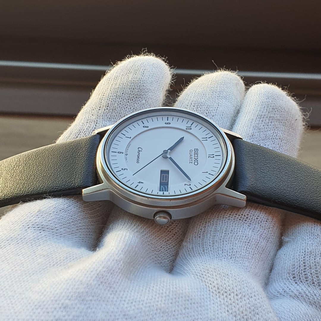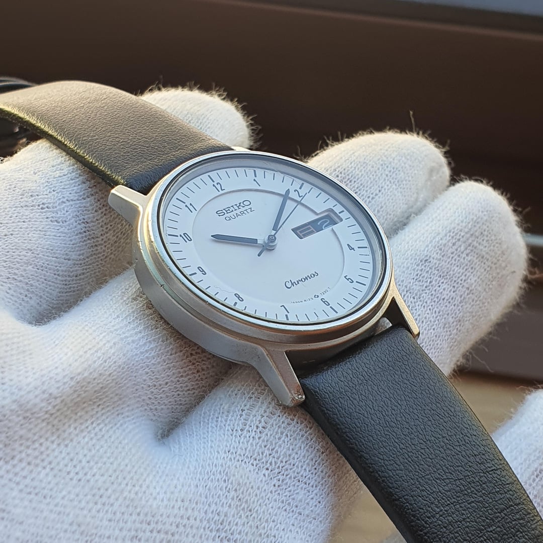 Hey WatchEx! For sale is this vintage Seiko "Chronos" (8123-7220), made in Japan in October of 1984. The "Chronos" series was a mid-range series by Seiko introduced in 1983, primarily for the Japanese domestic market, that sought to be a more elegant echo of the "SilverWave" series, which was more sport-orientated. It was also the predecessor to the "Spirit" series. This model, reference number WJL100, was a clear step forwards in watch design for Seiko from the 1970s and has some really nice industrial field watch styling perhaps influenced by Bauhaus design. The dial has a subtly white grainy texture and a raised outer ring for the minute track that has an interesting cutout for the day/date. The clinical design is unified by the monochrome dial features like the black tipped pencil hands and the great decision to use a negative day/date wheel. The days of the week can be set to either Japanese Kanji or English. The swirl symbol on the bottom of the dial and case back indicate that the watch was designed and manufactured by the Suwa factory during its fierce rivalry with the Daini factory. The stainless steel case has likely been bead-blasted for that satin finish, combined with the simple but well-proportioned case contributes to the industrial look of the watch. The crown is finished in the same way to match the case. The bottom left lug has some damage to it but doesn't affect the wearability. On the case back, there is the inscription, translated from Japanese, "Takehara 4th Branch, Youth Baseball" which tells the story that this watch was once gifted to someone from the Takehara baseball team, most likely in 1984/5 that just adds to the history of this particular watch. This watch reminds me a lot of the Steve Job's choice of watch which was also a Seiko with a similar dial and industrial look but with a black case. The WJL100 houses the calibre 8123 movement which is a beautiful gold-coloured vintage quartz movement that still works great. It has a stated accuracy of 15 seconds per month and a battery life of roughly 5 years. It is in great working condition. Comes on a high-quality Hirsch diamond calf leather strap (RRP of over $40), which has scratch-resistant properties, although I don't believe the buckle is original. I think it suits the simplicity of the watch. The strap does seem like it is a shorter than most other straps are though, just something to keep in mind. Brand new battery fitted. The condition is very good for a watch that was made over 40 years ago, with general minor wear, a couple of dings on the case (which I think adds to the rugged look) and a couple of small scratches on the crystal. As stated earlier the bottom left lug has some damage but it does not affect the lug hole or wearability. Looking for $175 net (buyer pays Paypal or Wise fee) + shipping Dimensions are: 33.1mm x 37.8mm x 7.8mm Lug Width 18mm (roughly measured) Bought in Japan. \*Returns accepted but all return postage costs are the buyer's responsibility in all circumstances and all re-import fees that we may have to pay when receiving the watch will be deducted from the refund amount.