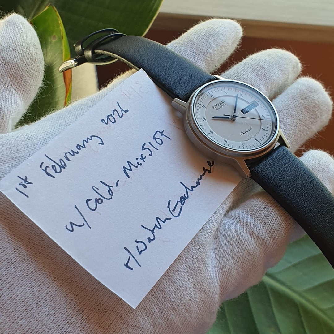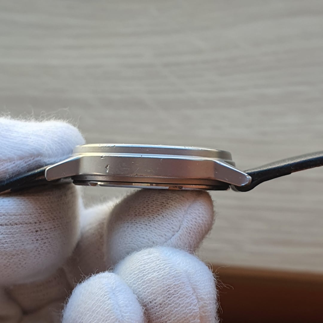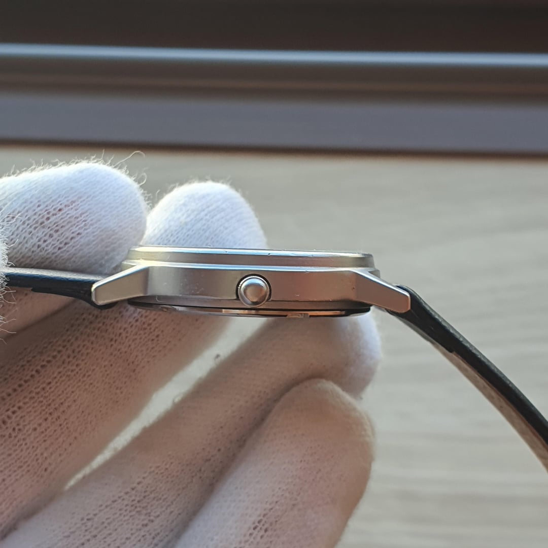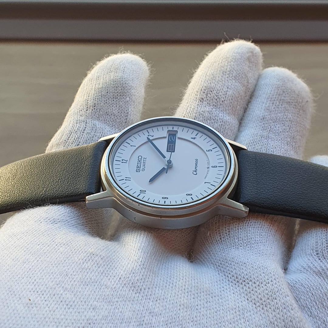 Hey WatchEx! For sale is this vintage Seiko "Chronos" (8123-7220), made in Japan in October of 1984. The "Chronos" series was a mid-range series by Seiko introduced in 1983, primarily for the Japanese domestic market, that sought to be a more elegant echo of the "SilverWave" series, which was more sport-orientated. It was also the predecessor to the "Spirit" series. This model, reference number WJL100, was a clear step forwards in watch design for Seiko from the 1970s and has some really nice industrial field watch styling perhaps influenced by Bauhaus design. The dial has a subtly white grainy texture and a raised outer ring for the minute track that has an interesting cutout for the day/date. The clinical design is unified by the monochrome dial features like the black tipped pencil hands and the great decision to use a negative day/date wheel. The days of the week can be set to either Japanese Kanji or English. The swirl symbol on the bottom of the dial and case back indicate that the watch was designed and manufactured by the Suwa factory during its fierce rivalry with the Daini factory. The stainless steel case has likely been bead-blasted for that satin finish, combined with the simple but well-proportioned case contributes to the industrial look of the watch. The crown is finished in the same way to match the case. The bottom left lug has some damage to it but doesn't affect the wearability. On the case back, there is the inscription, translated from Japanese, "Takehara 4th Branch, Youth Baseball" which tells the story that this watch was once gifted to someone from the Takehara baseball team, most likely in 1984/5 that just adds to the history of this particular watch. This watch reminds me a lot of the Steve Job's choice of watch which was also a Seiko with a similar dial and industrial look but with a black case. The WJL100 houses the calibre 8123 movement which is a beautiful gold-coloured vintage quartz movement that still works great. It has a stated accuracy of 15 seconds per month and a battery life of roughly 5 years. It is in great working condition. Comes on a high-quality Hirsch diamond calf leather strap (RRP of over $40), which has scratch-resistant properties, although I don't believe the buckle is original. I think it suits the simplicity of the watch. The strap does seem like it is a shorter than most other straps are though, just something to keep in mind. Brand new battery fitted. The condition is very good for a watch that was made over 40 years ago, with general minor wear, a couple of dings on the case (which I think adds to the rugged look) and a couple of small scratches on the crystal. As stated earlier the bottom left lug has some damage but it does not affect the lug hole or wearability. Looking for $175 net (buyer pays Paypal or Wise fee) + shipping Dimensions are: 33.1mm x 37.8mm x 7.8mm Lug Width 18mm (roughly measured) Bought in Japan. \*Returns accepted but all return postage costs are the buyer's responsibility in all circumstances and all re-import fees that we may have to pay when receiving the watch will be deducted from the refund amount.
