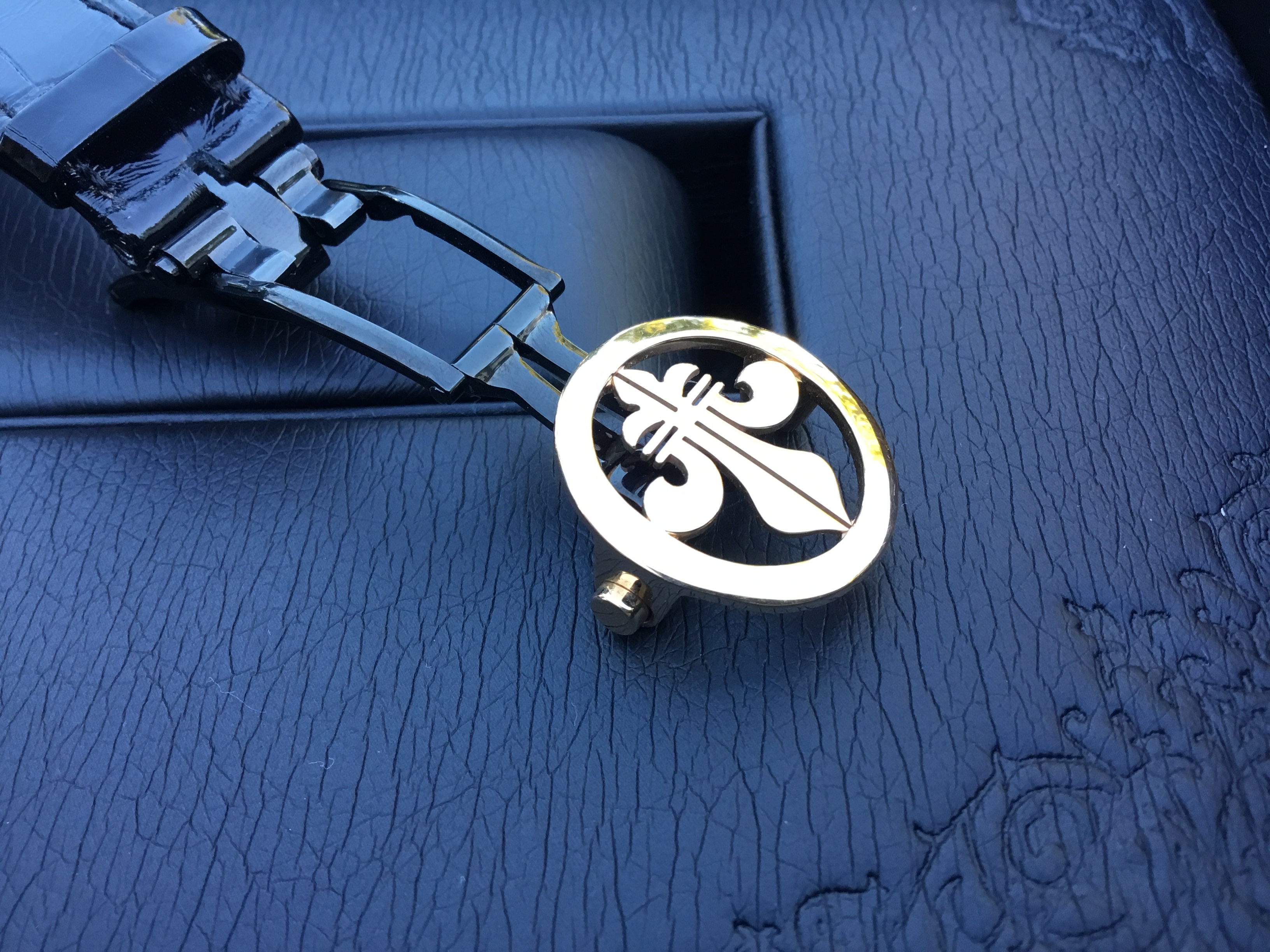 It sits on a lush black alligator strap (additional red alligator included), and blackened foldover clasp with red gold buckle.