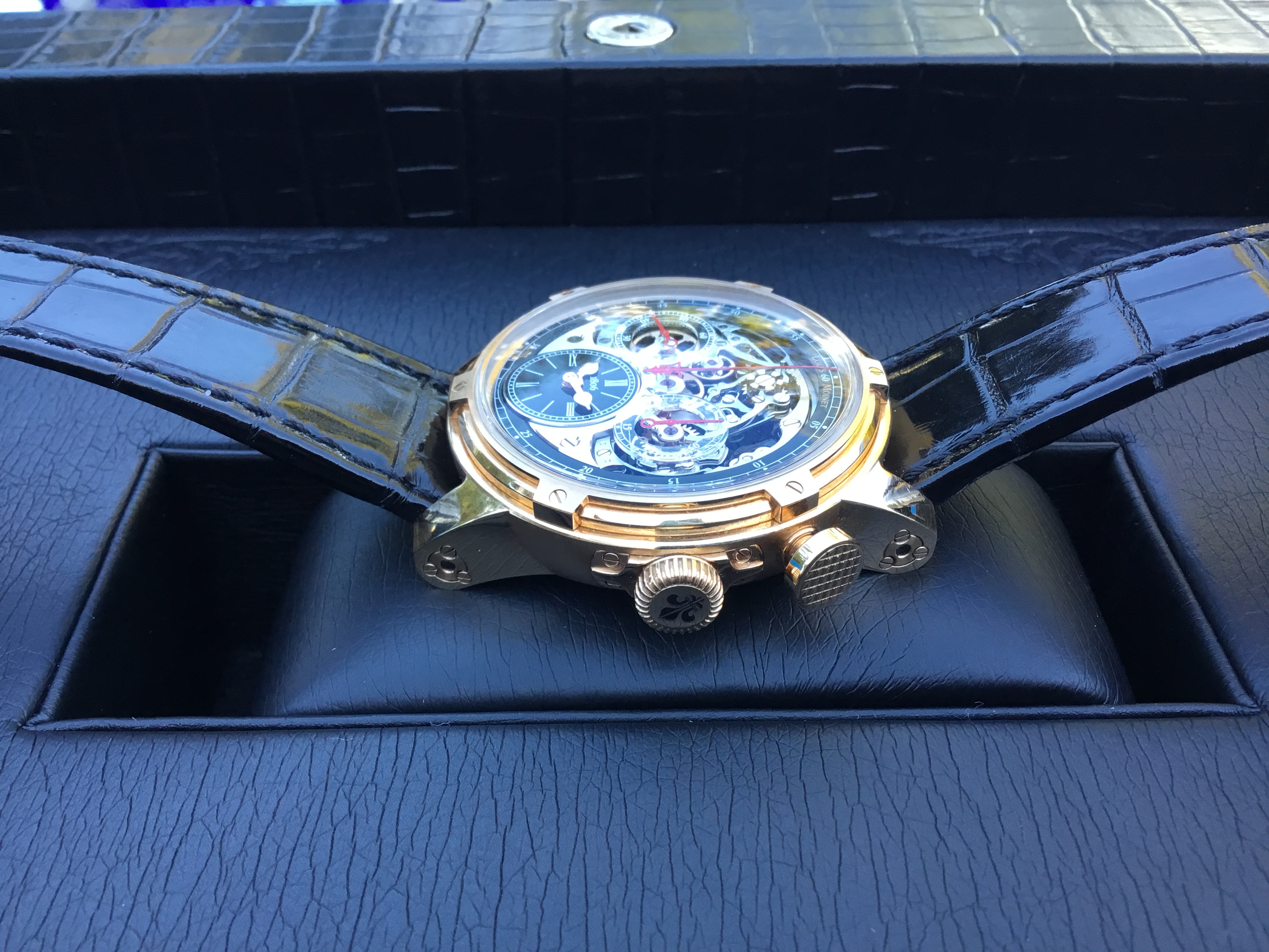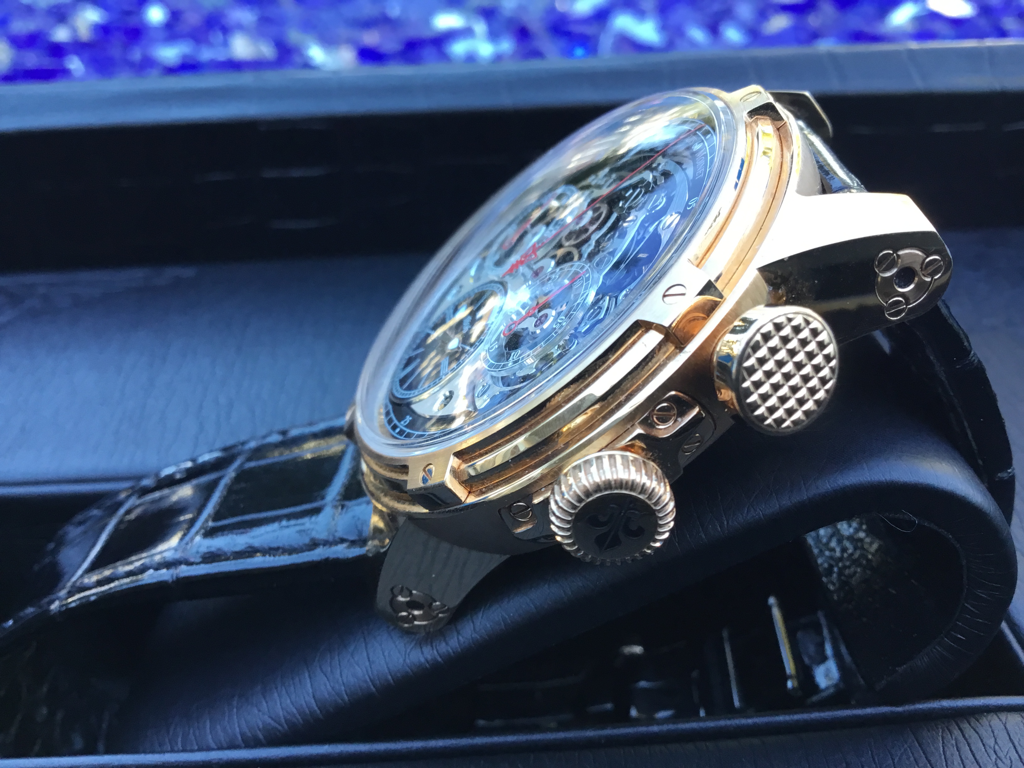 The 18k red gold case is 46mm, 24mm between the lugs, and features a skeletonized dial with beautiful red gold, black and red accents.