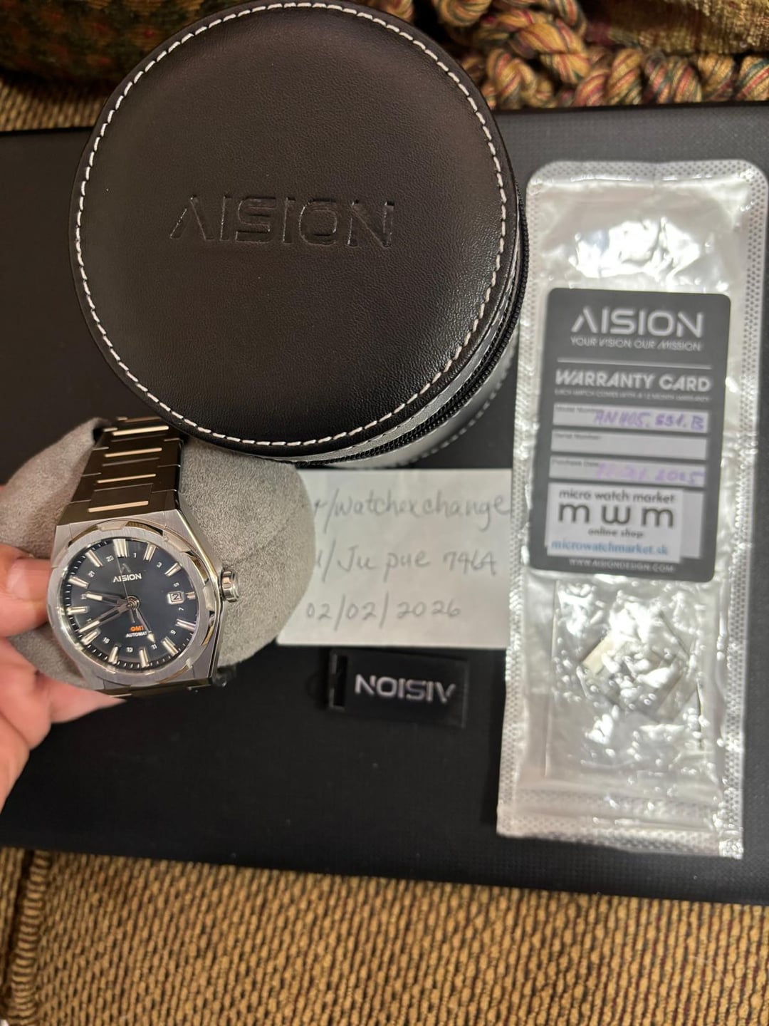 Offering this up at the steal price of only $299 plus $14 for CONUS shipping via USPS Priority. Killer, sold out watch that had an msrp of $652!! Watch is in excellent overall cosmetic condition with no gouges, deep scratches, or dents. Comes with everything pictured. https://aisiondesign.com/products/hang-gmt-grey-mop-dial?srsltid=AfmBOoqCOk8sD5TBYyT_revIVGzPBFImaNruKuWuLdDiAXKUDTv8zD1f This is being sold as-is with no warranty or returns expressed or implied. Thanks for your consideration and please let me know if you have any additional questions or requests as I'm happy to oblige.