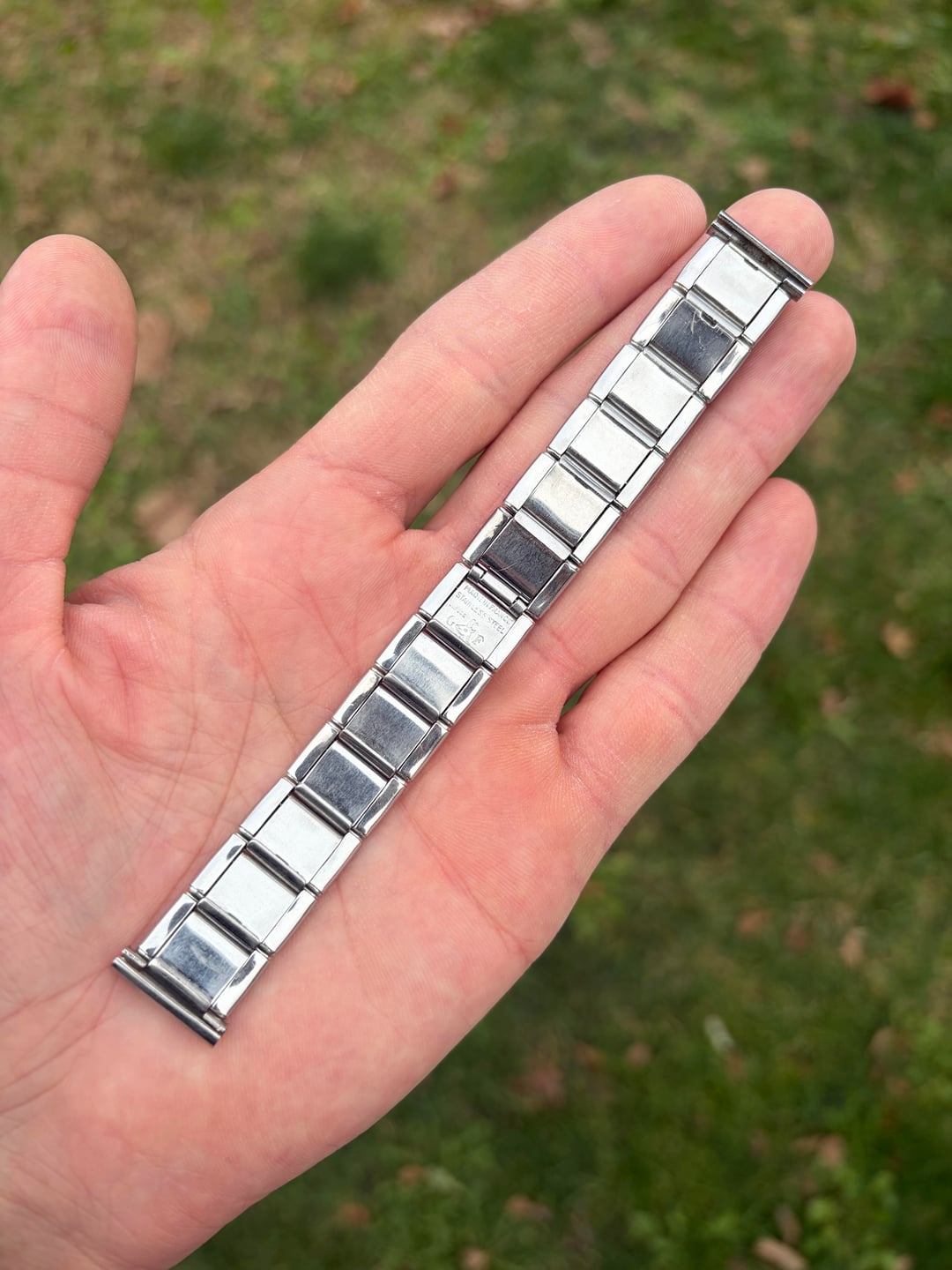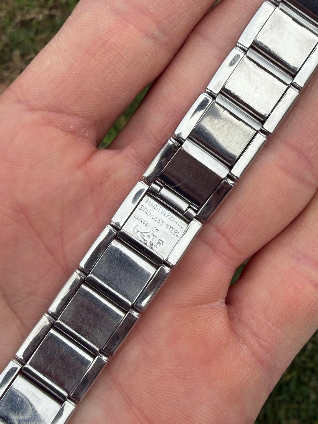 Hey all! Here is for sale a nice flexible bracelet from famous 20th century Swiss bracelet maker Gay Freres. Bracelet has signs of wear but it is in good shape having in mind it is from mid 1960s. Bracelet has straight lugs, both measures 17mm made to fit 17mm watch cases. This bracelet is featured on some Gay Freres adds and was named an “Extensibles sans fermoir” meaning expandable/stretch bracelets without clasp. On the inner side of the link supposed to be a clasp you can see GF goat stamp, Made in France, Stainless Steel and Depose. Total length of unstretched bracelet is 14cm, having in mind a watch case with 35-40mm it can easily fit an almost 17.5-18cm wrist size, but springs in links do they job really well and bracelet with watch can fit easily a 19-21cm wrist size. Please check the video how bracelet stretches in Imgur gallery. Bracelet looks good and has great historical value being one of the most recognized styles from Gay Freres, who produced bracelet for a vast variety of Swiss watch brands including Patek Philippe, Audemars Piguet, Rolex, Jaeger LeCoultre, Zenith, Universal Geneve, IWC and many others before being bought by Rolex. Please check all the pictures carefully, you’ll get the item pictured on Imgur gallery. Album: https://imgur.com/a/Jnmea9h Timestamp: https://imgur.com/a/Jnmea9h#WdB7m7B Price is $750 through PayPal F&F. FedEx International shipping is included in price, I ship international. I’ve sold a couple watches here, so you can check my feedback on r/WatchExchangeFeedback I’m not interested in trades.
