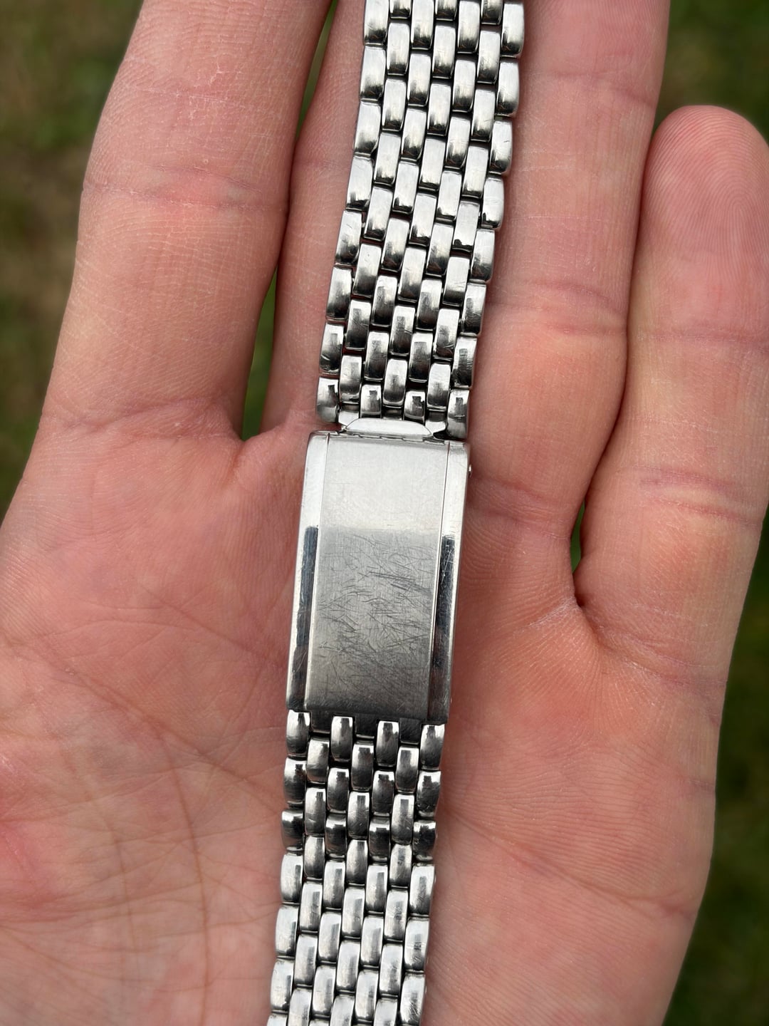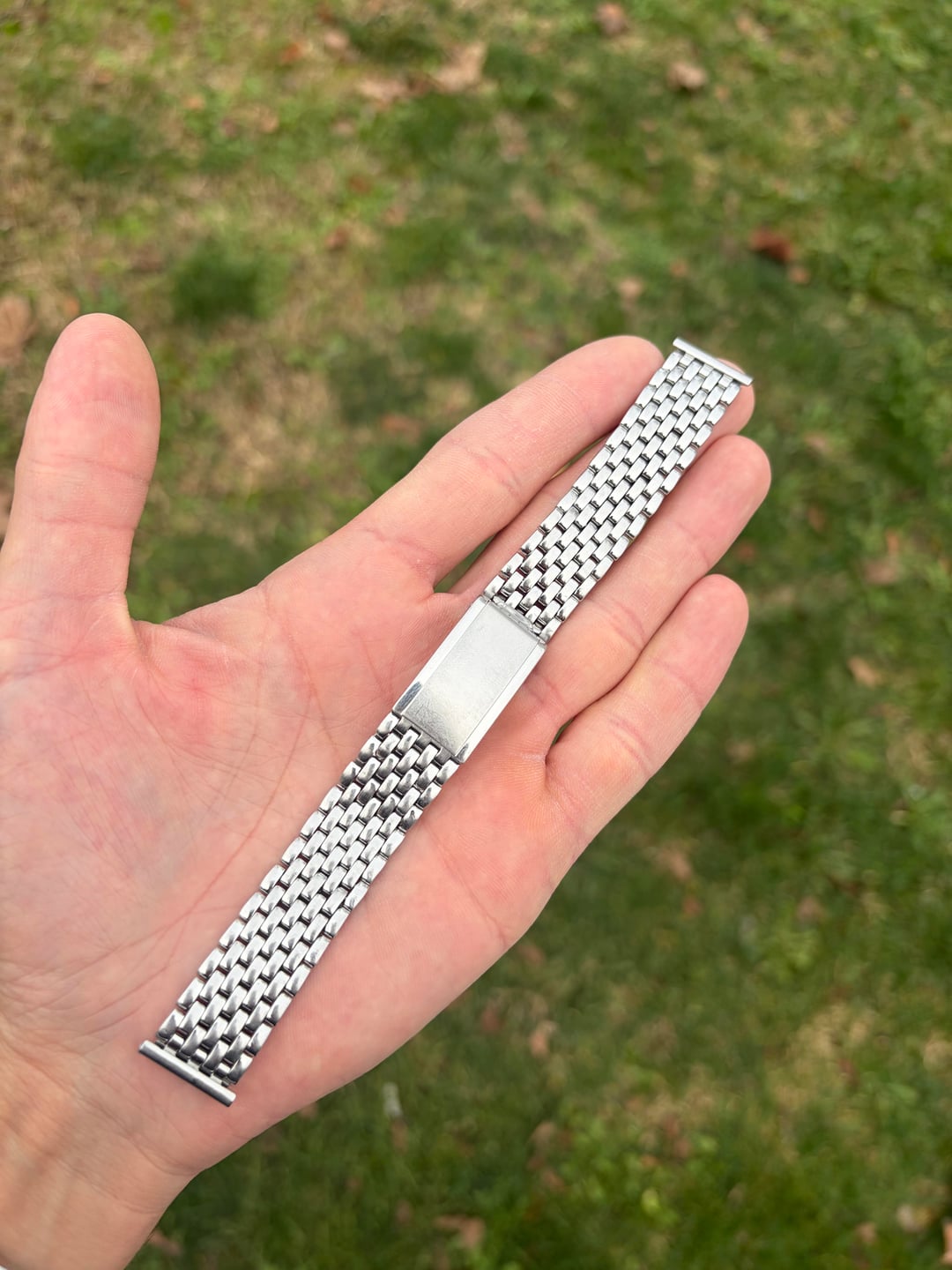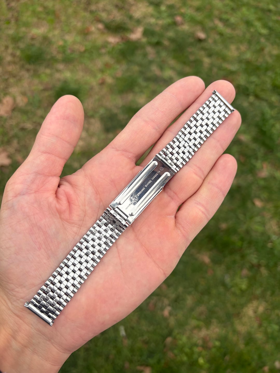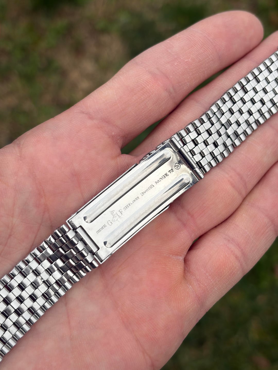 Hey all! Here is for sale a nice beads of rice bracelet from famous 20th century Swiss bracelet maker Gay Freres. Bracelet has signs of wear but it is in good shape having in mind it is from 1972 according to clasp code. Bracelet has straight lugs, both measures 17.9mm made to fit 18mm watch cases. Clasp has casual for Gay Freres style, having facets on both edges. Clasp has Brevete stamping, GF goat hallmark, Steelinox Swiss Made, year of production code 72 and W. Clasp works great and has 7 microadjustments. Total length of bracelet on the last 7th microadjustment is 17cm, having in mind a watch case with 35-40mm it can easily fit an almost 20cm wrist size. Bracelet has moderate stretch and it’spretty tough to rate it because of all beads of rice bracelets specific structure. Bracelet looks good and has great historical value being one of the most recognized styles from Gay Freres, who produced bracelet for a vast variety of Swiss watch brands including Patek Philippe, Audemars Piguet, Rolex, Jaeger LeCoultre, Zenith, Universal Geneve, IWC and many others before being bought by Rolex. Please check all the pictures carefully, you’ll get the item pictured on Imgur gallery. Album: https://imgur.com/a/BpNAXl9 Timestamp: https://imgur.com/a/BpNAXl9#RU8a7px Price is $1700 through PayPal F&F. FedEx International shipping is included in price, I ship international. I’ve sold a couple watches here, so you can check my feedback on r/WatchExchangeFeedback I’m not interested in trades.