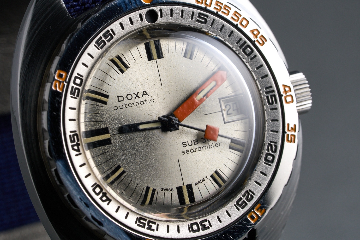 Hands: Excellent black and orange Doxa hands with tritium that has aged to the same shade as the lume on the dial.