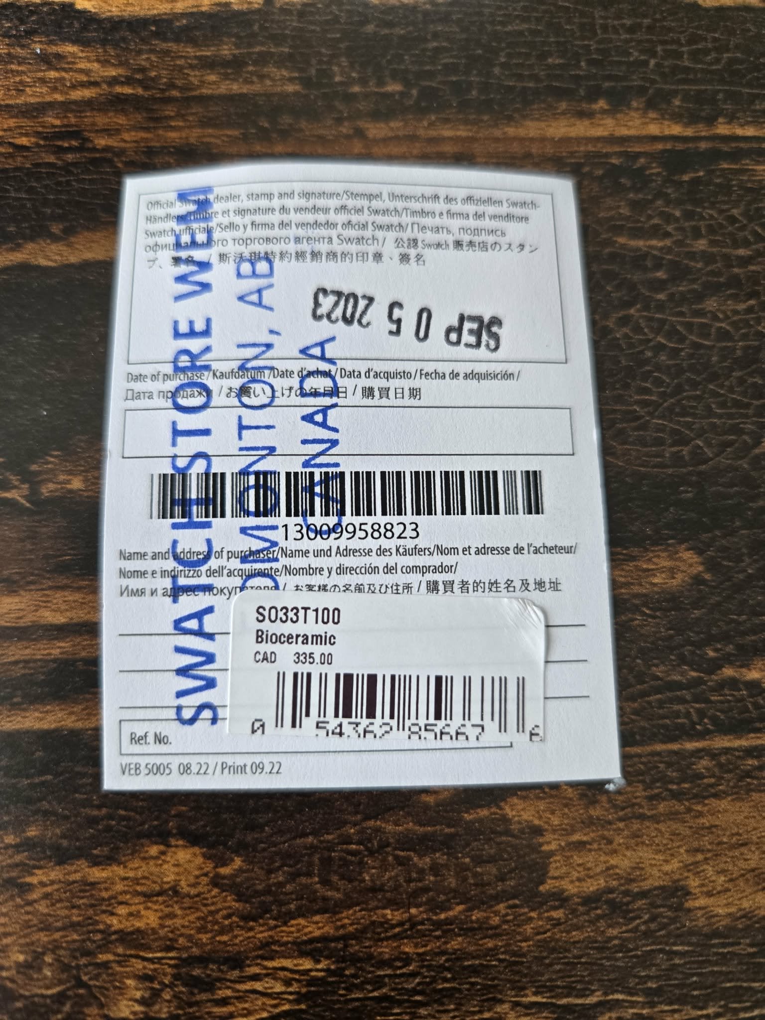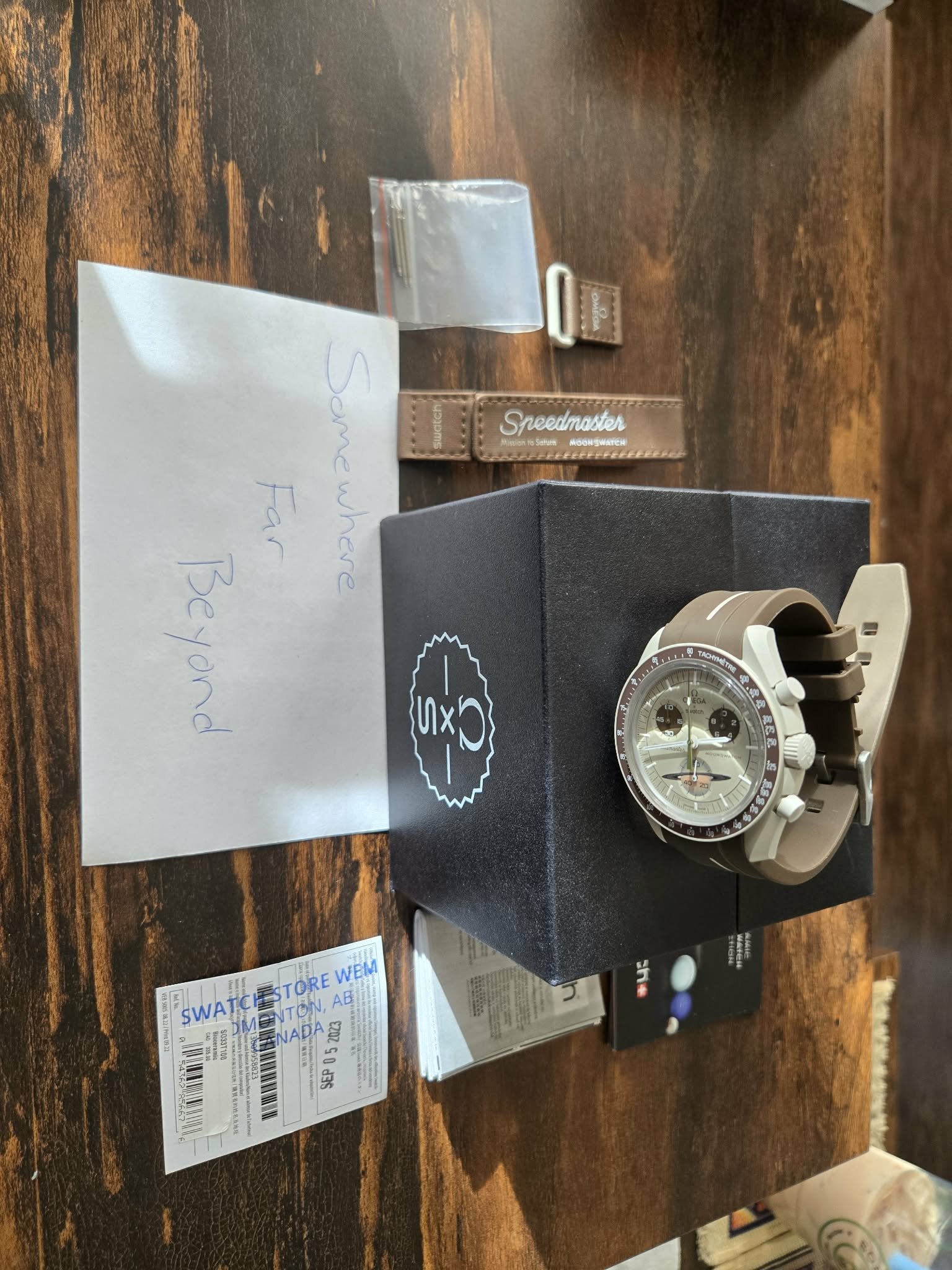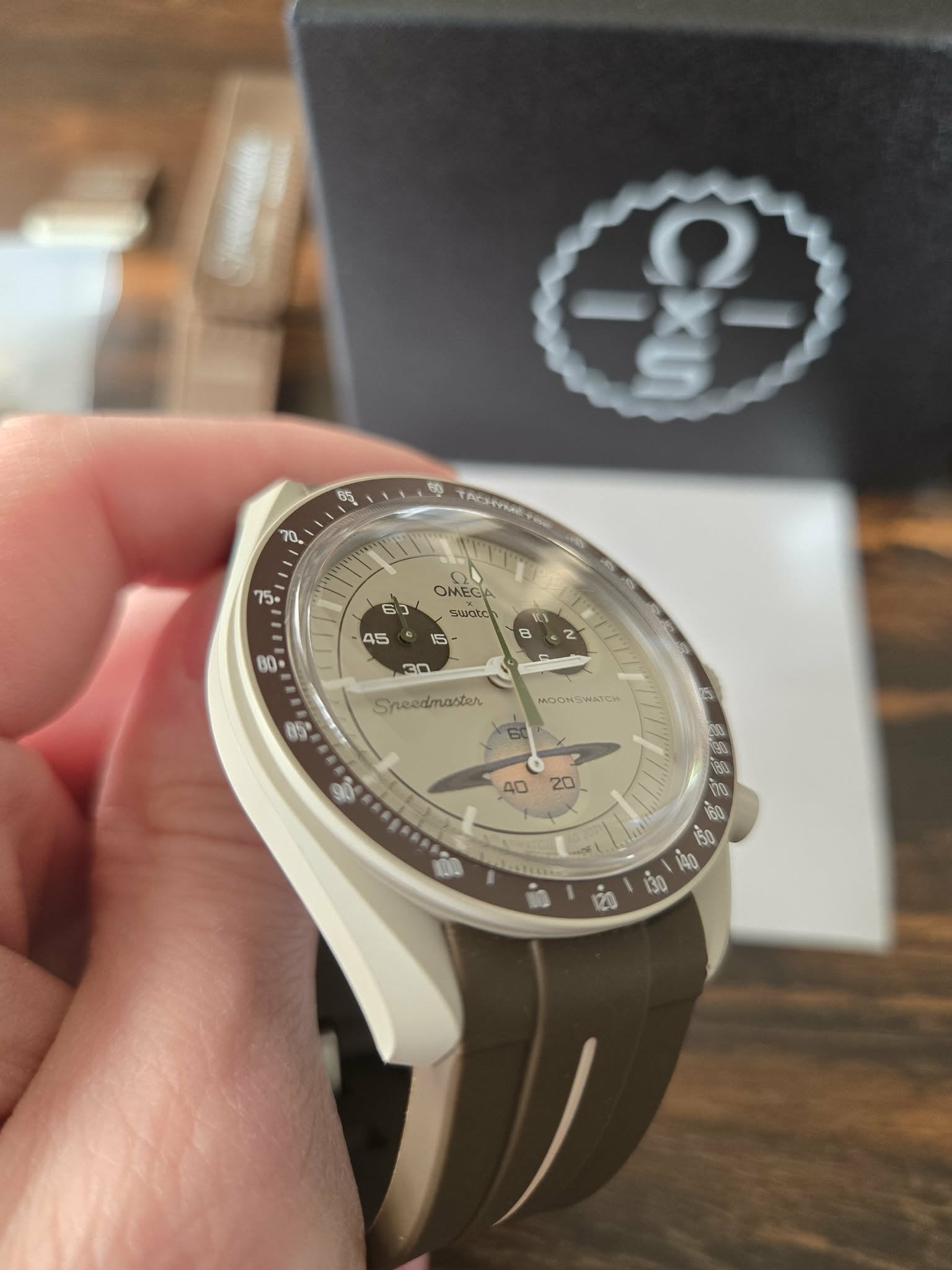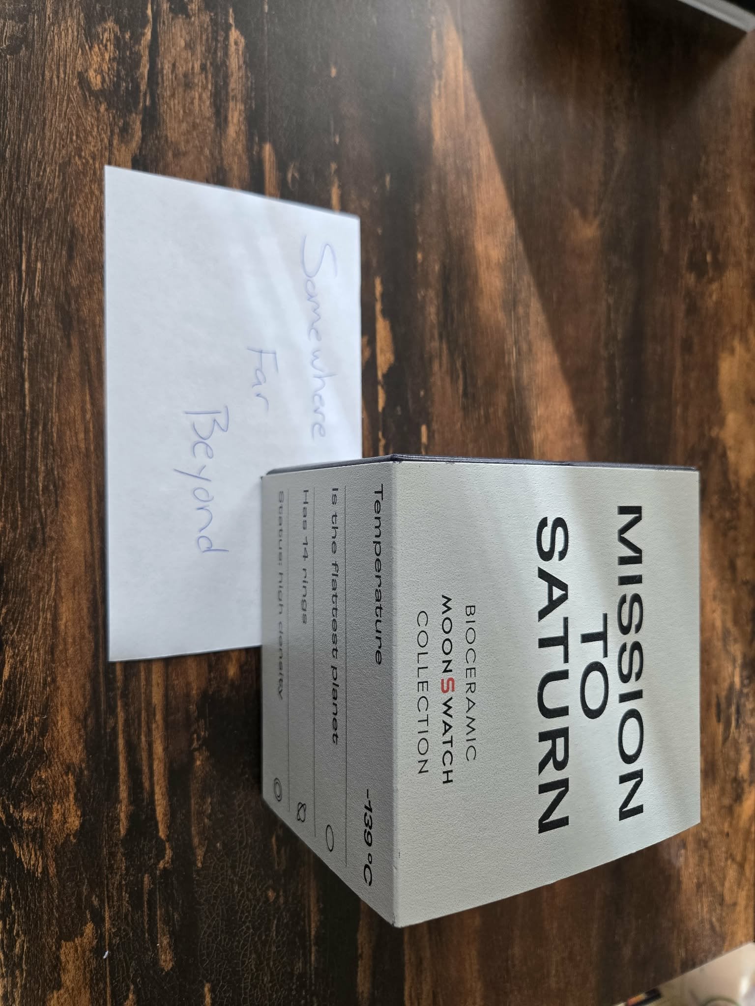 Up for sale is a Mission to Saturn MoonSwatch in excellent pre-owned condition. Light, comfortable bioceramic case with the iconic Saturn colorway and subdial ring. Functions perfectly and has been worn sparingly. It does have a small knock on the front/inside of the bottom right lug, as well as hair-thin micro scratches on the crystal that I could not photograph and can only be seen when the light is just right, not even worth buffing out with polywatch yet. The original strap is unworn, and it comes with an extra strap from Amazon that is fitted to this model.
