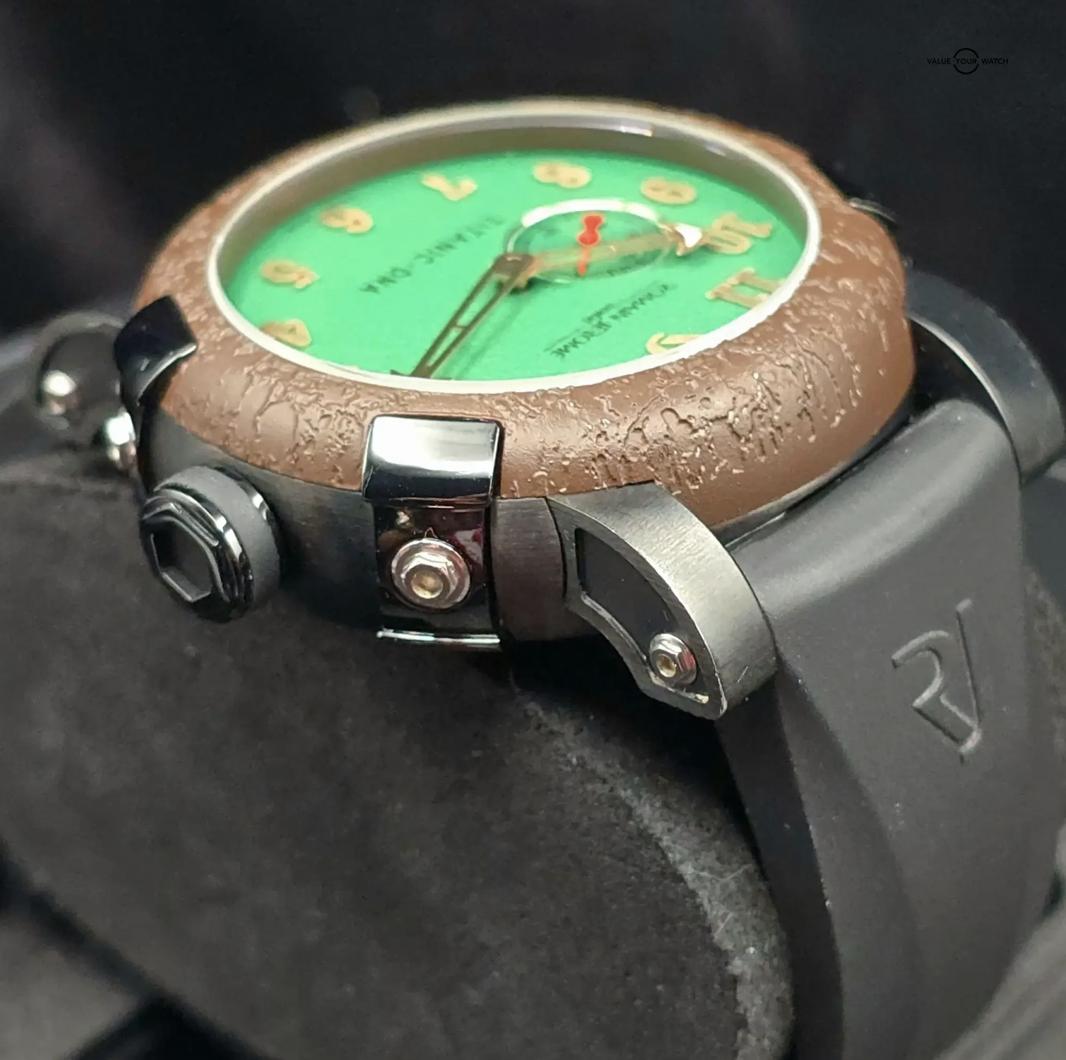 Up for sale here is a very cool piece of history. Of course, we can talk about the green “shark skin” textured dial, the ceramic and titanium bumpers on the corners of the case, or the anchor shaped gold hands perfectly matched to the brushed gold hour indices.