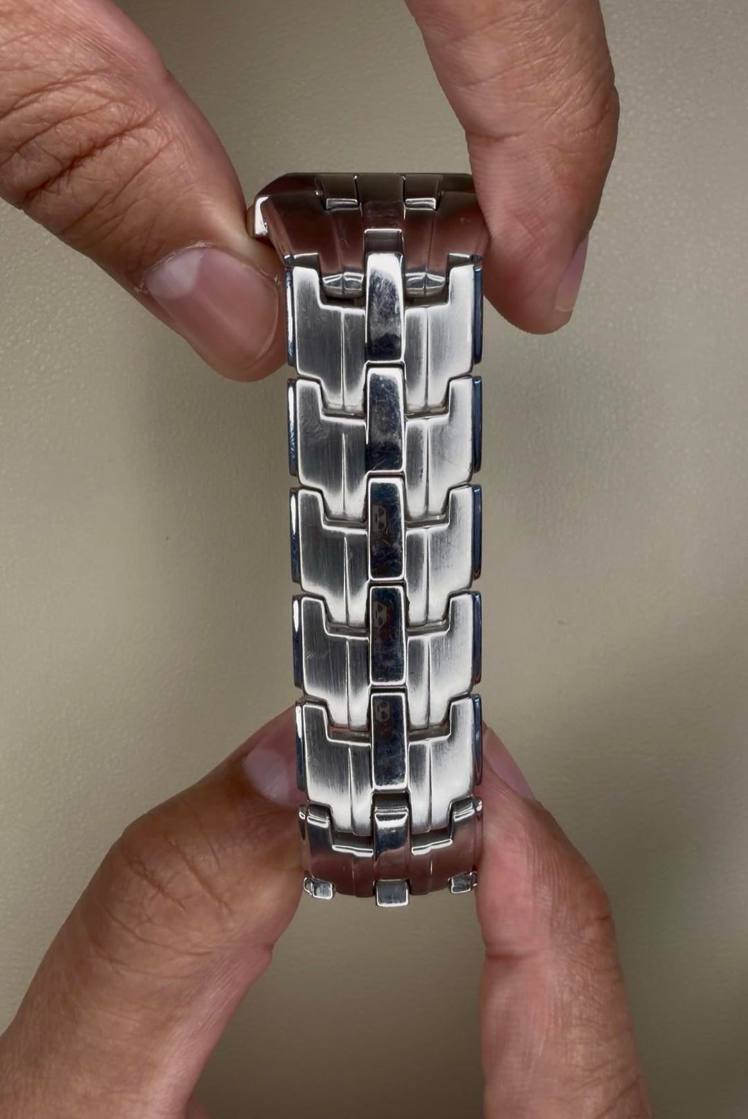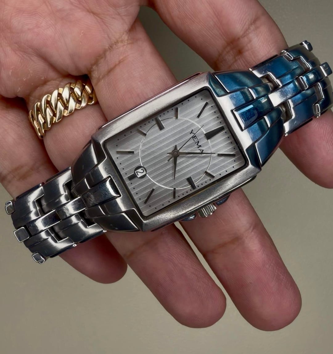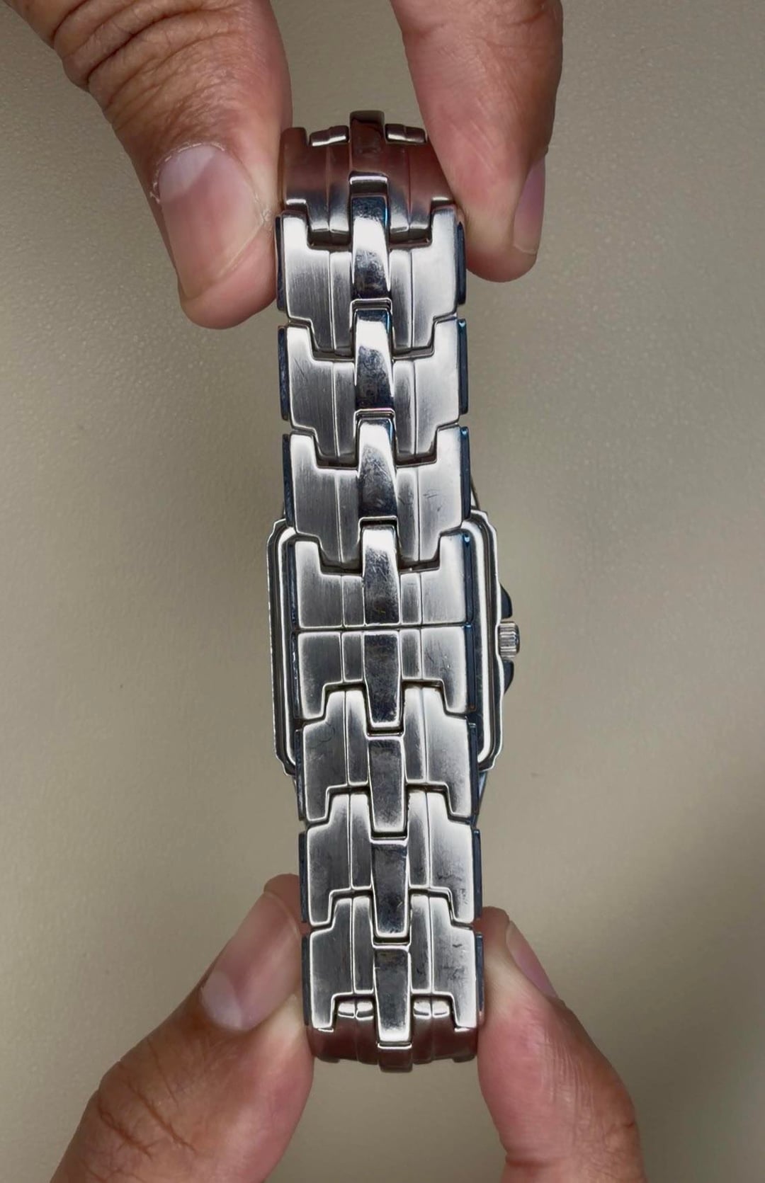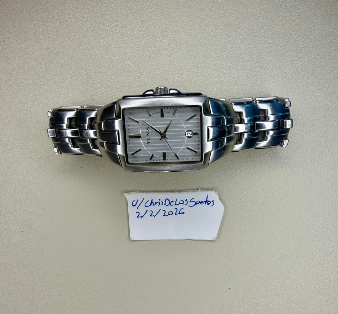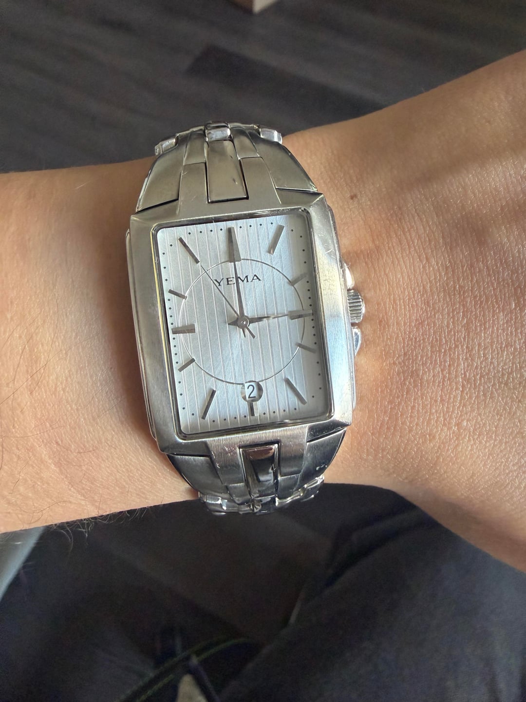 -Details: A beautiful men’s Yema Tank in stainless steel with a silver dial, integrated bracelet, and butterfly clasp. In used condition but is still a beauty! see the photos for yourself! Watch only. This piece is perfect for dressy occasions, or dress it down and wear casually!