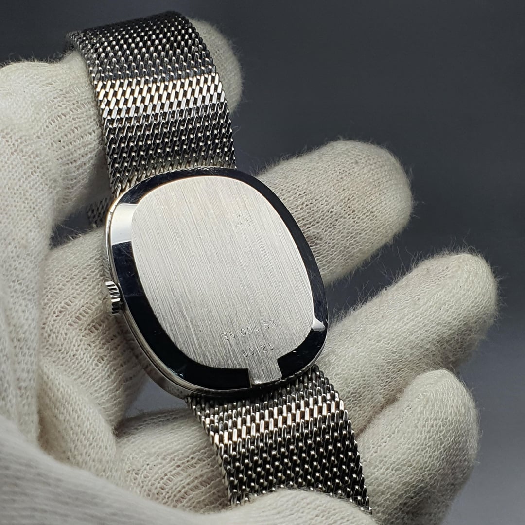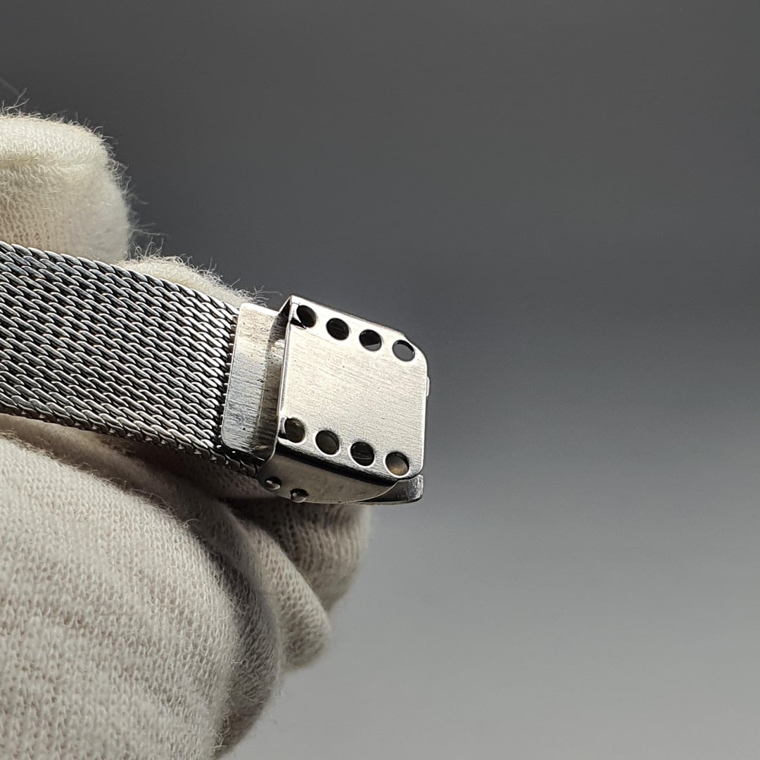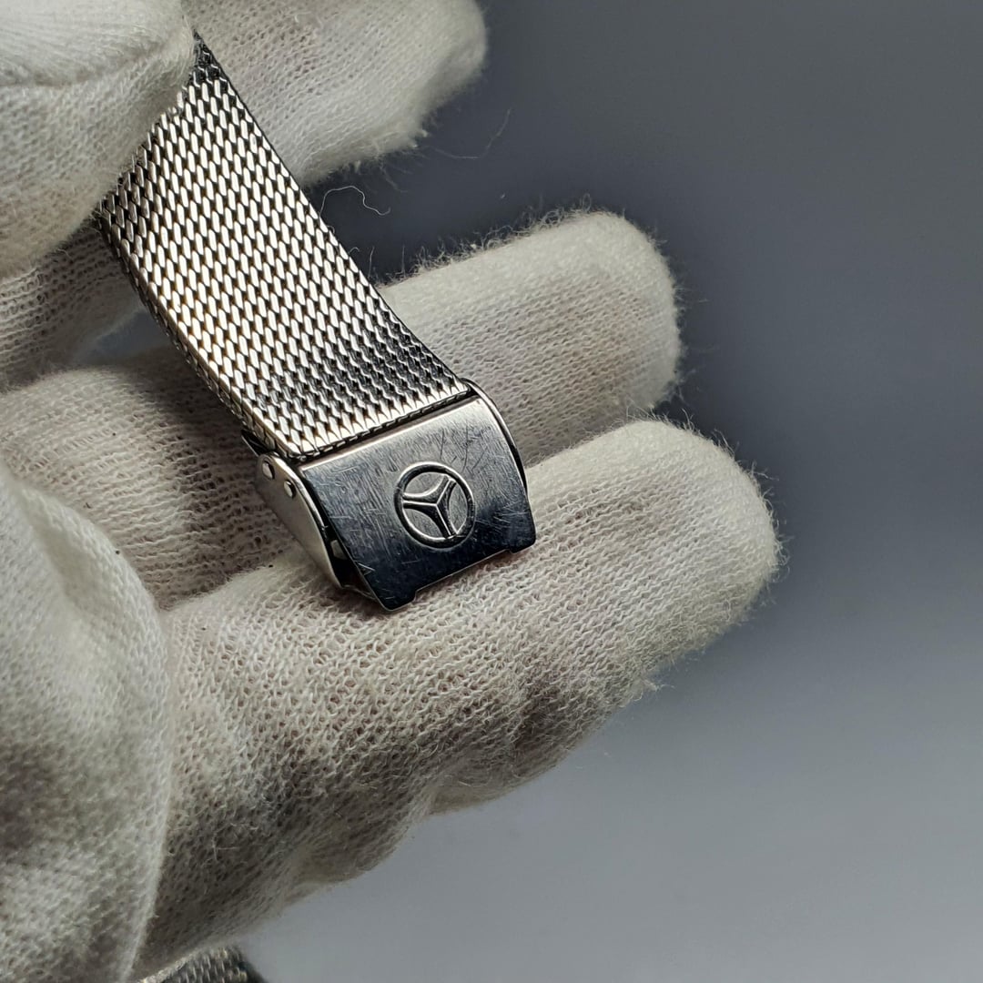 Comes on the original integrated Milanese adjustable mesh bracelet with a signed clasp that can accommodate a wrist size of up to roughly 20cm. It has a matching signed crown with the Synchron logo.