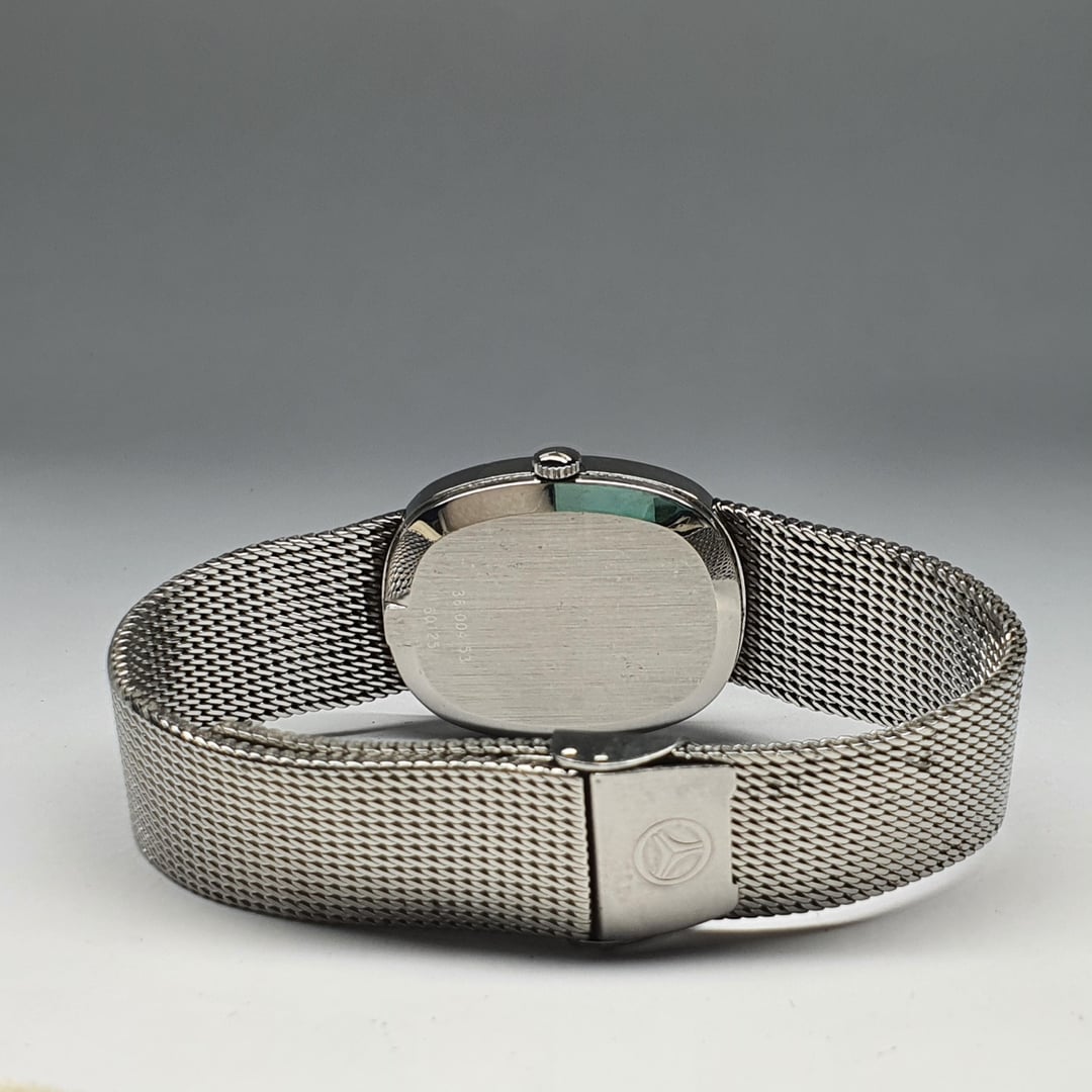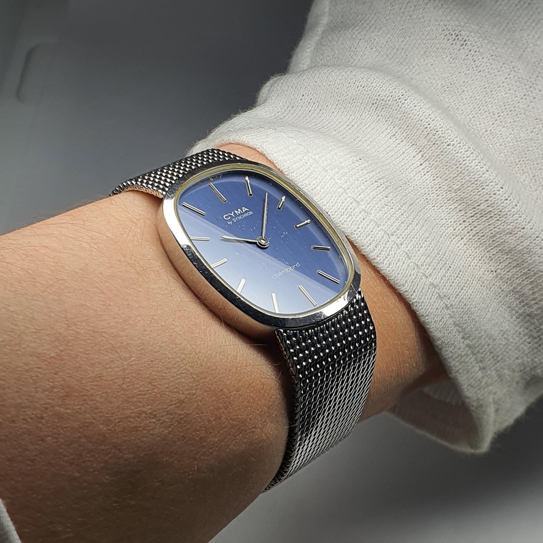 This watch, reference number 36.004.53, was one of the Swiss-made CYMA watches that was produced under the brief ownership of Synchron which makes it an interesting piece of history. The design is very clearly influenced by the Patek Philippe Ellipse (which was arguably inspired by Gerald Genta's design for the Universal Genève Ellipse "White Shadow" just 2 years prior to the PP release), that was popular in the '70s, especially with the blue dial and stainless steel case. The oval elliptical design was made (on the original) with the golden ratio in mind (height to width ratio) as a cohesive harmony.