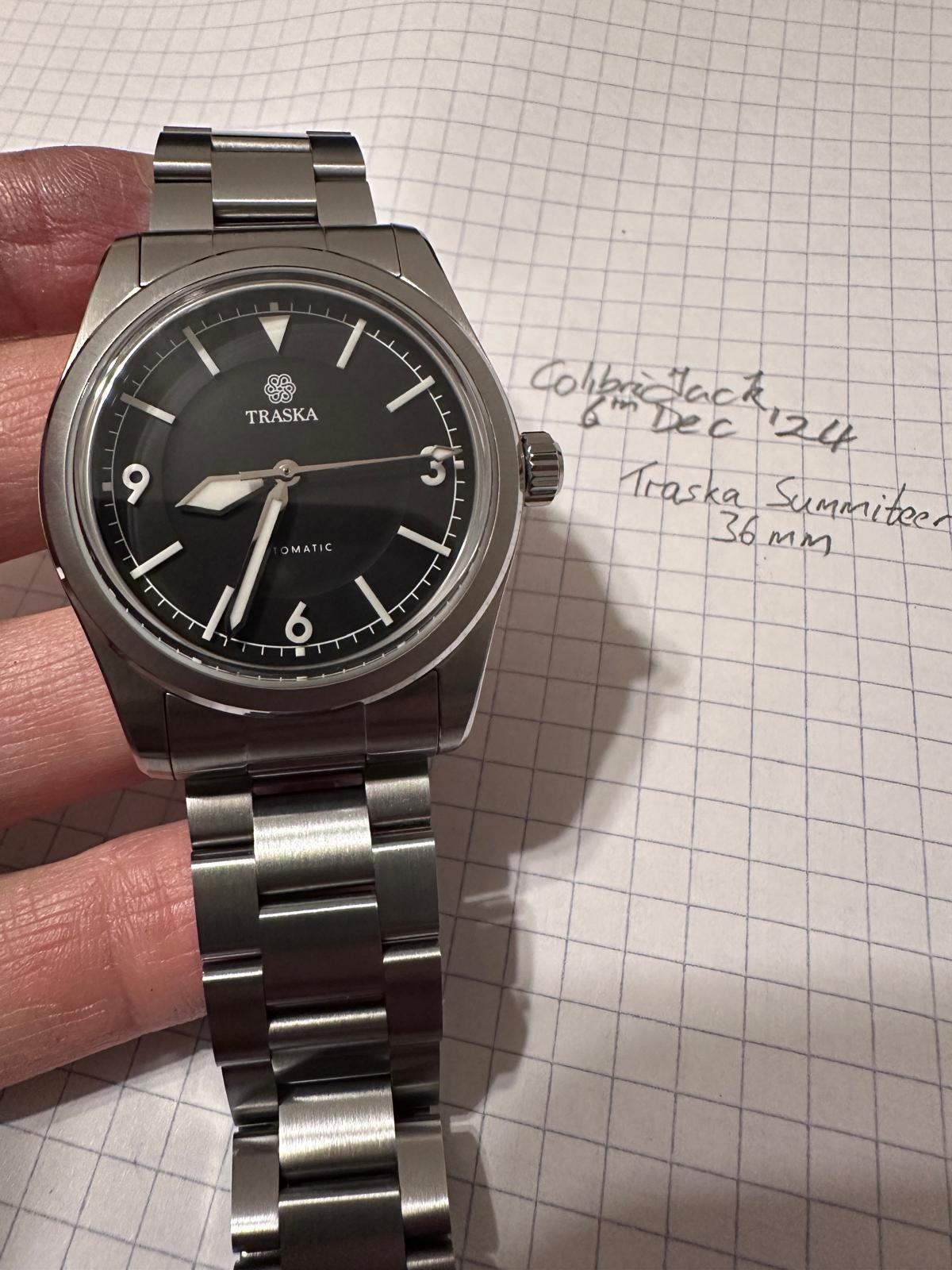 Hi all, Up for sale is this fantastic Traska Summiteer 36mm in Charcoal Black. It's the newest version and about a month old. It's only been worn maybe 7-8 times and is in excellent condition. The watch comes with the full set - box, papers, and all bracelet links. [Album](https://imgur.com/a/rNOEa7p) Price: $495 shipped and insured CONUS only. Zelle preferred