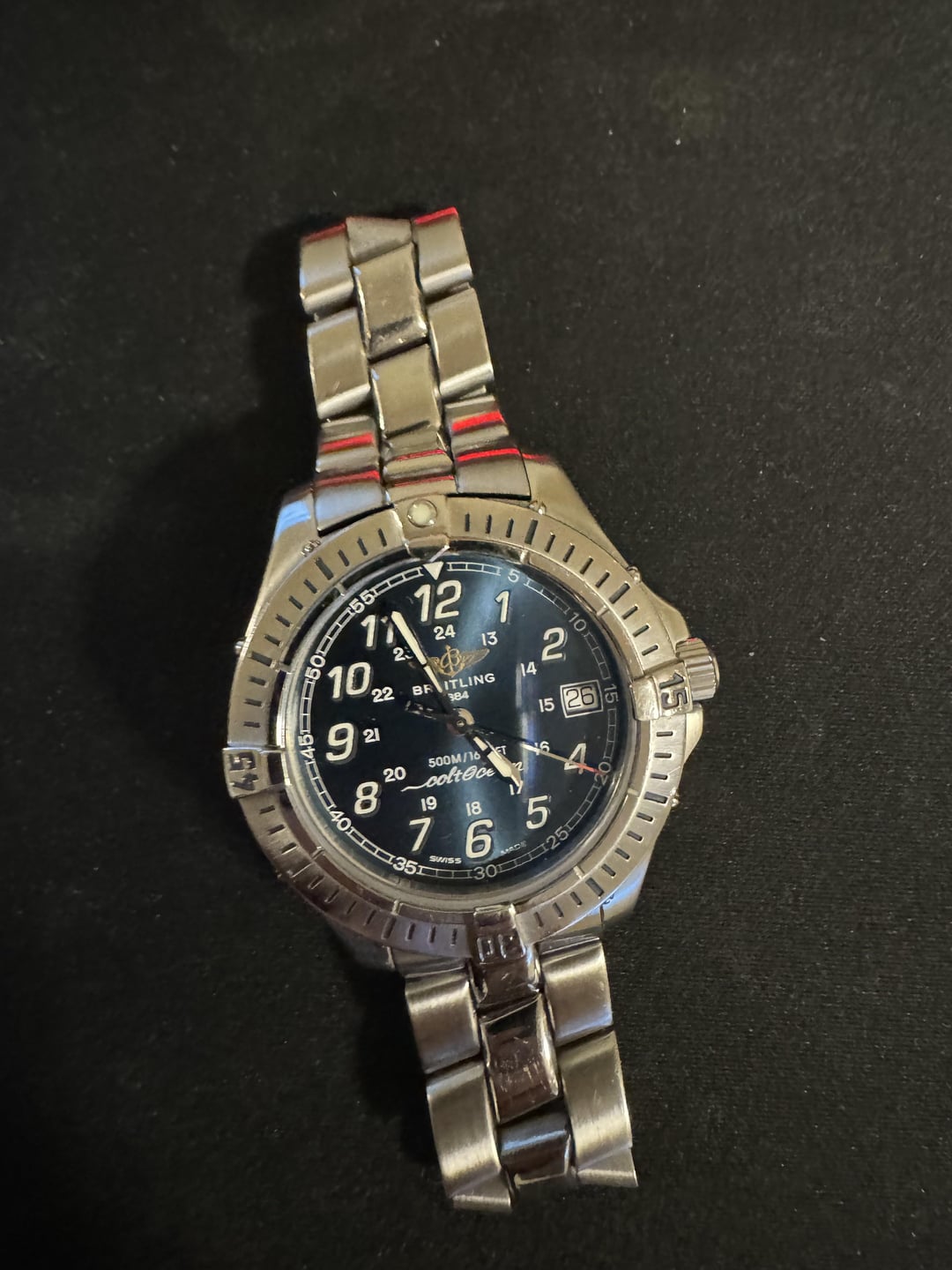Selling my Quartz Breitling Colt Ocean 38mm (A64350). It’s decently scratched up from regular use but nothing too deep that can’t be polished out. It’s been serviced in the past year or so, so it has a new battery and seals and was pressure tested so it’s ready for pretty much anything. Bracelet is currently sized for up to a 7.25 (ish) with two extra links available. Asking $1400 OBO Via PayPal or Venmo F&F or G&S (at buyers expense of fees) or Zelle. Feel free to DM with any questions.
