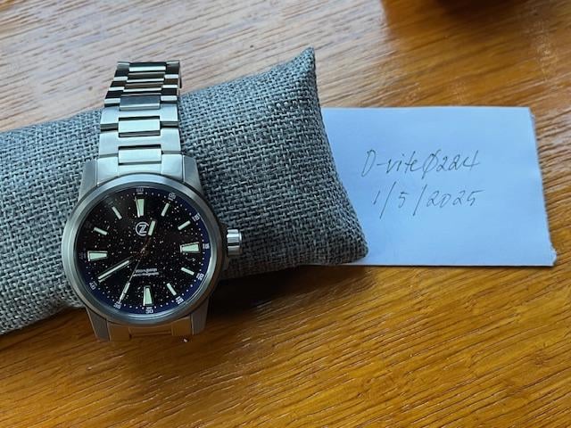 Selling my Zelos Aurora Aventurine Field watch. The watch is in excellent condition. The titanium case and sapphire crystal are unscratched. I have worn this sparingly on a blue leather strap (not included). The titanium bracelet is in pristine condition, and all links are included. It is a QR bracelet and has on the fly adjustable clasp. Like many Zelos models, this has sold out. Also like other Zelos models, the lume is excellent. Additional info from Zelos website: Aventurine glass dial with applied cardinal indices and printed hour markers. Specifications: Diameter : 42mm Lug to Lug Length: 49mm Thickness: 12.2mm Case: Gr2 Ti with 1200HV Hardened Coating Lug Width : 22mm Movement: Miyota 9039 Movement Antimagnetic : 30,000A/m with inner soft iron cage Water Resistance: 200m Crystal: Flat Sapphire crystal with inner AR coating Lume: Superluminova C3 Bracelet: Titanium with updated Quick Adjust Clasp Includes cardboard box, leather travel case, and metal card. The launch price was $559, I am asking $475, which includes shipping to CONUS. I accept PayPal F&F, Venmo, or Zelle. Please add 5% for PayPal G&S. Please let me know if you have any questions. Comment first before messaging me.