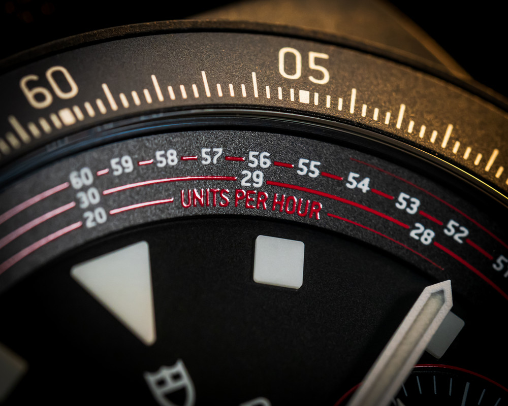 Here we have a stunning all black Pelagos FXD crafted from a carbon composite material making it lightweight but also sturdy. At 43-millimeters, the watch offers great wrist presence without being bulky and the overall black, red, and white motif gives it a youthful and sporty look. The tachymeter scale, specifically calibrated for cycling speeds, is a unique feature that sets this watch apart from other chronographs. It allows cyclists to measure their average speed over a given distance, making it a valuable tool for training and competition 😎
