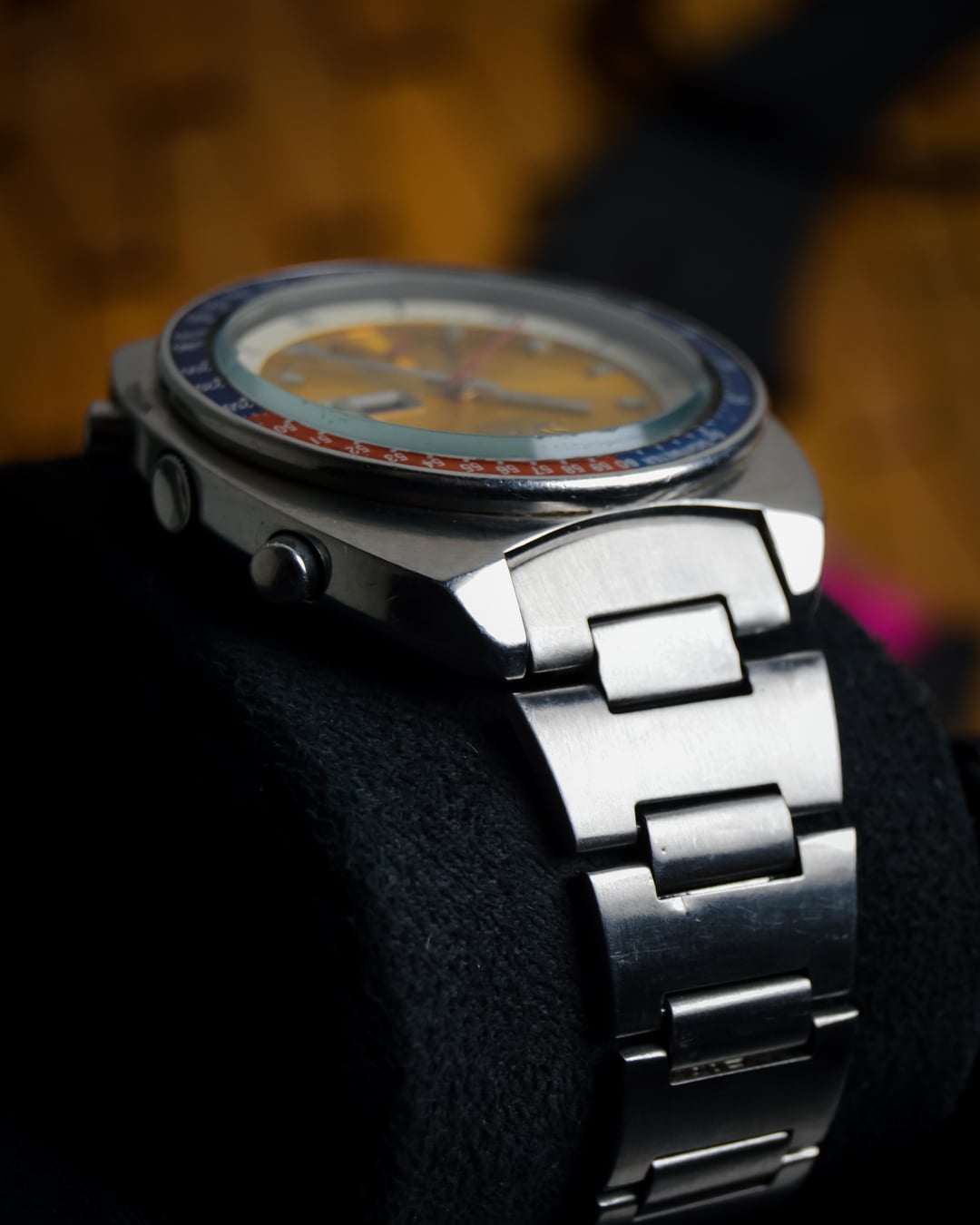 [Timestamp](https://imgur.com/a/c2WFKxk) Step back in time with this iconic March 1976 Seiko 6139-6002, famously known as the "Seiko Pogue." A true pioneer in the world of automatic chronographs, the Pogue gained its legendary status when astronaut Colonel William Pogue wore it during the 1973 Skylab 4 mission, making it the first automatic chronograph in space. This particular example features a rare white inner bezel, rotatable through the crown, unlike the more common tone-matched bezels seen on other variants. This white bezel is a distinctive feature that closely resembles the original watch worn by Colonel William Pogue (picture attached at the end of the album), adding historical significance to its aesthetic. The vibrant yellow sunburst dial paired with the Pepsi bezel exudes vintage charm with a bold presence. Powered by Seiko's groundbreaking caliber 6139, one of the world's first automatic chronograph movements, this watch delivers smooth operation and precise chronograph functionality. The 6139 boasts a column wheel mechanism and a vertical clutch, making it as technically fascinating as it is visually striking. This watch works flawlessly, with the chronograph starting, stopping, and resetting perfectly. Whether you're a collector or a fan of space history, this Seiko Pogue is a must-have. Case Diameter: 43mm Case Thickness: 12mm Lug Width: 20mm Fitted on its original stainless steel bracelet, this timepiece retains its authenticity and is ready to wear. I’m asking $769, inclusive of UPS shipping worldwide. Payment via PayPal F&F or G&S (+4.5% for international G&S fees). Feel free to reach out for a custom timestamp or with any questions. Own a piece of horological and space history with this Seiko Pogue!