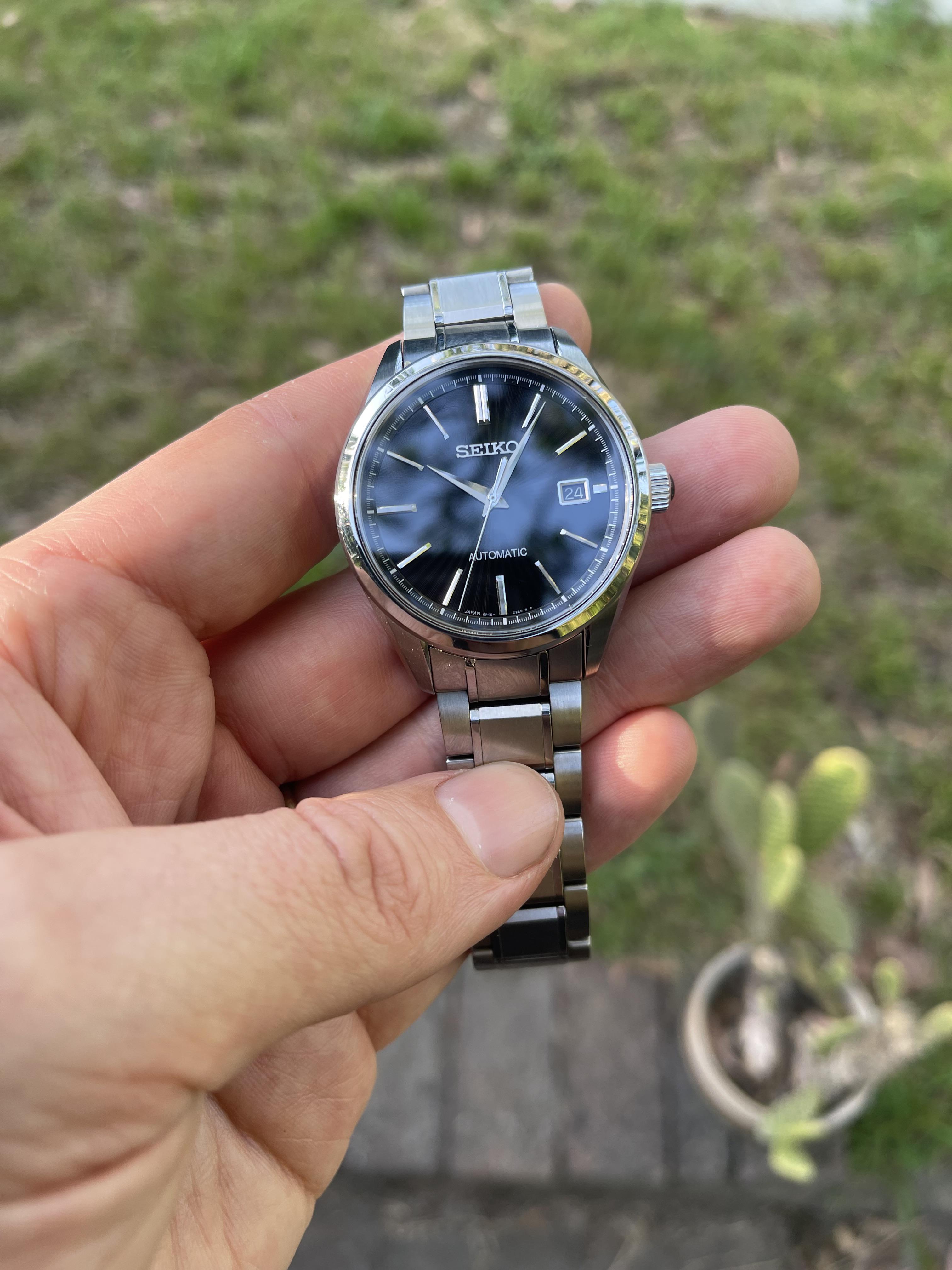 These rare JDM Seikos really do earn their 'baby Grand Seiko' reputation. The case is well machined and polished, the bracelet is solidly constructed but really the main event is that radiating black dial, it's subtle on the black version but lovely. The hands are differentially polished and brushed for legibility, and the indices have micro grooves for extra light play. Overall it's 70% of a GS for 10% the price. \*\*Condition:\*\* Case: nice shape, a few nicks here and there on the case sides but nothing terrible. Some swirls on the polished sides as expected from a used watch.Dial, hands and indices are perfect. Crystal has had the outer AR removed. \*\*Specs:\*\* Case: 40.5 x 48 x 11.5mmLugs: 20mmBracelet: see photo + one extra link, which I believe makes it a full set.Movement: the venerable 6R15, this one is running very nicely at approx 5 spd. **$300 shipped anywhere. Super Cheap!** Images, Timestamp and Video: [https://imgur.com/a/h6euZtt](https://imgur.com/a/h6euZtt)