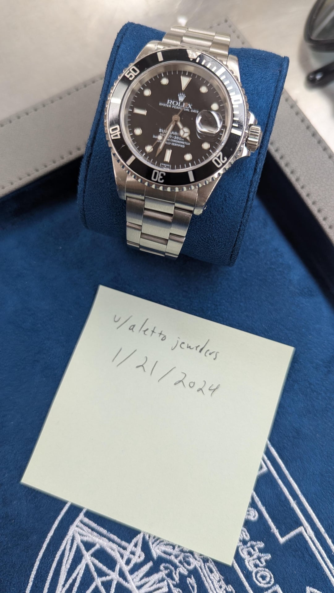 We’re trying to get some traction here on Reddit, so today we are posting an exclusive deal here on r/WatchExchange. We’ve posted on our other social media about this deal to offer this exclusively to Reddit users, so please DM us here on Reddit if you’d like more info on this watch. A timeless icon from Rolex: the 2002 Submariner (Ref. 16610). A hallmark of dive watch design, the 16610 combines enduring style and robust functionality, carrying on the Submariner’s storied legacy. Price **$7,400** Firm Case * Material: 904L Stainless Steel * Diameter: 40 mm * Thickness: \~12.7 mm * Crystal: Sapphire with Cyclops lens over the date * Water Resistance: 300 meters (suitable for diving, but routine pressure testing is recommended if frequently exposed to water) Movement * Rolex Calibre 3135 (Automatic) * Power Reserve: \~48 hours * Timekeeping: May vary slightly based on position and daily wear habits Shipping * Domestic (USA): Complimentary FedEx Priority Overnight (Morning Delivery) Payment Methods * Wire, Zelle, and all major credit cards Service History The watch has been inspected to confirm it is in working order. There is some roughness to the watch and it has been worn with a lot of love in the last two decades. The crystal has a scratch and the case + band has scratches and the bezel has signs of wear as well.. Crystal can be replaced on request with an original Rolex crystal, and polish can be done as well but I personally would leave it as is with its storied past worn with pride. Any routine maintenance or servicing is covered under a two-year service warranty (details available upon request). About Us Aletto Jewelers is a family-owned business with five generations of heritage, offering a selection of premier watch brands, GIA-certified diamonds, and estate jewelry. For over two decades, our showroom in the heart of Boca Raton, Florida has showcased timeless pieces with enduring style. Our commitment to quality and impeccable craftsmanship informs everything we do, ensuring that each piece you select meets the highest standards. Please follow us on Instagram, Youtube, or Tiktok if you’d like to see more of our selection: * [https://www.](https://www.tiktok.com/@alettojewelers?lang=en)[instagram.com/alettowatches/](http://instagram.com/alettowatches/) * [https://www.tiktok.com/@alettojewelers?lang=en](https://www.tiktok.com/@alettojewelers?lang=en) * [https://www.youtube.com/channel/UC83BfOrE3zlpyk9kg5dSJjg](https://www.youtube.com/channel/UC83BfOrE3zlpyk9kg5dSJjg)
