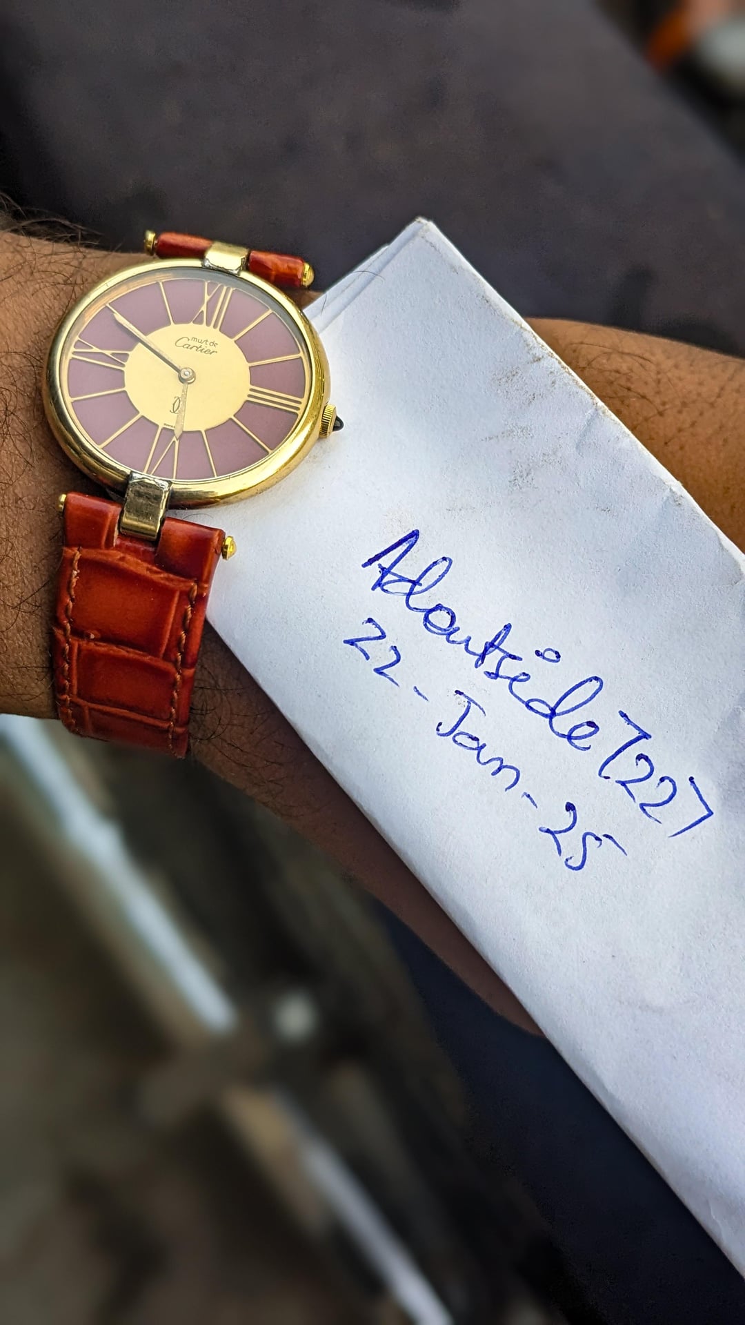 Hello , watch fam today I am here with a very rare burgundy dial Cartier must de Ronde 925 vermeil case watch . watch have aftermarket strap and buckle . overall condition can be seen in pictures. only watch no box and card . A rare and interesting burgundy dial and gilt Roman numerals. The way the numerals are arranged is like a spider's web, hence the nickname for these coveted dials. Reference: Ronde 1709 Movement: Swiss Quartz Cal. 81 Age: 1991/2000 Specific Age: Circa 1990s Case Size: 30mm approx Case Thickness: Lug to Lug: Lugs: 16mm approx Condition: Pre-Owned Box & Papers: No Case Material: 18ct Gold over 925 Sterling Silver Gilt Bracelet: aftermarket price 760$ Note: we have done 150+ transactions on watchexchange refer to sold posts for reviews and dm us to check recent reviews. delivering the finest collection of vintage watch worldwide . Watch(es) listed will be in as is condition, all marks and scratches are shown in the video before shipping mknPlease note this is a vintage watch and I ensure the operation before delivering to confirm watch is in working condition for daily usage, Incase of any issue please make video of unboxing to raise any concern- if unboxing video won't be provided I won't be able to help . watches listed are for daily usage operation with no service history and timegraph accuracy data No service or repairing cost will be provided to the buyer unless it is received in non operational condition which will be evident in the unboxing video . with regards to Force Majeure (stuck at customs, parcel lost etc)refund will be provided if occurrence in seller country and only assistance will be provided for occurrence in buyer country as it is not in my control In any other country apart from mine