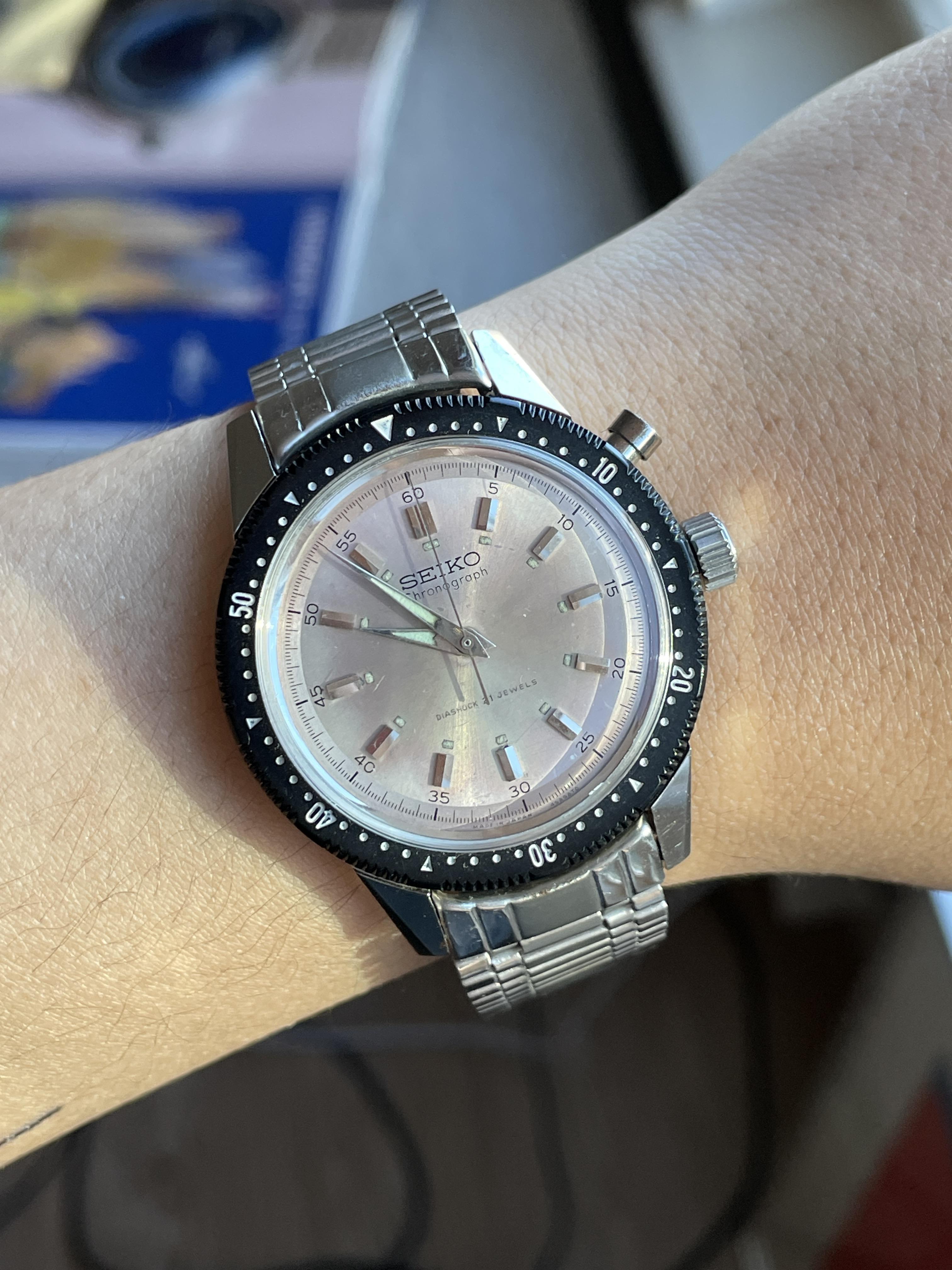 Hey Reddit, up for sale is a vintage Seiko icon. This piece is the 5719-45899 monopusher chronograph. This is the very first chronograph movement produced by Seiko, in commemoration of becoming the official timekeeper of the 1964 Summer Olympic games held in Tokyo. This chronograph is unique in that it has a monopusher which starts, stops, and resets the chronograph seconds hand. The first Japanese timepiece with a stopwatch complication, the "Crown" moniker is inherited from the hand-wound (non-chronograph) piece of the same name which this movement is based on. This piece is incredibly hard to come by in this condition. The plastic bezel is in immaculate condition, and the lume plots are all intact. The dial has developed a warm rose or salmon toned patina. This example has just been serviced and is running at around +6 seconds per day. The chronograph function is working properly and resets to 12 o'clock. Imgur & Timestamp: https://imgur.com/a/NBIrrgy Price: ~~$1850~~ $1725 USD OBO Condition: Excellent vintage condition. Few marks on crystal and case. Caseback still retains Olympic torch inscription. The dial has developed a slightly salmon colored patina Shipping: Free 2-day insured & tracked shipping to CONUS. International shipping available. Comes With: Watch, Bracelet, Generic Vintage Seiko Box
