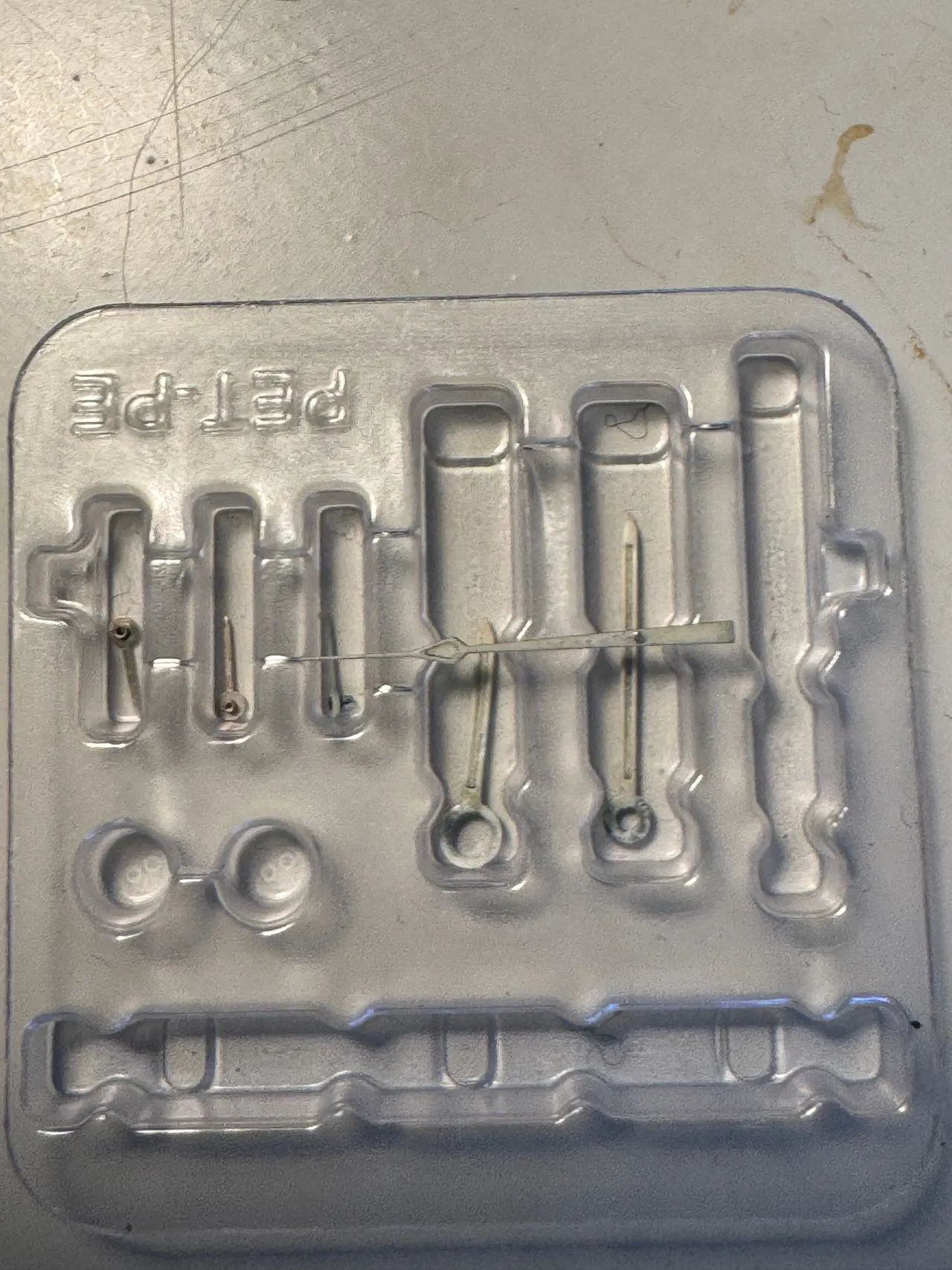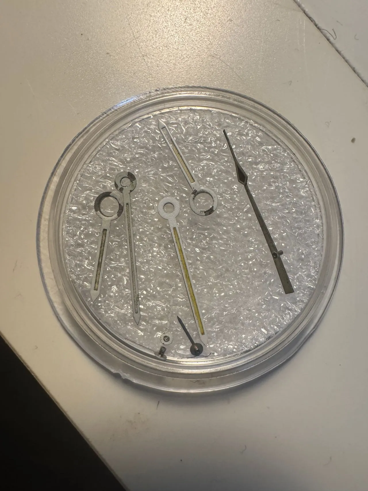 These are the hands that were removed during service - they are included but should be kept in the drawer, as the lume is loose, and they are damaged and "repaired" with paint blobs here and there.