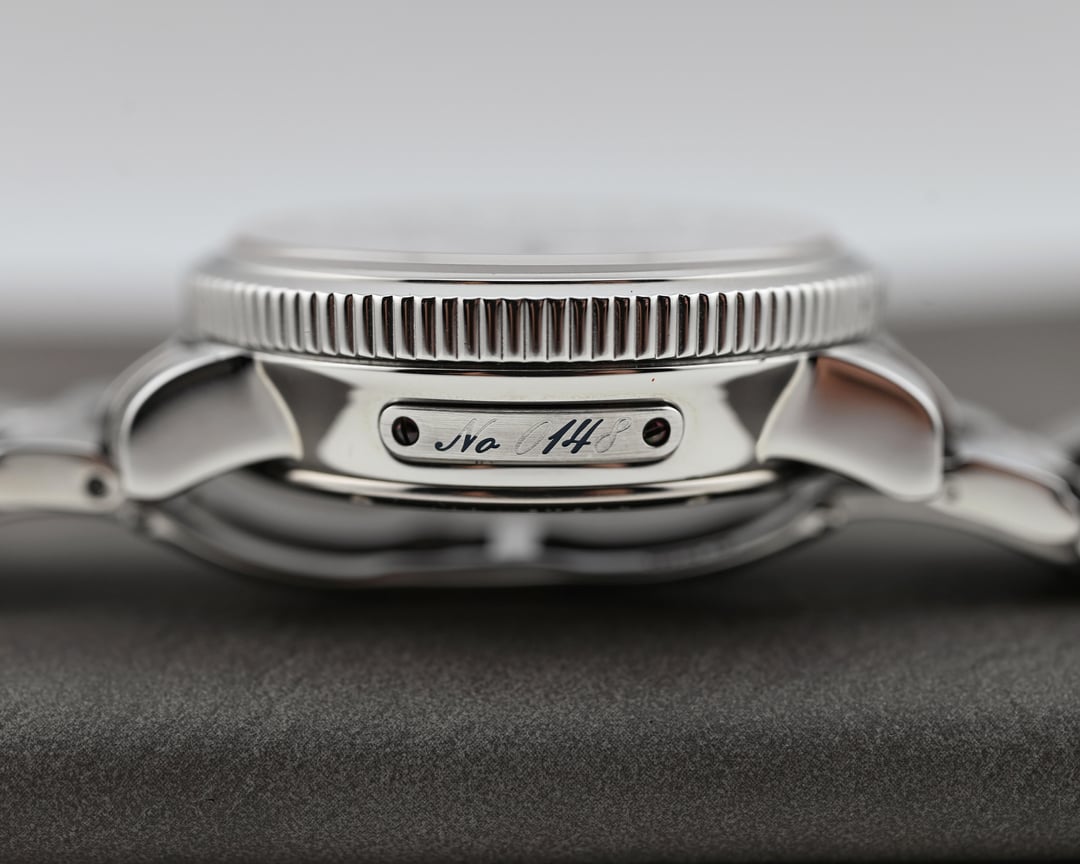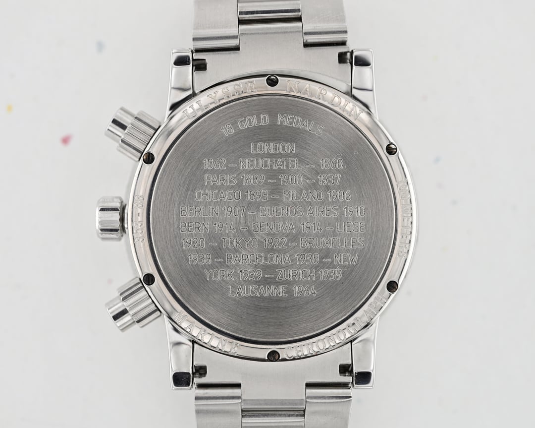 The Ulysse Nardin Marine Chronograph celebrates the brand’s 18 gold medals in chronometry by making a watch that really doesn’t cut any corners with a ton of attention clearly paid to every detail. It’s truly a watch where the more I learn about and examine it the more impressed I am by just how much watch it is. It is extremely detailed and well executed throughout and I will attempt to call out some of those details, but I would be remiss if I didn’t also point you in the direction of this old timezone review written by Michael Disher that really does a great job of highlighting the details and intricacies. Case: The 40 × 43.25 × 13.5 mm case is extremely sporty, practical with 100 meters of water resistance and screw down pushers, wearable with the short downturned lugs and smaller titanium caseback, and very well refined with consistent polishing throughout, a very refined coin edged bezel, a robust and refined bracelet with locking butterfly clasp, and no shortage of heat blued treatments throughout, including the caseback screws. Dial: The milky and very subtly textured white/silver dial is extremely legible and continues to impress the more you view it. The large applied Arabic numerals are treated to the same deep heat blued finish as the hands and signature, the tachymetre scale is neatly applied to the angled rehaut for maximum legibility and dial cleanliness akin to the original Heuer Carreras, and the 4:30 date is very discrete and well executed as to no be an eyesore. I particularly love the handsets: The hour and minut hand are simultaneously, elegant, classic, and sporty with a unique shape functional lume, the chronograph sweep seconds hand is treated to the same heat blued application and features a sporty red tip for increased legibility, and the chronograph counter hands have this very cool and sporty red, lume-filled treatment reminiscent of those from 1960’s Universal Geneve chronographs like the Nina Rindt. The running seconds at three is differentiated by a single heat blued stick hand that I think works really well with the overall legibility and consistency of the color scheme. The applied anchor logo in the signature is the cherry on top. There is a lot going on in this dial, so many little details, but what’s perhaps most impressive is that it remains extremely clean and very legible. Movement: The UN-35 movement is a modified ETA 2892-A2 treated to an upgrade in finishing. Currently running exceptionally well at approximately -1 s/d across six positions and all functions working properly, truly honoring the 18 marine chronometer medals. Bracelet: Extremely comfortable and high quality bracelet with butterfly locking clasp that will fit an approximate 7.25" wrist. Includes: Full set including outer signed box, inner wooden box, documents folder with manual, service booklet, hang tag, extra unsigned leather strap and deployant, and card dated March 29, 2004. Price: $3300 including insured shipping within the continental US, international shipping available at cost. Shipping from Phoenix, AZ. ACH or Wire only, no trades please, I have references here, forums, eBay, and Instagram (@)meticulist. There aren’t many chronographs that have this degree of functionality and usability, especially at this price point, and especially with this degree of finishing and attention to detail.