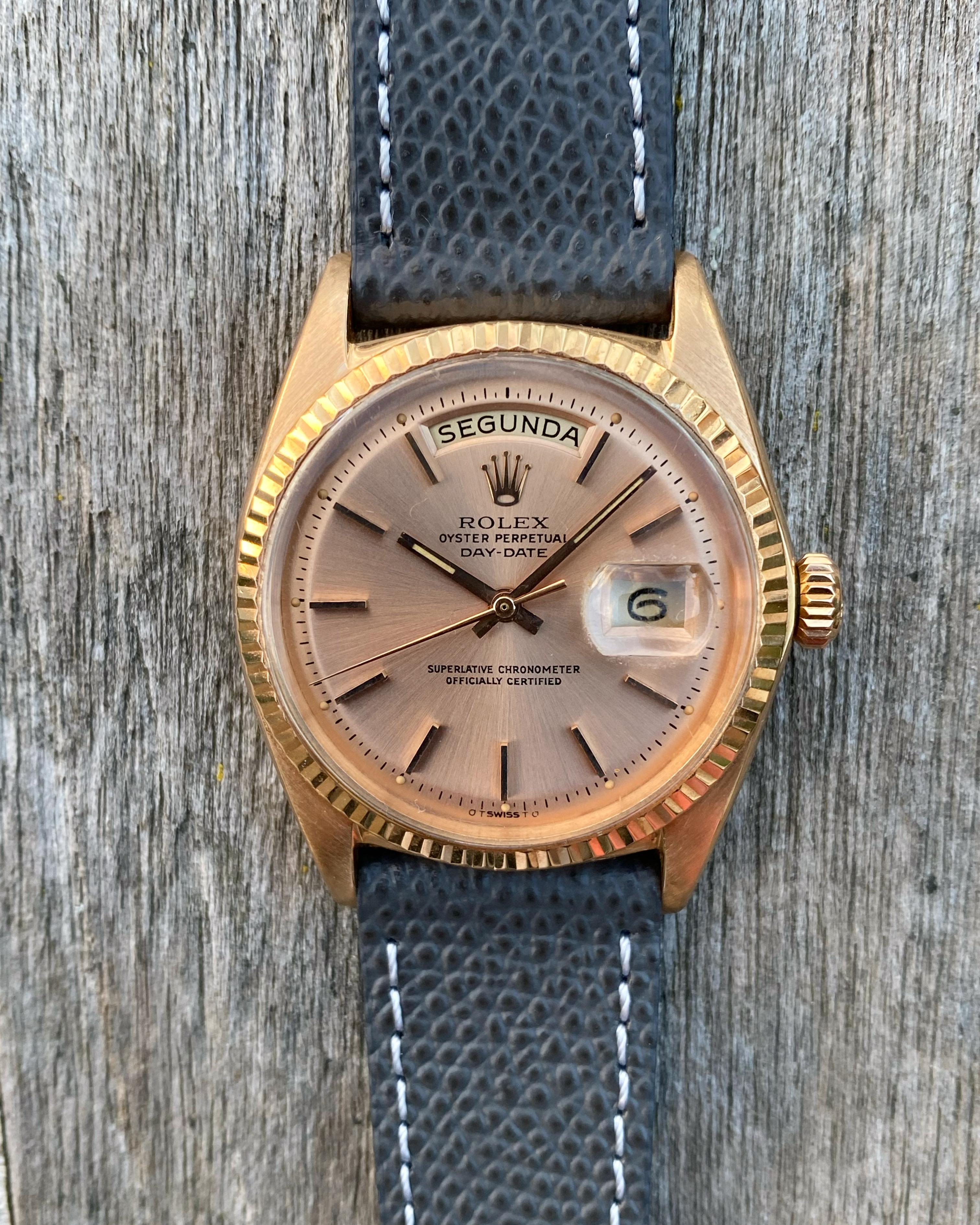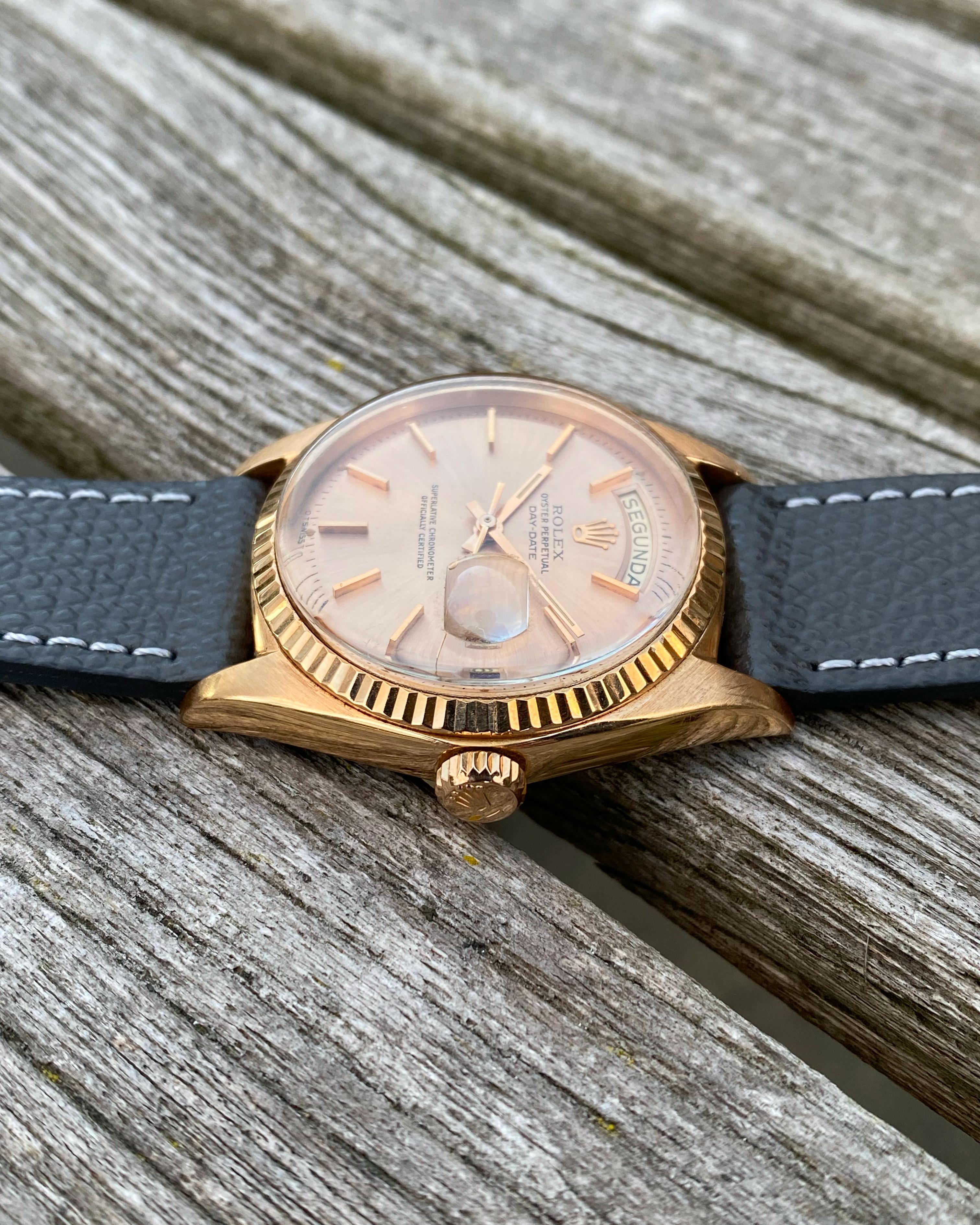 The Rolex features a brushed rose gold case, which is accented by a fluted rose gold bezel. The Day-Date is mounted on an unworn quick release Asphalt Gray crumbs calfskin leather strap from Hide and Alloy, which is secured by a gold Rolex tang buckle. The Rolex features a rose gold sunburst “Sigma” dial with applied polished rose gold stick hour markers, polished rose gold tritium-coated hands, a magnified date window at 3 o’clock, and a day window at 12 o’clock, complete with a Portuguese date wheel. The tritium lume plots and hands have acquired an even custard colored patina with age, which beautifully accent the rose sunburst dial.