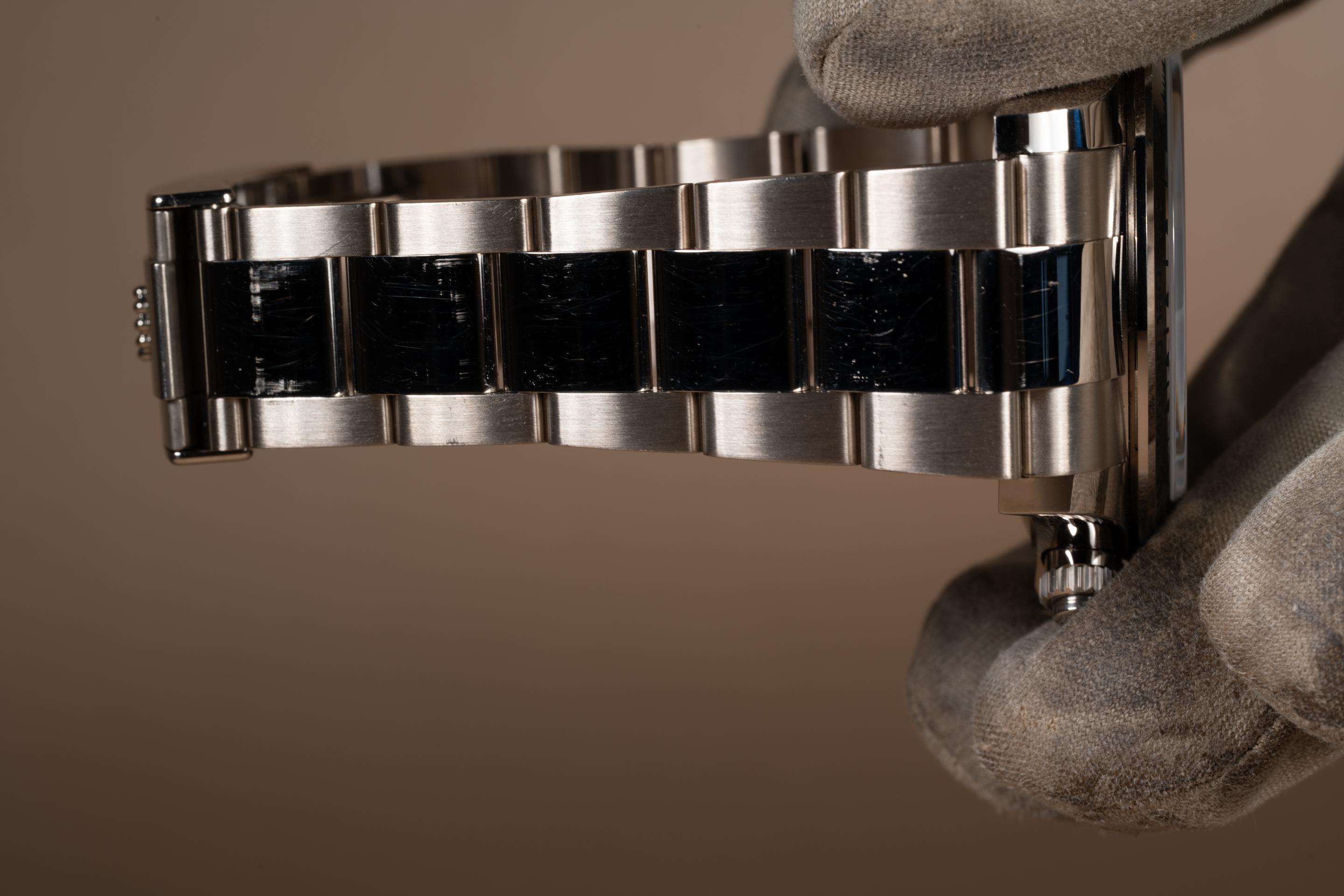 Description: Case: The thick and even 18k white gold case is excellent showing some light wear from use. Their 18k white gold bezel is also in excellent condition showing some light wear from use. Dial: The glossy black diamond dial is mint and the original factory hands are matching. Bracelet: The 12 link 18K white gold Oyster bracelet is excellent showing no perceivable stretch. Accessories: Papers.