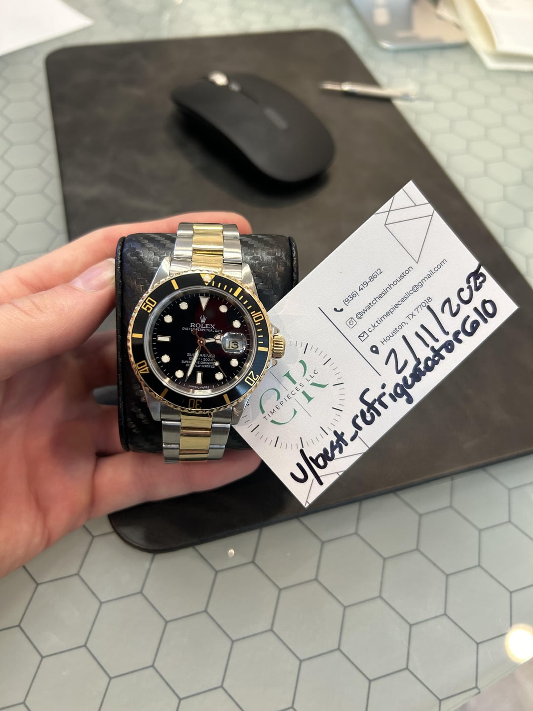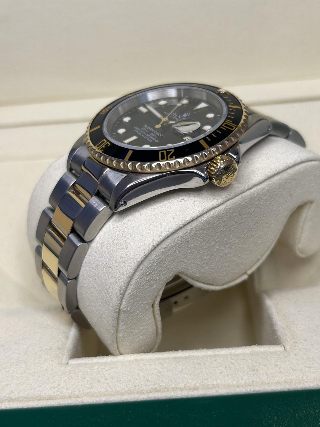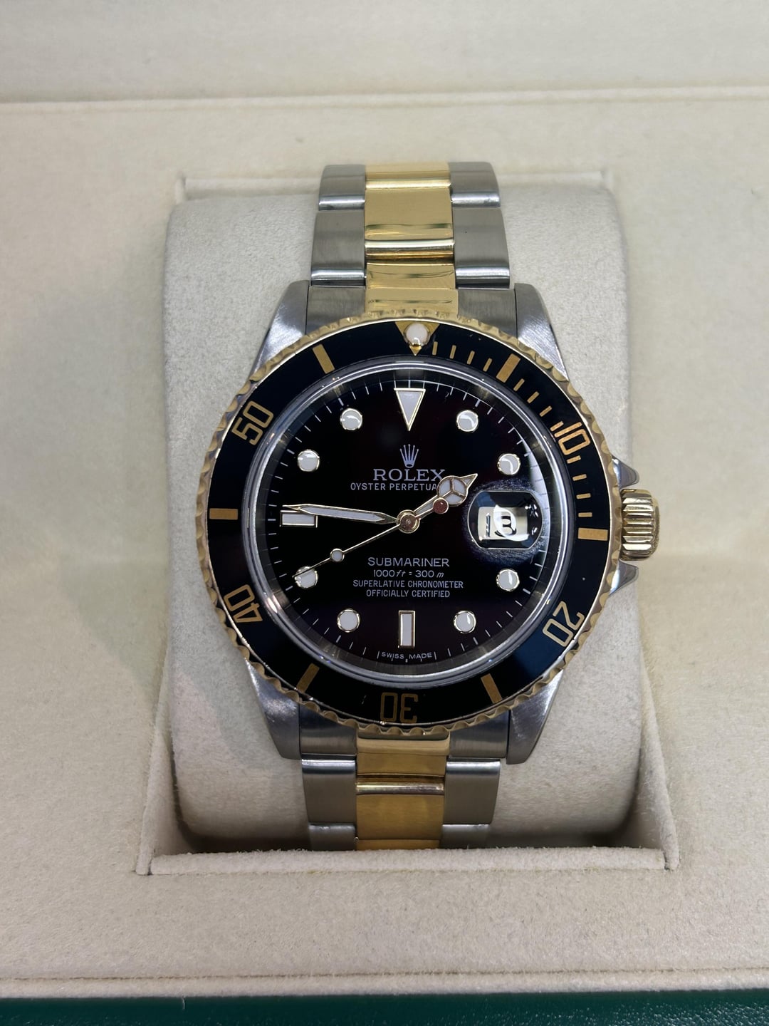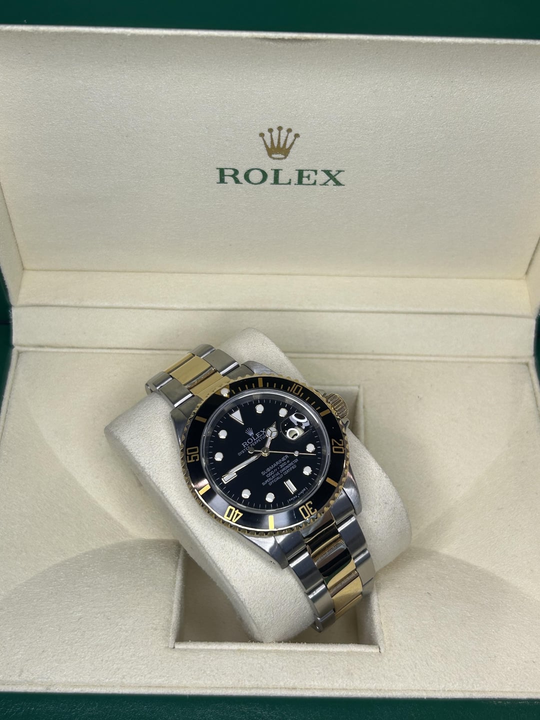 Reference 16613 Rolex Submariner date black dial 18k YG/ SS 40mm U serial (produced in 1997-1998) Comes as watch only with 3 screws and full divers extension Watch is pre owned and shows signs of wear. Bracelet has a small amount of stretch in it, still wears very nicely Swiss made dial and the hands, show no signs of wear or aging. Bezel insert has a very small hairline around 6 oclock. Hard to see Watch running perfectly (+1/280amp) Overall solid unit Asking $8,000+ shipping or $8,050 my overnight insured label. Located in Houston Tx Instagram