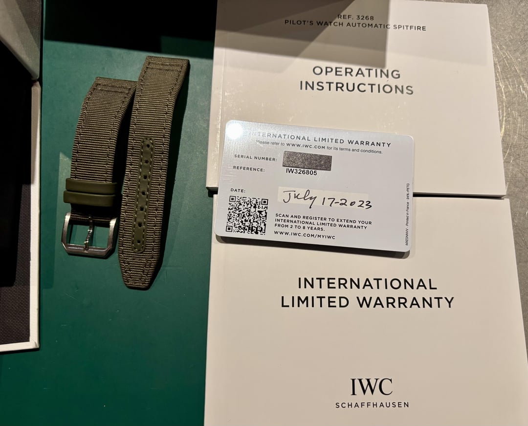 Happy Valentine’s to my fellow IWC lovers out there. I’m letting go of my Spitfire IW326805 with the caliber 32111 movement that has 120 hours of power reserve. The previous owner fitted the watch with the MarkXVII bracelet which is just awesome. The on-the-fly micro adjustment on the clasp is the best in the business. The finishing on the bracelet is finely brushed except for a polished beveled edge on the side of the outer links with matches quite nicely with the polished beveled edge on the case lugs. There are a few swirl marks on the clasp as well as some light scratches on the 7 o’clock lug which I tried to capture in the photos. The green textile wristband is from IWC, but I think the buckle is not original from the previous owner. It’s has the same Iwc buckle shape, but does not have the Iwc stamp on the buckle. Asking $4300 shipped to you in CONUS. PayPal FF. Zelle, or Wise. Feel free to ask any additional questions. Additional photos and wrist roll: https://imgur.com/a/Fpj2uYp