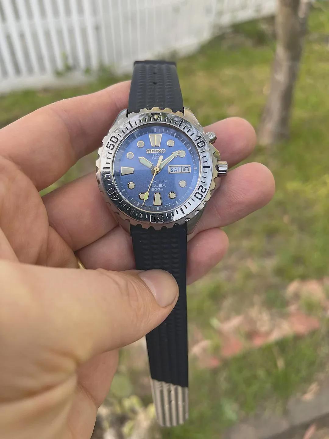 **Seiko 5M43-0010 SBBW047** Very rare and very handsome blue speckled dial diver, Ti monoblock case, 5M43 AGS quartz movement with new capacitor, in used by still sharp condition, though sadly it has been orphaned from its bracelet. Fortunately it looks and feels great on a waffle silicone strap with seiko style pin buckle. There is a teeny tiny pin prick mark on the dial at 1 o'clock, though with the metallic red flake finish on the blue it basically disappears. Also the seconds hand has been replaced with a mm300 style hand that matches the original lollypop style hands brushed finish. (original was bent when i received the watch from Japanese seller) A serious, low maintenance divers watch that looks awesome in Ti, blue and gold. Images, video and time stamp: [https://imgur.com/a/Hkx8sHb](https://imgur.com/a/Hkx8sHb) Ultra cheap at **$250 AUD ($155 USD) shipped anywhere**