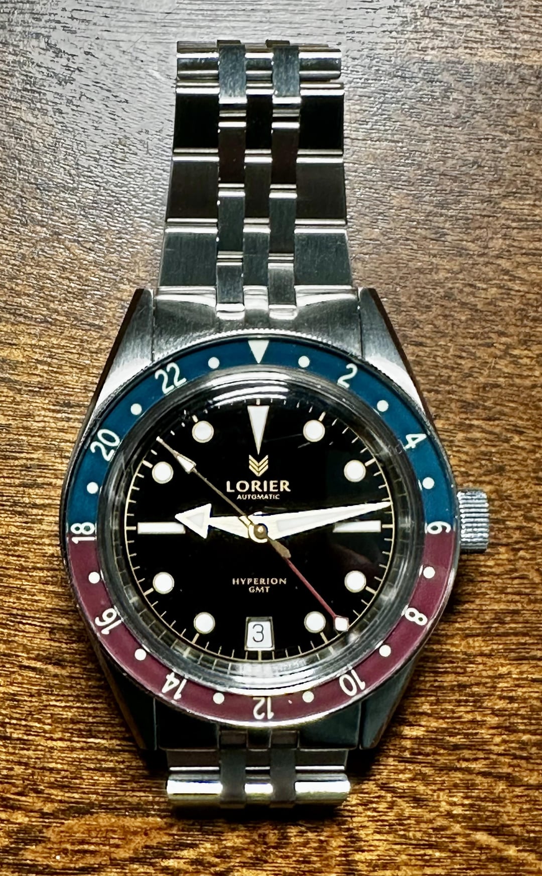 I bought this watch new in May 2024, directly from Lorier. These watches sell within minutes when a new batch is released. It has seen very little use (my collection is large and GMTs take the largest share). It is in excellent condition, with only one minuscule hairline scratch on the case size and a couple desk dive very small scratches on the clasp. Unless you buy new you will not find one in such good quality. **Asking $510 o.b.o. with free shipment to CONUS.** Comes with box, travel pouch, and screwdriver for bracelet adjustment. Please comment before sending a chat request. **Specifications** * Miyota 9075 automatic GMT movement (independent 12-hour hand) * Roulette datewheel (odd dates in black, even dates in red) * 316L marine-grade stainless steel case * Water resistant to 100 meters / 330 feet * 24-click bidirectional bezel * Screw-down crown * Dome Hesalite crystal * Hesalite bezel insert * Superluminova BGW9 luminous on dial, hour, minute, and seconds hands, C3 on bezel and GMT hand * 316L marine-grade stainless steel bracelet with solid endlinks * Fully-articulating solid links secured by screw pins * Push-button clasp with 3 microadjustment slots The details and story of the Lorier Hyperion can be found here: [https://www.lorierwatches.com/products/hyperion-sii](https://www.lorierwatches.com/products/hyperion-sii) The details and story of Lorier can be found here: [https://www.lorierwatches.com/pages/about-us](https://www.lorierwatches.com/pages/about-us)