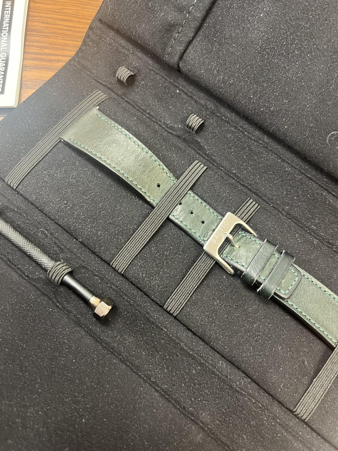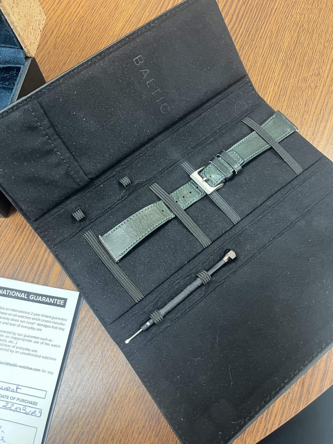 Selling my Baltic MR01 (silver dial) on flat link bracelet with extra Baltic green leather with green stitching. Condition is great. Very minimal wear. Please see pics. Some hairline swirls - but very little use. Includes box and papers plus extra strap box, pouch and tool. Two year warranty is expired. Retail is $687 $475 shipped CONUS only Zelle payment only.