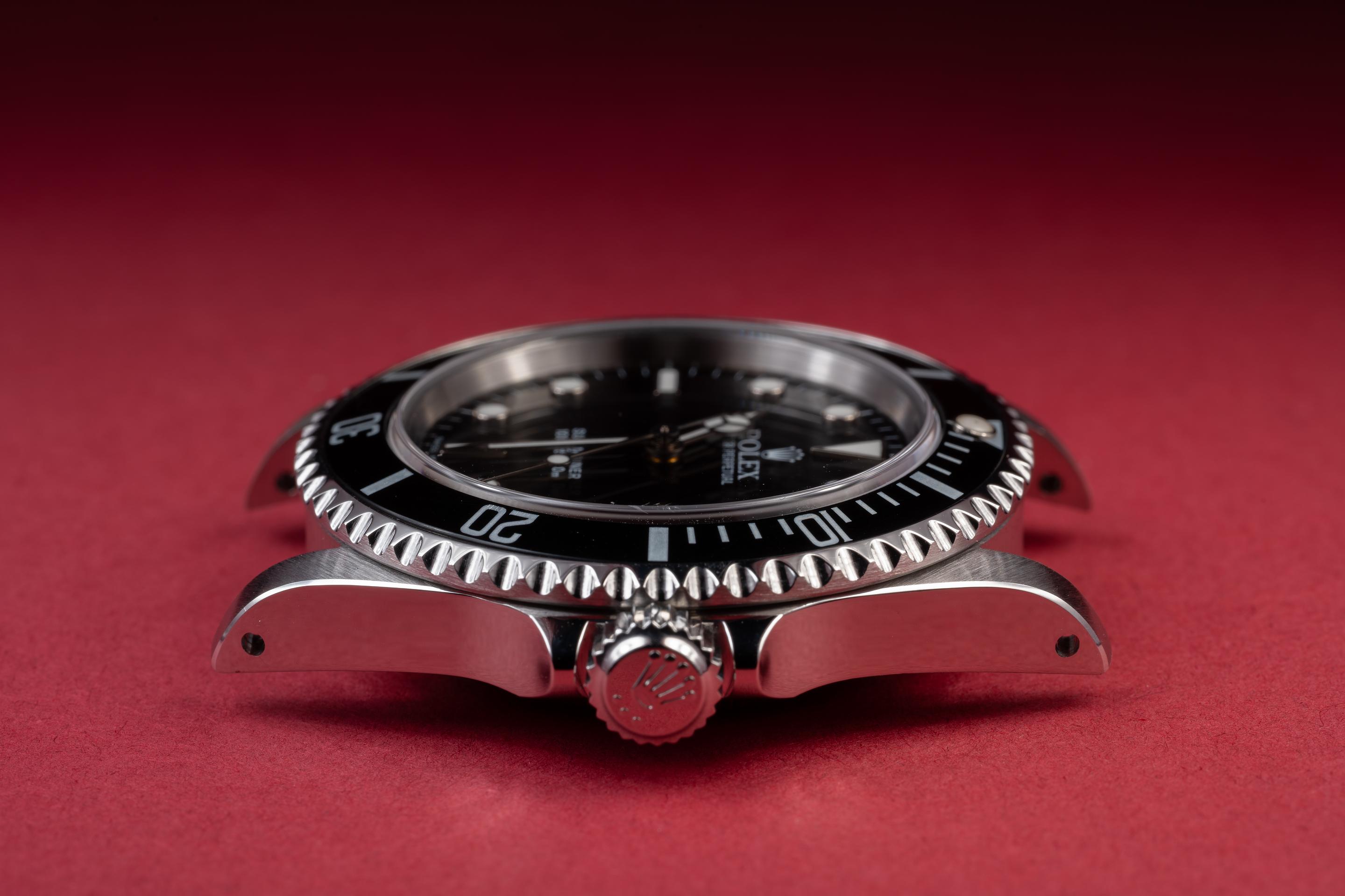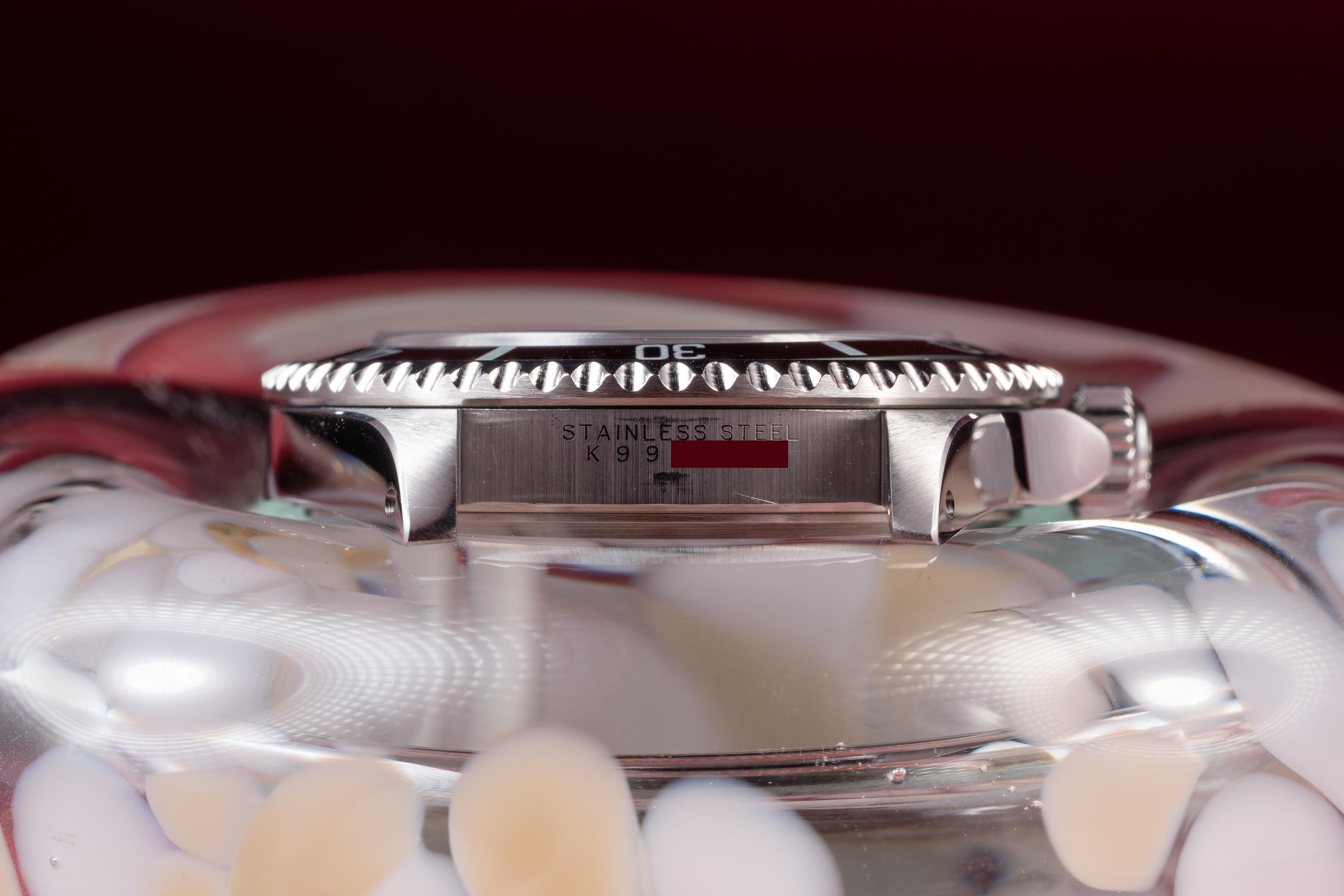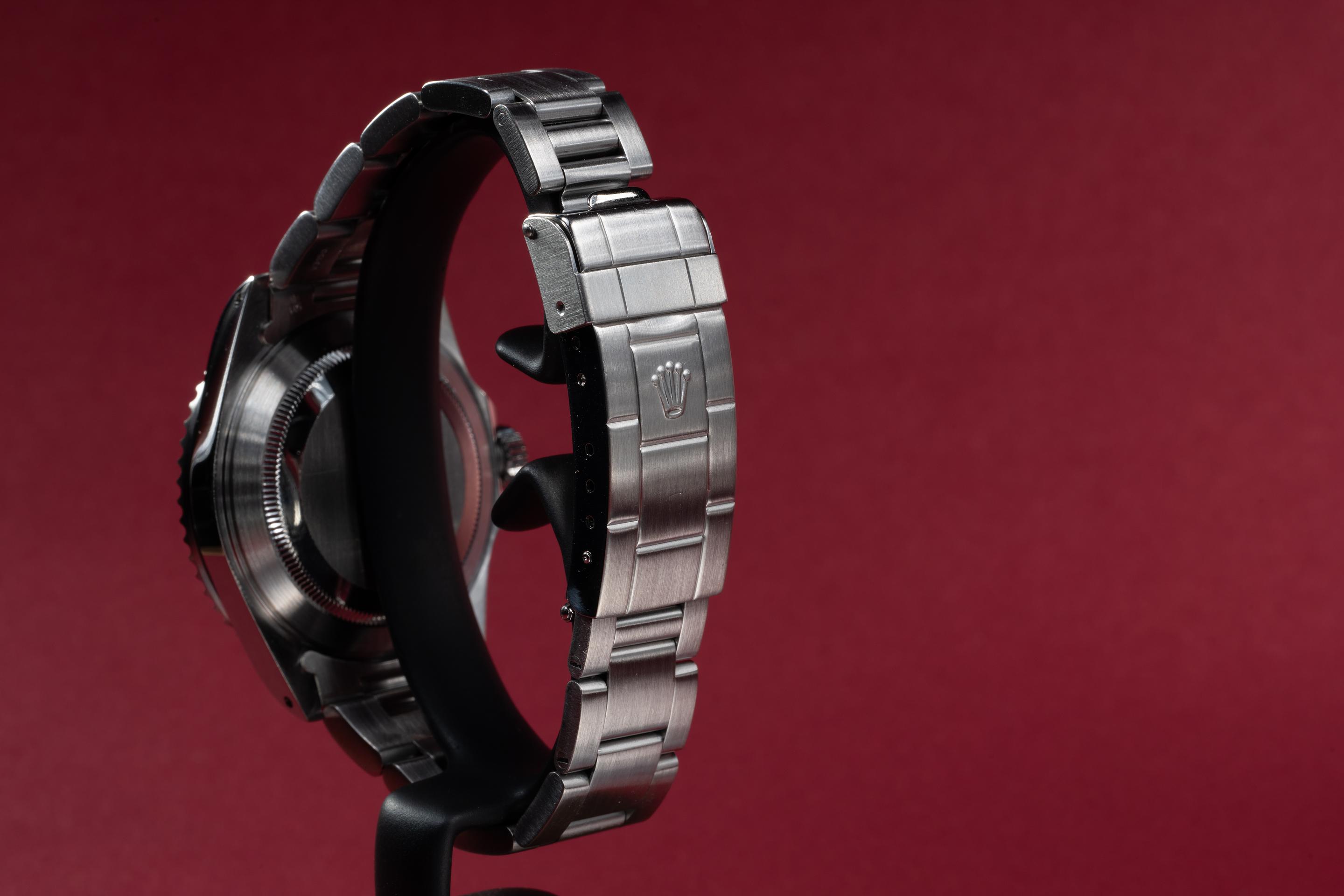 Description: Case: The thick and even case is excellent showing sharp prominent bevels and only light wear from use. Dial: The glossy black dial is excellent showing no visible wear. The original factory hands are matching. Bracelet: The 11 link Oyster bracelet is excellent showing only very light stretch for its age. The clasp is stamped with a matching 2000 date code. Accessories: Box and Papers.