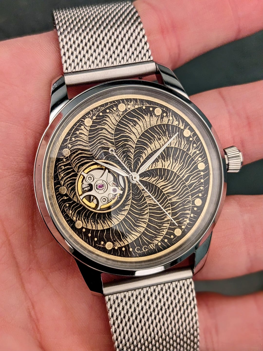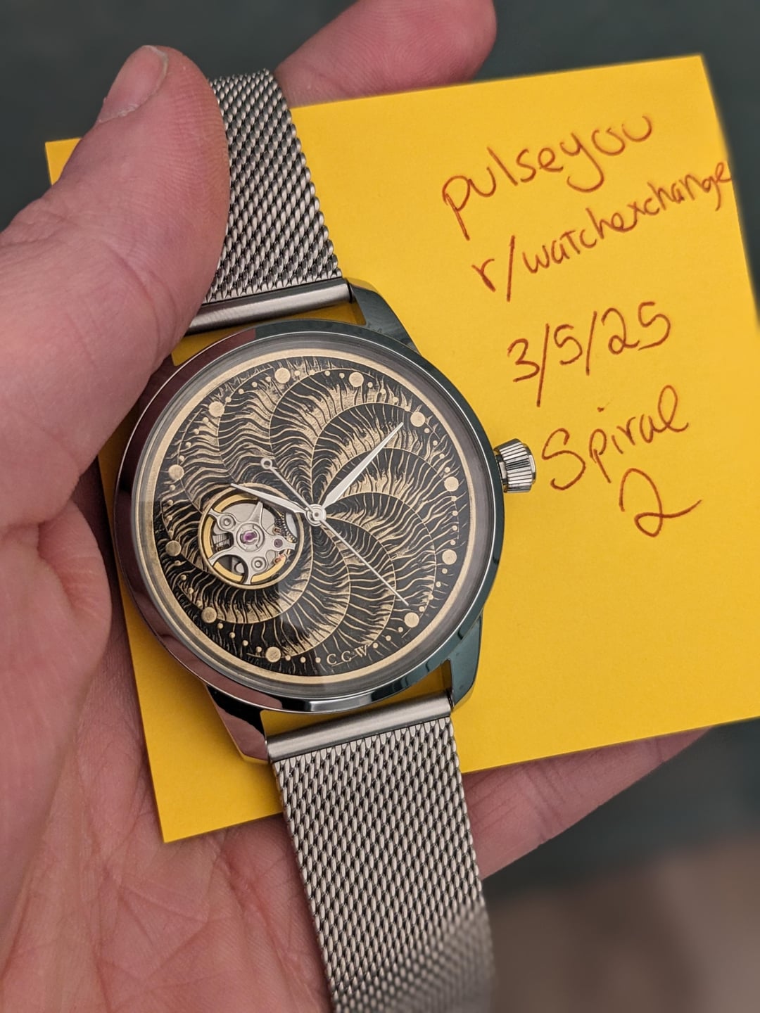 [Link to the dial being made.](https://www.instagram.com/reel/DFjQ9E1SztA/?utm_source=ig_web_copy_link&igsh=MzRlODBiNWFlZA==) [Link to Video, Images, Timestamp.](https://imgur.com/a/spiral-2-wLsZOD9) [Link to the Spiral 1.](https://www.instagram.com/p/DFiNn7SJ1_3/?utm_source=ig_web_copy_link&igsh=MzRlODBiNWFlZA==) Good morning and happy Saturday. Thank you for browsing my watch sale. Today we have a brand new (and 1st edition) CCW "Spiral 2." This dial made by me on my 50w fiber laser. It has 256 layers to create a 3d effect on the dial, cut out of a 0.5mm sheet of jeweler's bronze and then hand finished with Brass Black, Polish, and Renaissance Wax. The dial is 35mm which is a gorgeous size, a standard dial is 28.5mm so this dial is about 50% bigger. I have housed the dial in a 39mm dress watch case and it runs on a new NH38 automatic movement, with the "open heart" near the 3 o clock marker. The watch features an open caseback with a gold adorned rotor. This watch is available on a fine mesh milanese bracelet or a leather strap (black, brown, green black). ***\*All of my watches are completely customizable so if you would like to change anything about the watch please shoot me a message and would be happy to create something custom to fit your needs, or customize this dial further.*** **Specs** Case Size: 39mm stainless steel dress case. Bracelet: Superfine mesh Strapcode high quality bracelet Strap: Sleek 20mm leather strap with steel buckle. Dial: Custom designed, lasered, and hand finished 35mm dial featuring a a spiral pattern and displaying the nh38 open heart. Movement: NH38 Seiko Movement w/ 41+ hour power reserve, hacking, 24 Jewels, Open caseback with adorned rotor. 12.5mm Thickness Comes with a travel watch pouch for safekeeping **Condition** Everything is brand new and ready to be shipped. Watch was custom-built by me to the highest quality. Message me if you have any questions. **Asking** $299 shipped to CONUS on a leather strap, 330 shipped on the milanese bracelet. Will ship to other countries please contact me with location and I'll see what I can do. Payment via Venmo, Zelle, Cashapp, or Paypal+3%. [Other Custom Watches on my IG](https://www.instagram.com/cacustomwatches/)