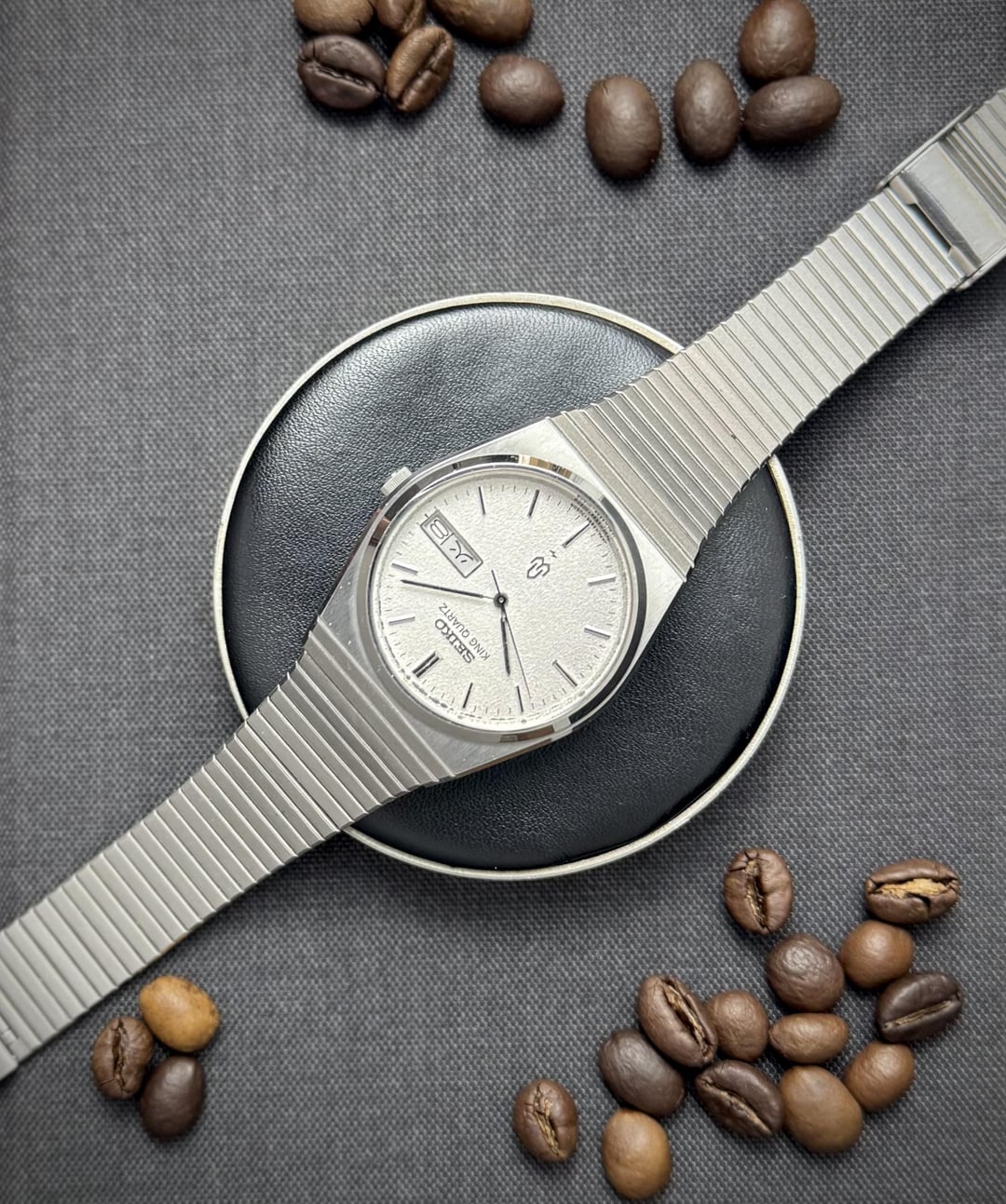 Up for sale is a very beautiful Seiko King Quartz with snowflake dial ref. 5856-7040. This watch has all original parts and it is in excellent condition. 🗓️ April 1978. 📐 Size 34mm. 👉 Details: - the watch has all original parts and it is in excellent condition. - original and beautiful snowflake dial. - original crystal. - sharp unpolished ss case. - day/date calendar at 3o’clock, quick set works (English and Japanese kanji). - original crown. - original ss bracelet. 💶 Price: The price of € 200 includes worldwide shipping. 🤝 Payment method: PayPal F&F, Wise, Western Union. 📨 Let’s chat: Additional pictures and videos are available in dm. I invite you to chat with me if you like this watch. 🙏 Please follow my Instagram for more: https://www.instagram.com/gabe_watch/