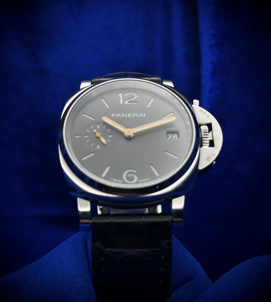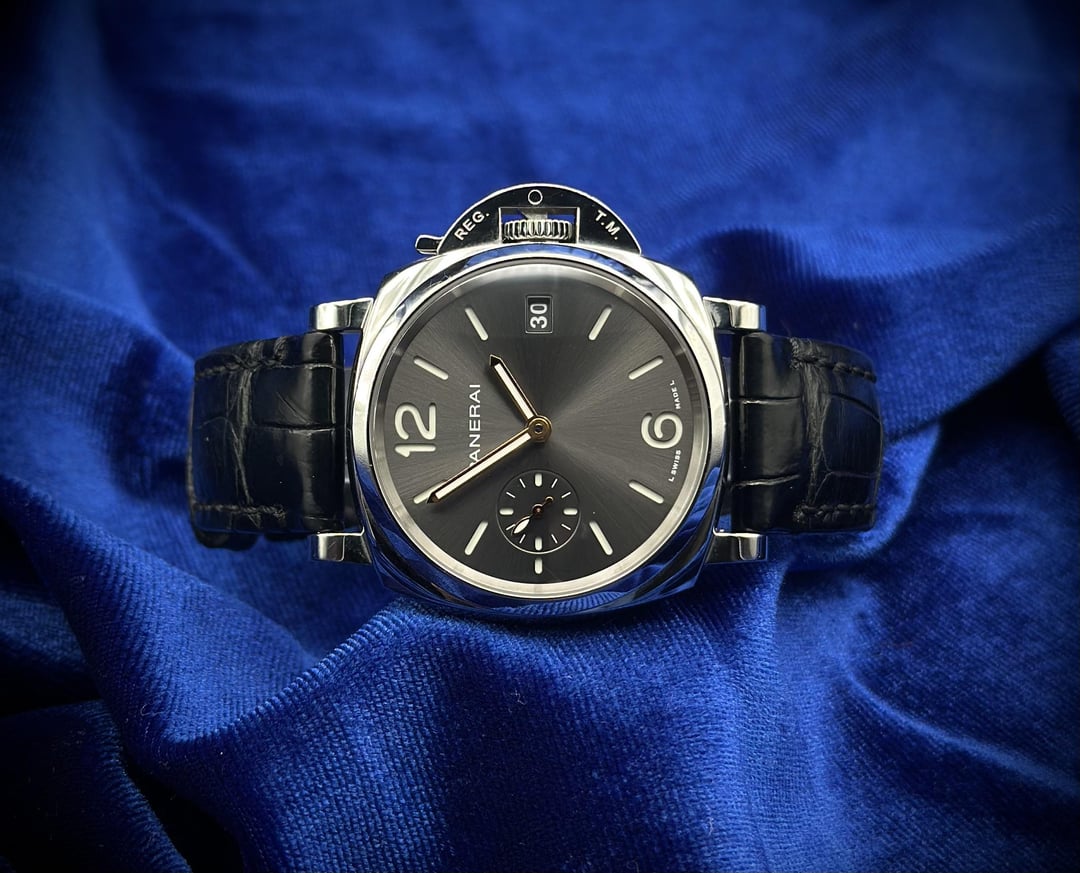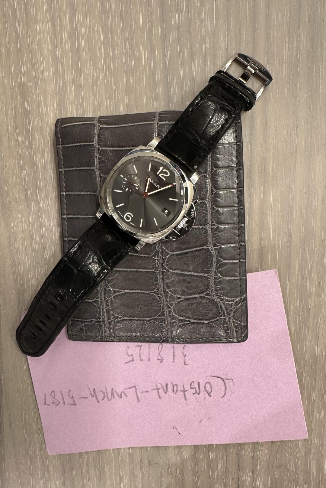 THIS! Is a Panerai Luminor Due PAM01247, a sophisticated 38mm timepiece that seamlessly blends classic Italian design with Swiss watchmaking excellence The stunning anthracite sun-brushed dial is adorned with luminous Arabic numerals and hour markers, ensuring exceptional readability in all lighting conditions. A date window at 3 o’clock and the iconic small seconds sub-dial at 9 o’clock add both functionality and balance to the design. Powering the PAM01247 is the automatic P.900 caliber movement, offering an impressive three-day power reserve. Completing the look is a stylish black alligator leather strap, secured with a polished steel pin buckle, adding a modern contrast to the timeless design. quick change strap system is also a complete game changer for completing changing the look of the watch within seconds. This PAM01247 is a full set in great condition ready for your wrist. Please do ignore dust that may show in photography.. Price - $4999 insured USA shipping included! We do offer a buyback program, if anytime within 1 year you want to trade up from any watch bought from us we offer only 9% off original sale price, meaning you could enjoy this Panerai for example for up to a year for a cost of ownership of only $450 dollars(As long as the watch still has the original contents from the sale of the watch and is still in similar condition to when it was sold). Found online as WatchesbyKing anywhere! Please do reach out with any questions, offers, or inquiries!