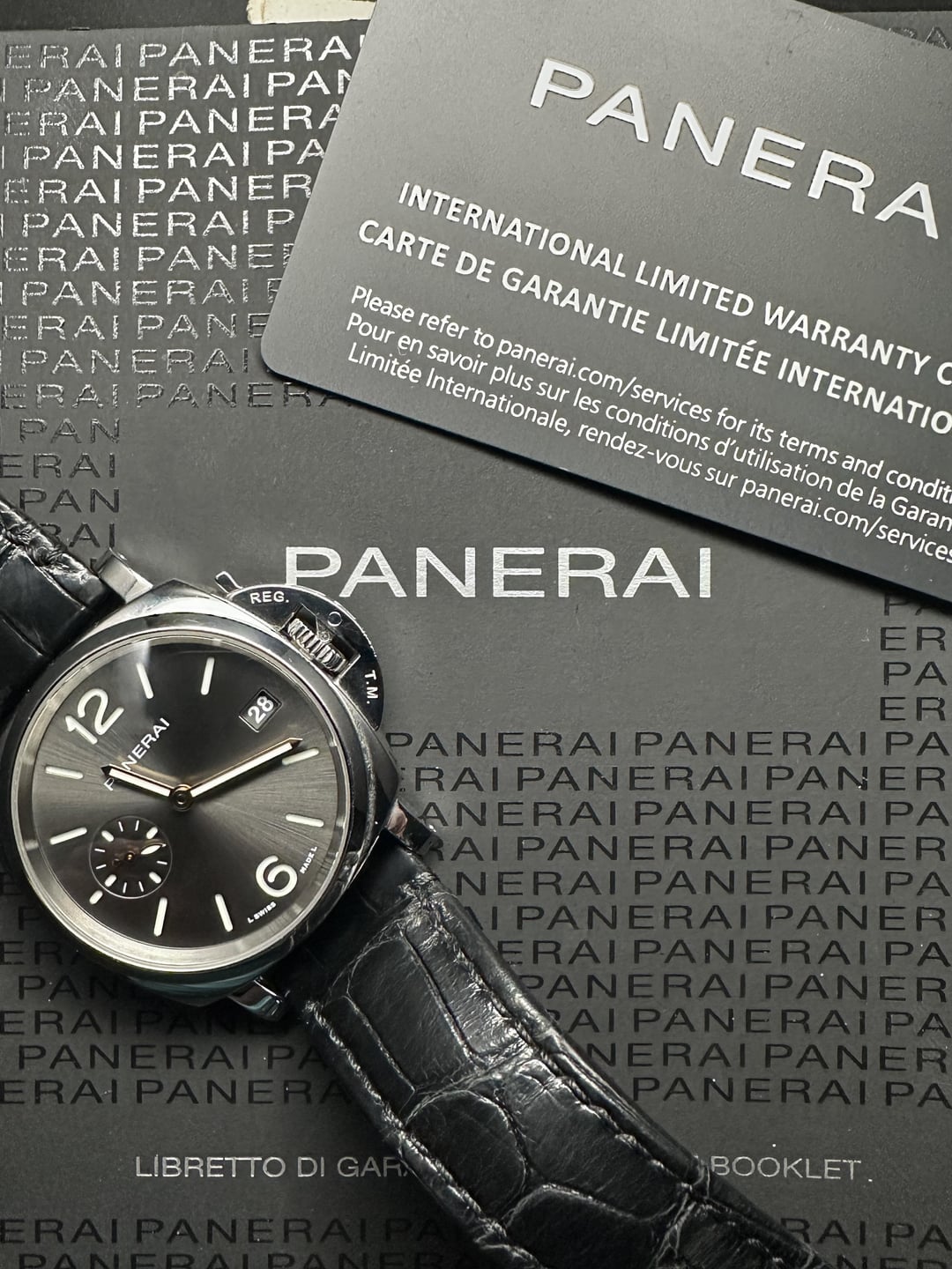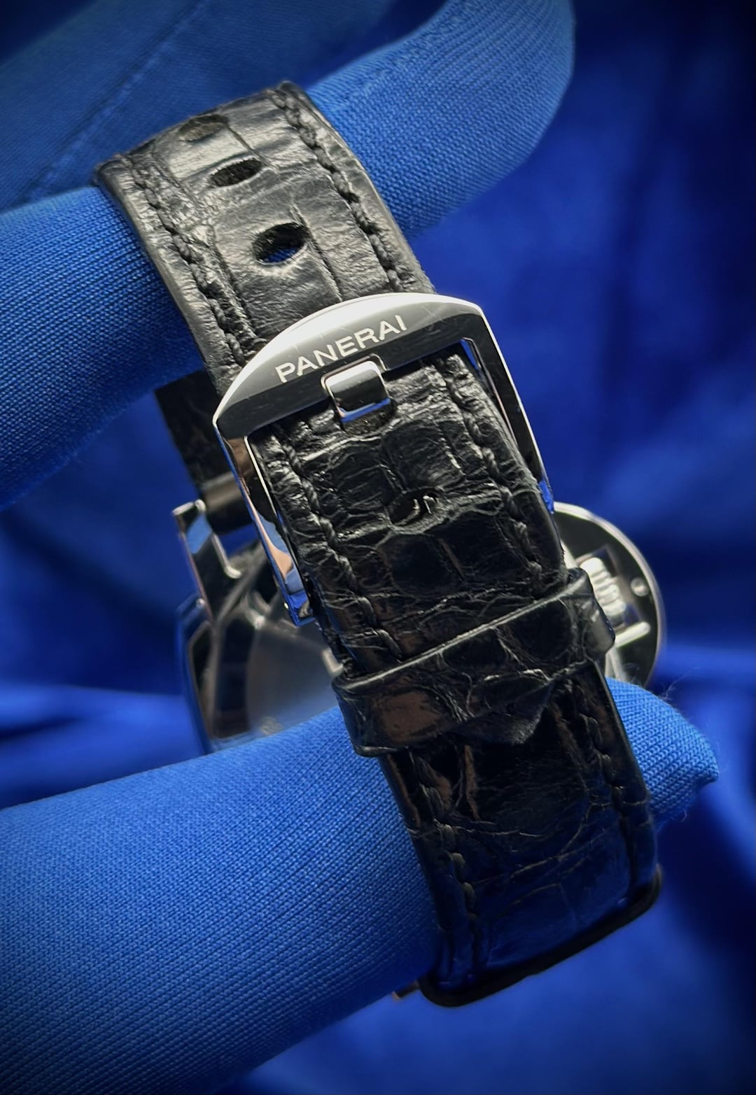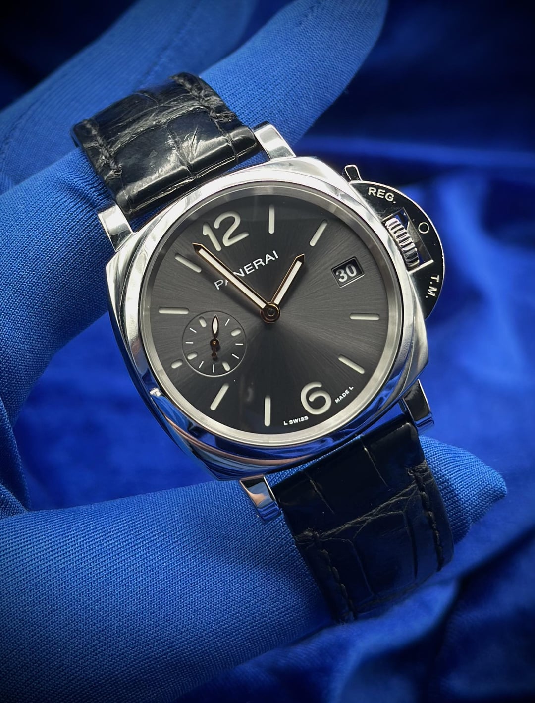 THIS! Is a Panerai Luminor Due PAM01247, a sophisticated 38mm timepiece that seamlessly blends classic Italian design with Swiss watchmaking excellence The stunning anthracite sun-brushed dial is adorned with luminous Arabic numerals and hour markers, ensuring exceptional readability in all lighting conditions. A date window at 3 o’clock and the iconic small seconds sub-dial at 9 o’clock add both functionality and balance to the design. Powering the PAM01247 is the automatic P.900 caliber movement, offering an impressive three-day power reserve. Completing the look is a stylish black alligator leather strap, secured with a polished steel pin buckle, adding a modern contrast to the timeless design. quick change strap system is also a complete game changer for completing changing the look of the watch within seconds. This PAM01247 is a full set in great condition ready for your wrist. Please do ignore dust that may show in photography.. Price - $4999 insured USA shipping included! We do offer a buyback program, if anytime within 1 year you want to trade up from any watch bought from us we offer only 9% off original sale price, meaning you could enjoy this Panerai for example for up to a year for a cost of ownership of only $450 dollars(As long as the watch still has the original contents from the sale of the watch and is still in similar condition to when it was sold). Found online as WatchesbyKing anywhere! Please do reach out with any questions, offers, or inquiries!