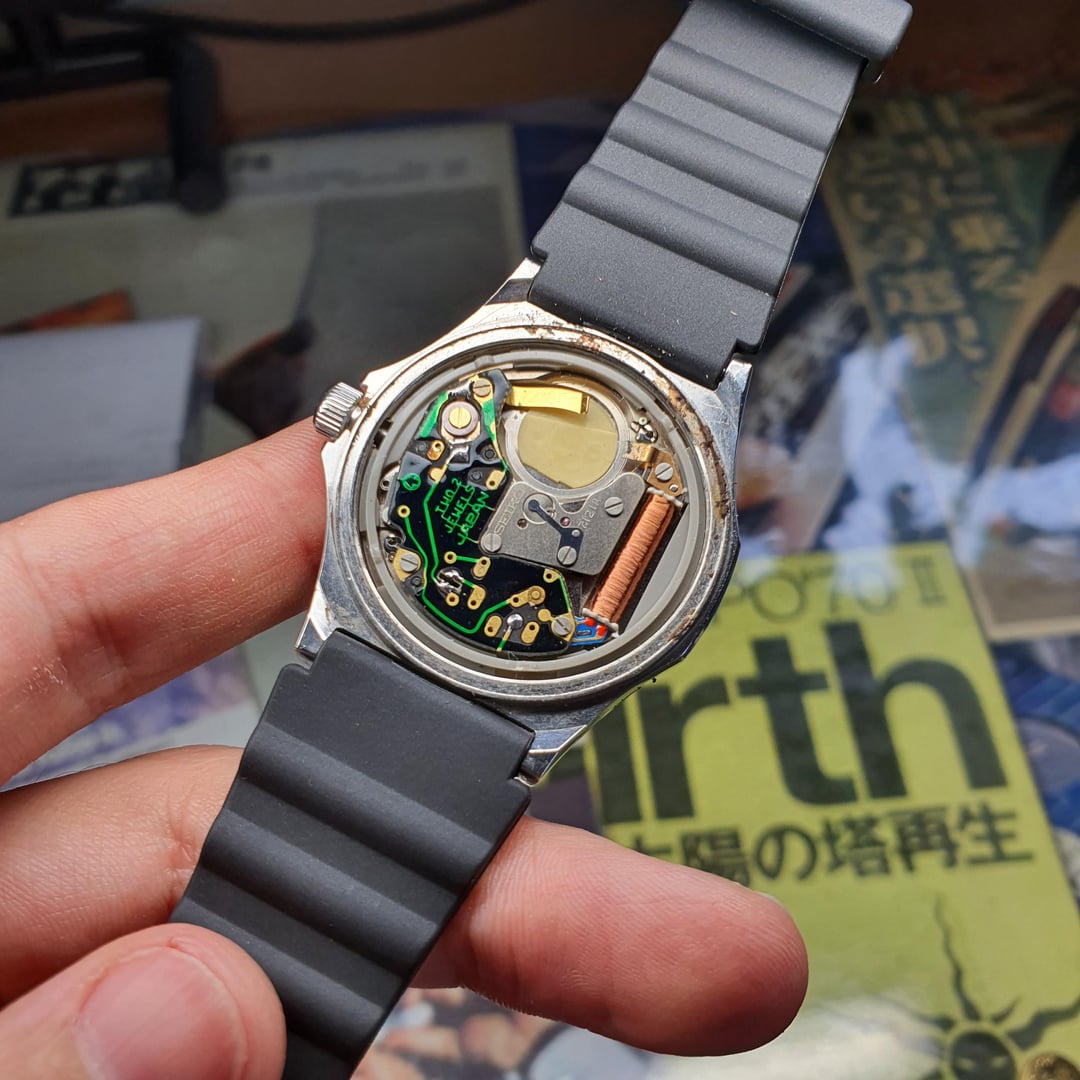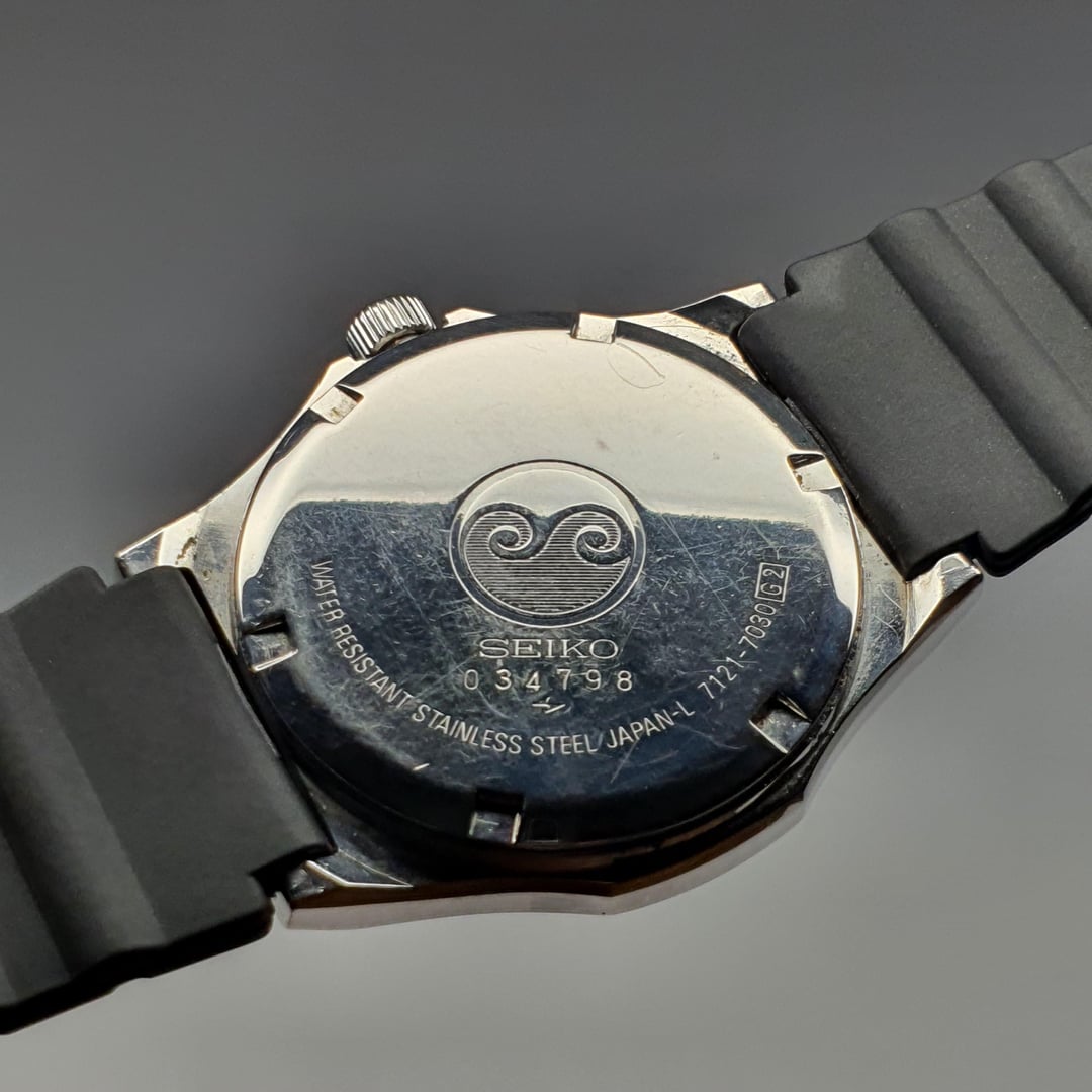 For sale is this vintage Seiko Silver Wave 7121-7030, made in Japan, in March of 1980. The Silver Wave series by Seiko has a cult following as they were only released for the Japanese domestic market and the Silver Wave series goes back to the 60s with some of Seiko's very first dive watches. This example has a unique and beautiful "desert storm" tropical patina to the dial that doesn't affect any of the print, markers or hands. On the dial is also an applied Seiko logo, an applied single crystal quartz logo, printed Silver Wave logo and Daini factory logo (during their fierce rivalry between the Suwa factory). It features a screw-down crown and the bezel is widened at the left and right edges for visual interest. The hands and indices are polished with a painted black middle. The 7121 movement is beautiful too and quality built as were many early quartz movements compared to now and the seconds hand hits all the markers. The watch is in good condition with some general wear as expected for a 45-year-old watch, some small scratches on the crystal but the scratches on the watch and crystal are more visible in the pictures compared with in real life. The finishing is original and intact. Paired with a brand new JDM Bambi strap. Dimensions are: 35mm x 40mm x 8.7mm Lug Width 18mm Looking for $165 shipped (Buyer pays Paypal fees) Bought in Japan. More pics: [https://flic.kr/s/aHBqjC5iJ4](https://flic.kr/s/aHBqjC5iJ4) \*Returns accepted but return postage costs are the buyer's responsibility.